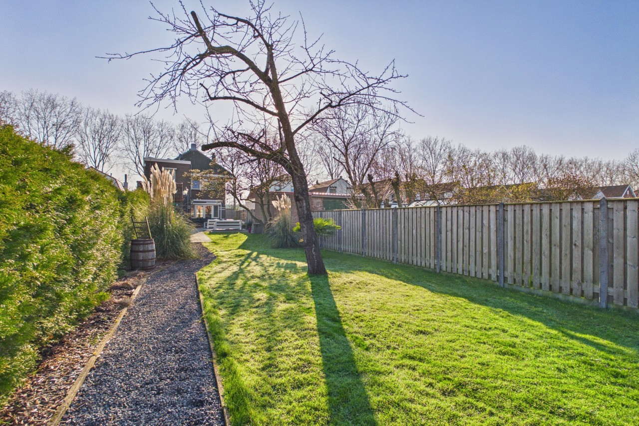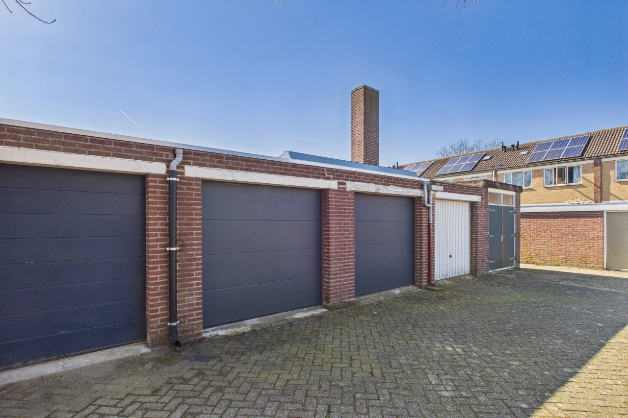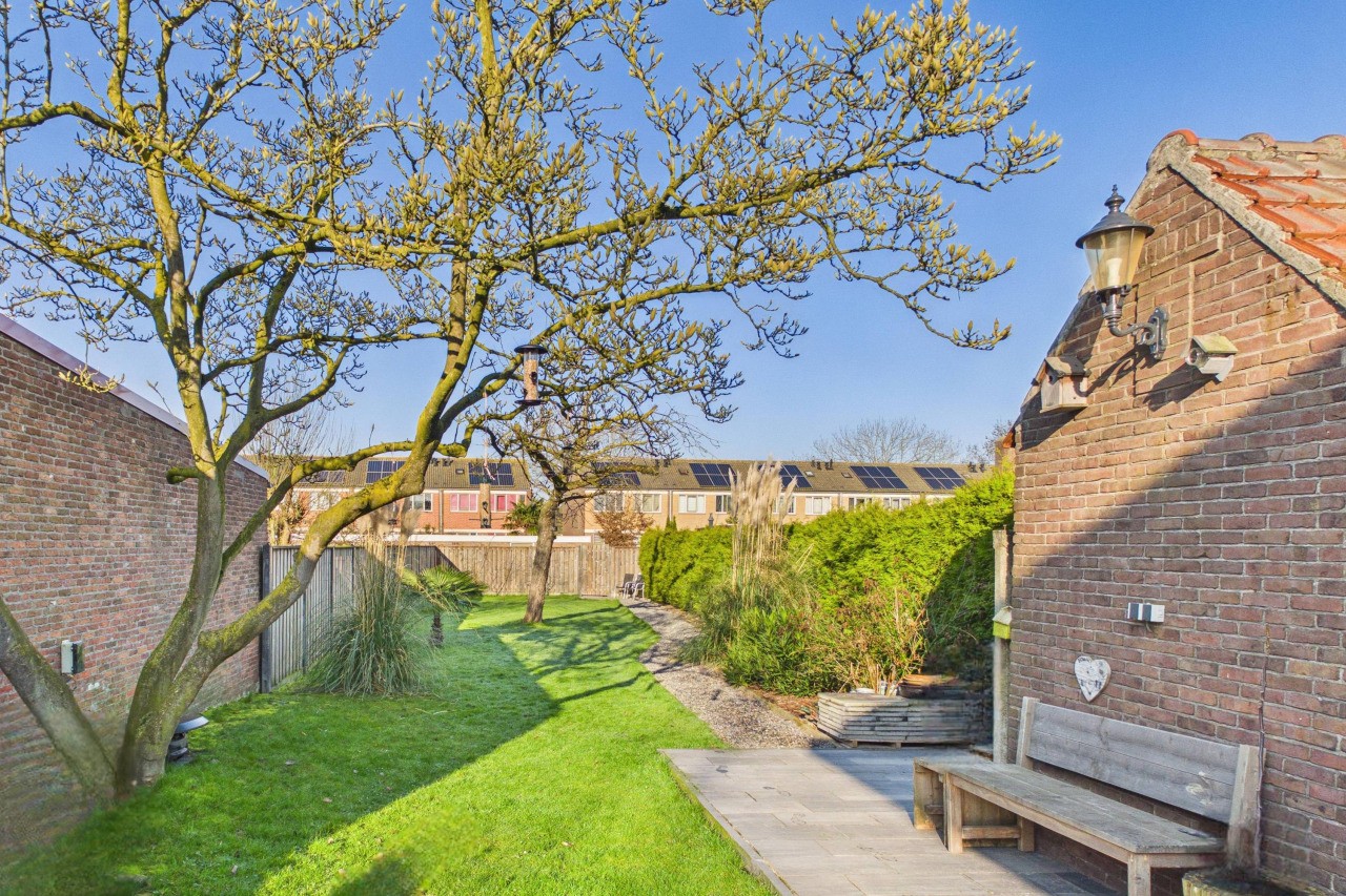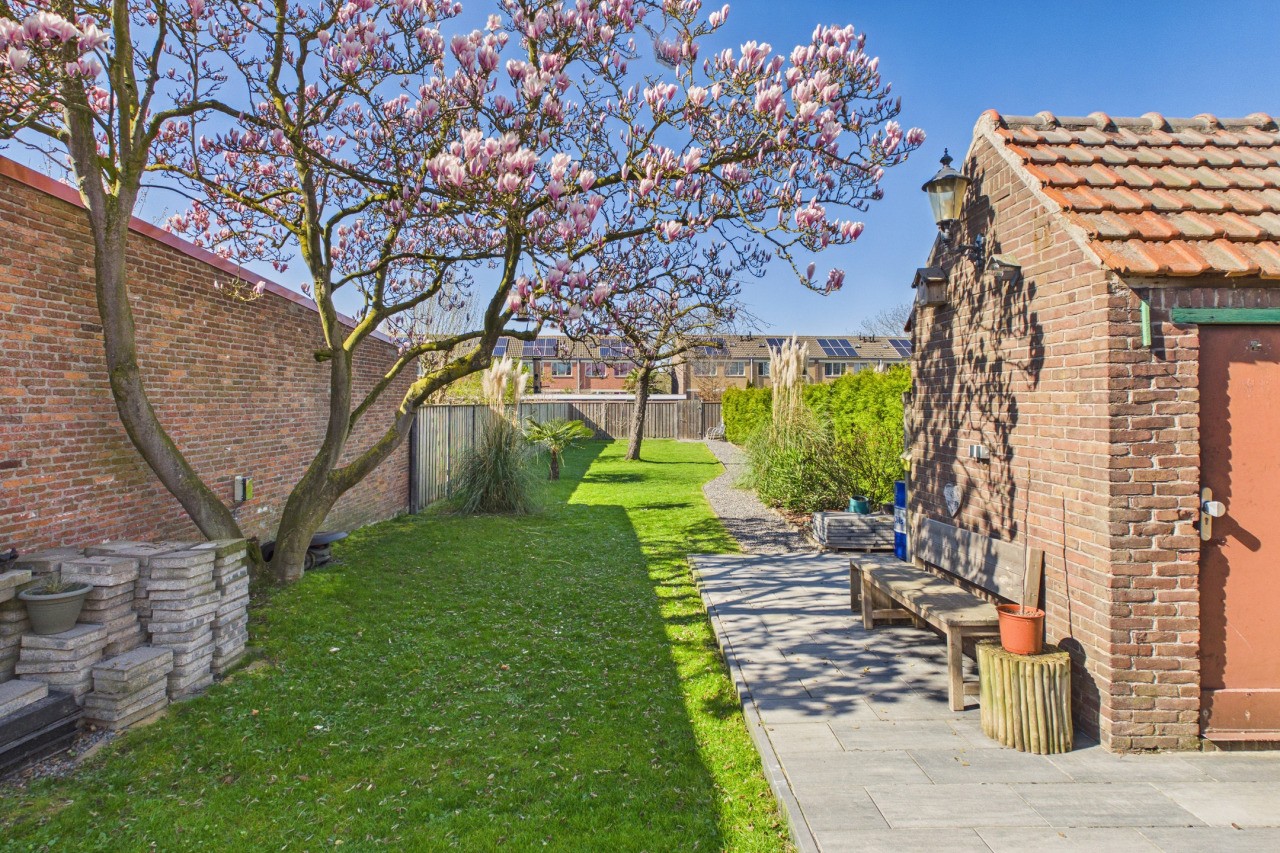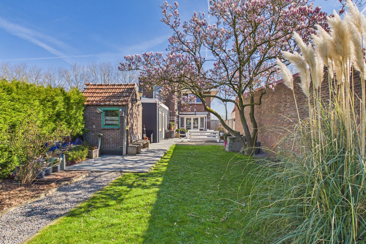 De achtertuin is diep en zonnig en vormt een natuurlijk verlengstuk van de woning. Het terras direct achter de woning nodigt uit om te ontspannen of buiten te eten, terwijl het gazon en de groene elementen een rustige en open uitstraling geven. Dankzij de vrije achterom is de tuin ook praktisch bereikbaar, en er is volop ruimte om te spelen, te tuinieren of gewoon van het buitenleven te genieten. De woning beschikt daarnaast over een dubbele, stenen garage met elektrisch bedienbare sectionaaldeuren, groot genoeg voor twee auto’s, wat extra gemak en opslagruimte biedt.