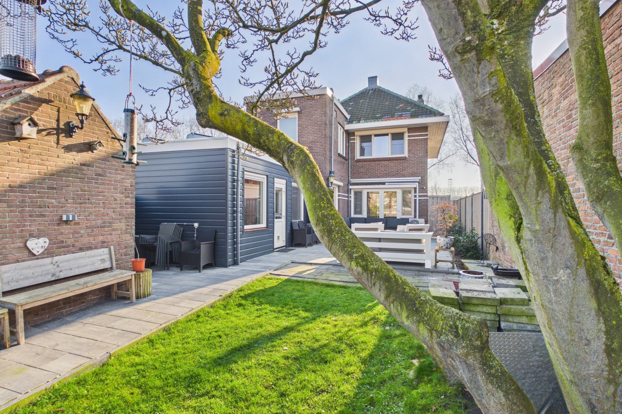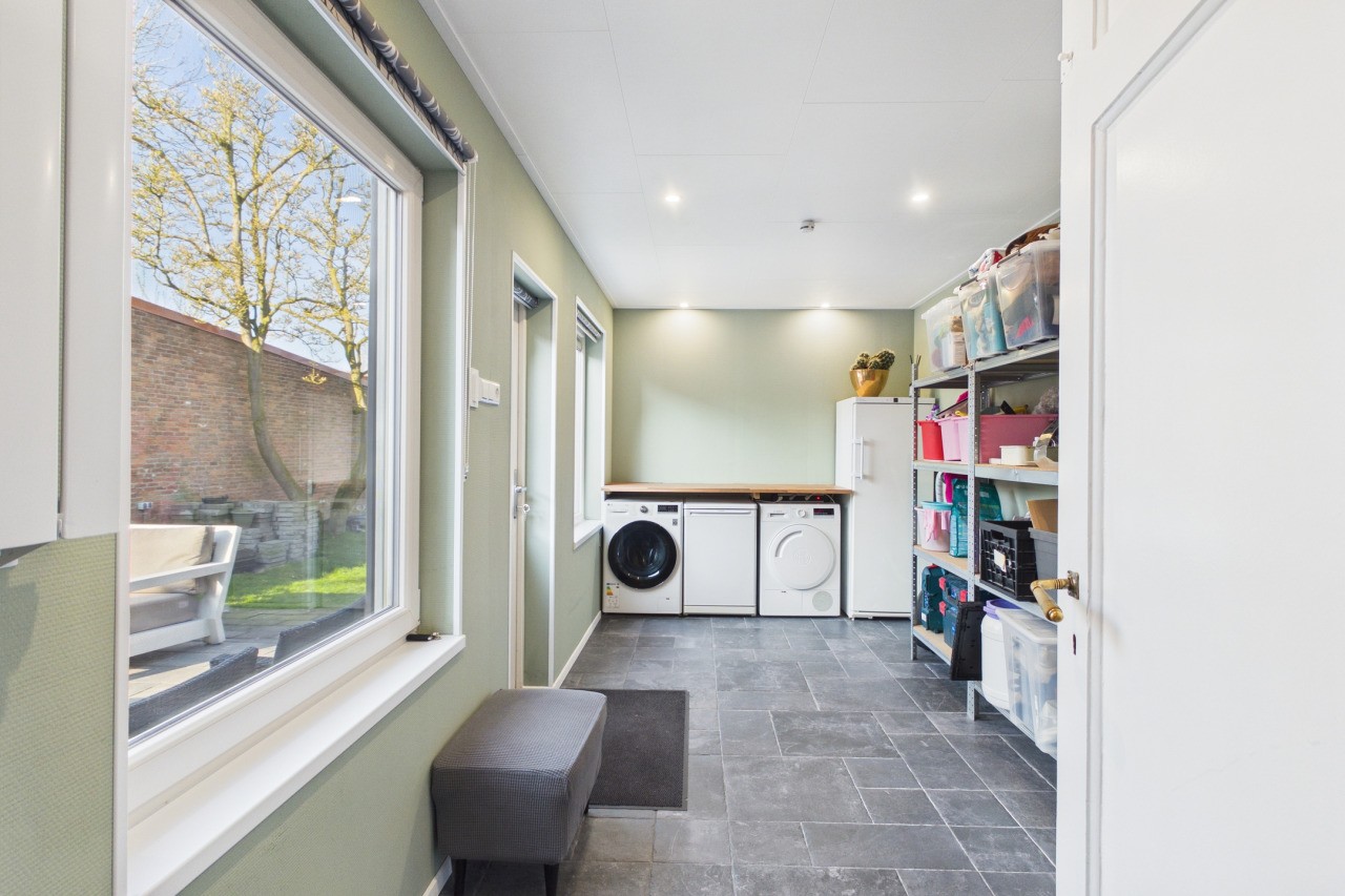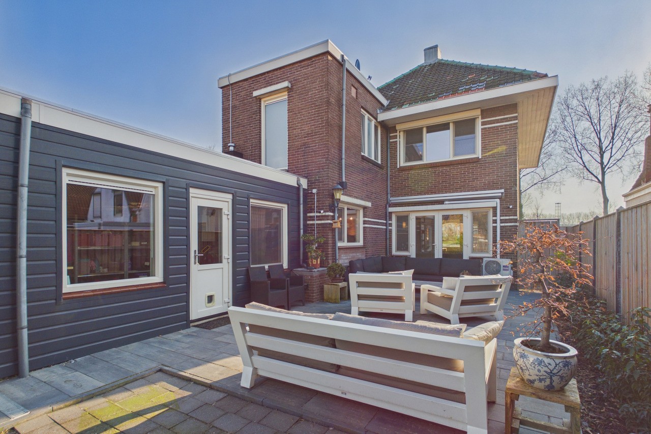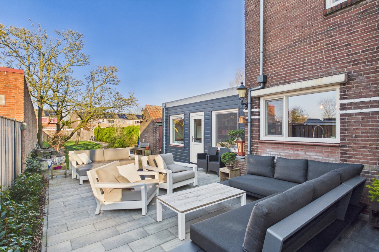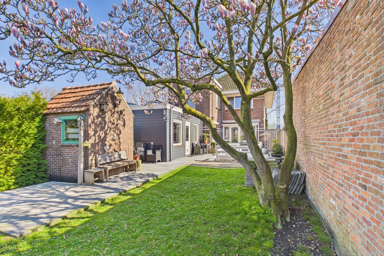 De achtertuin is diep en zonnig en vormt een natuurlijk verlengstuk van de woning. Het terras direct achter de woning nodigt uit om te ontspannen of buiten te eten, terwijl het gazon en de groene elementen een rustige en open uitstraling geven. Dankzij de vrije achterom is de tuin ook praktisch bereikbaar, en er is volop ruimte om te spelen, te tuinieren of gewoon van het buitenleven te genieten. De woning beschikt daarnaast over een dubbele, stenen garage met elektrisch bedienbare sectionaaldeuren, groot genoeg voor twee auto’s, wat extra gemak en opslagruimte biedt.