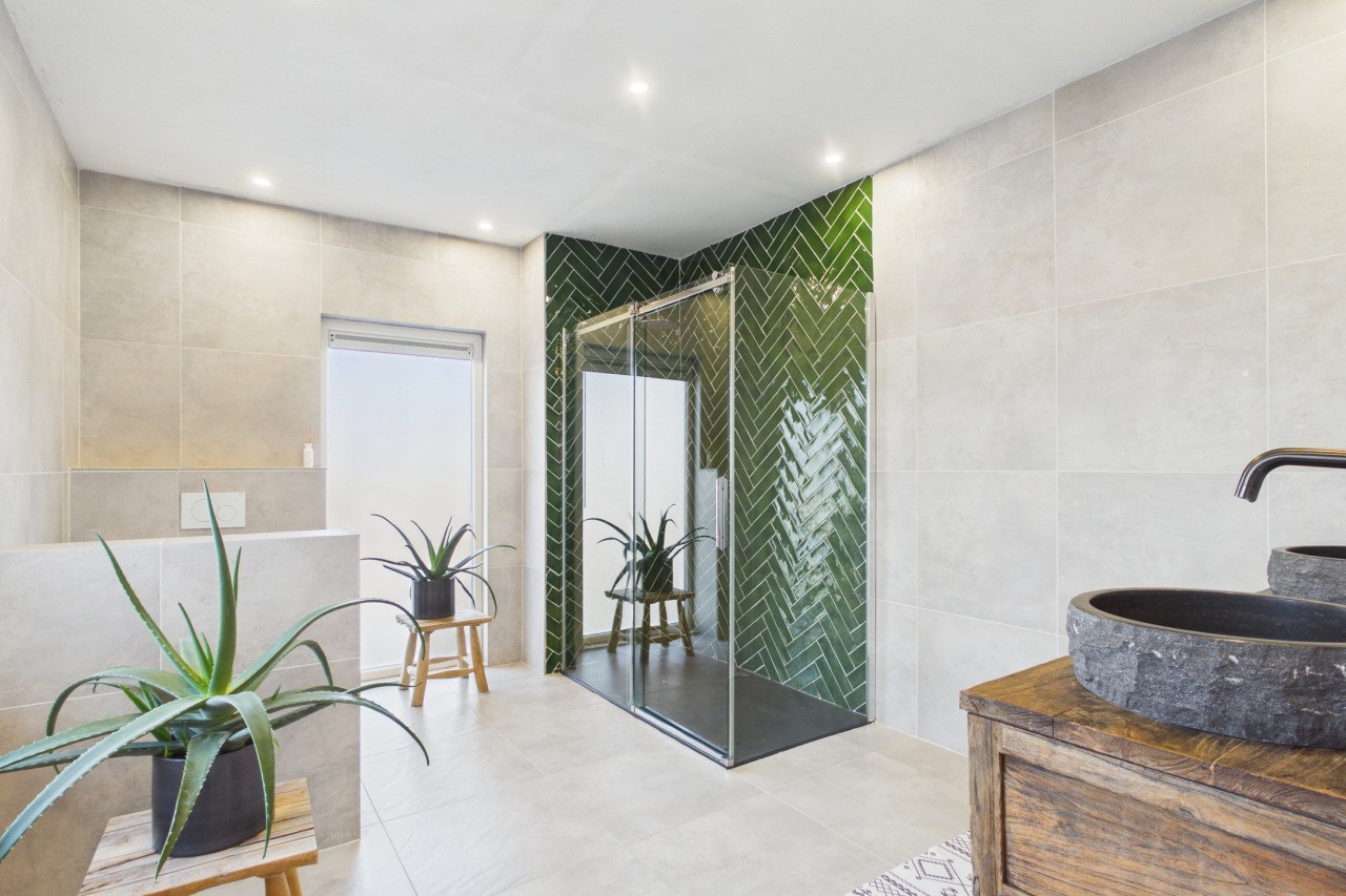 De eerste verdieping biedt drie slaapkamers, allen voorzien van rolluiken, waarvan twee voorzien van een vaste kast en de ouderslaapkamer is voorzien van airconditioning. De luxe badkamer is uitgevoerd met een inloopdouche, dubbele wastafel met meubel en vrijhangend toilet. Alles is modern afgewerkt met oog voor comfort en uitstraling.