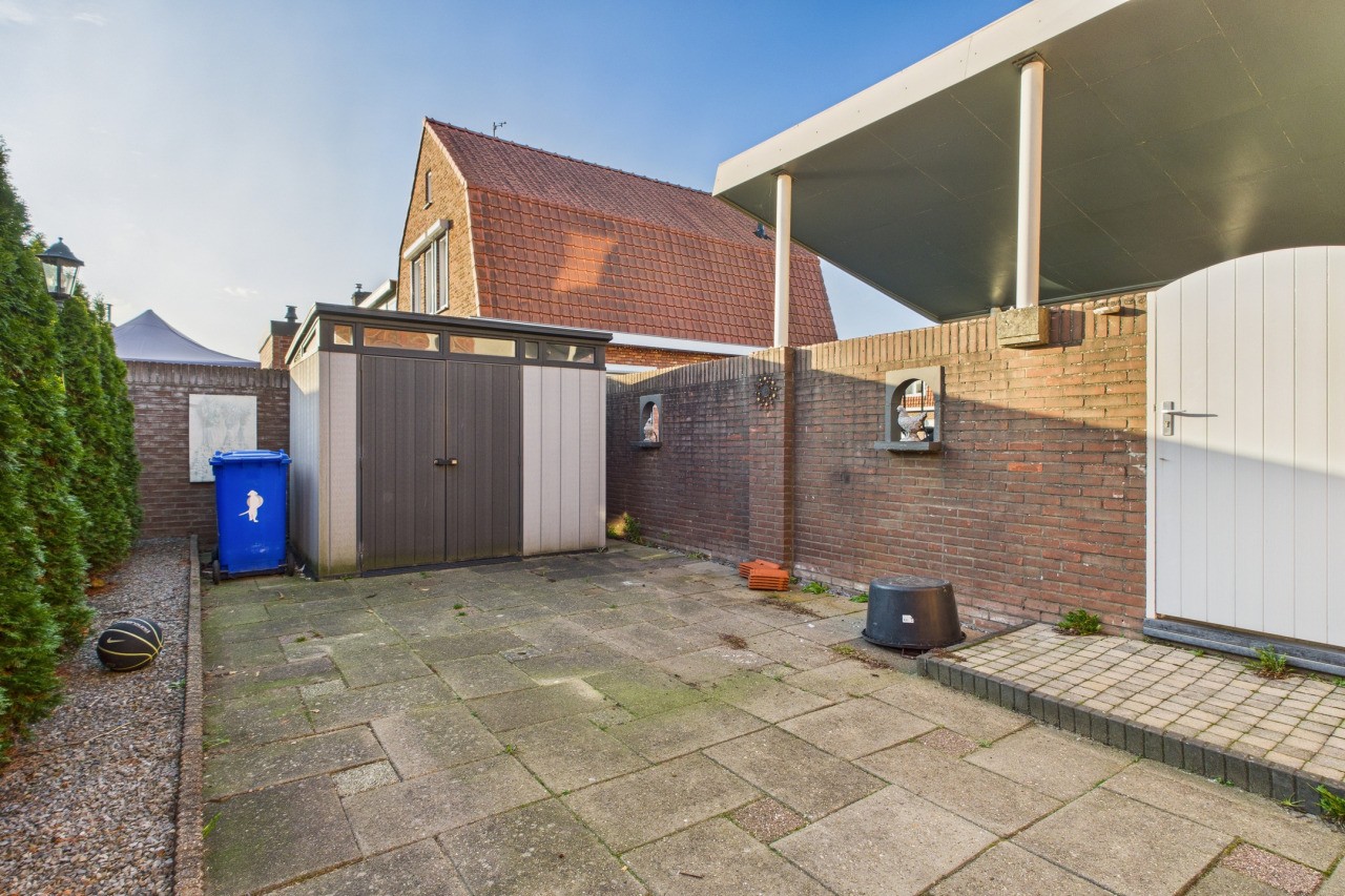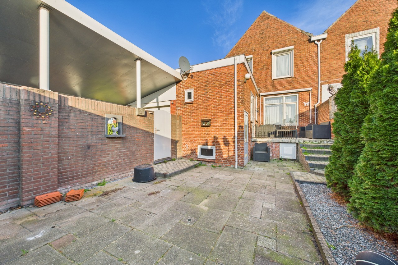 De tuin is onderhoudsvriendelijk aangelegd en biedt aan de achterzijde een heerlijk terras op het westen, waar je tot in de avond van de zon kunt genieten. Vanuit de tuin is ook de kelder/berging bereikbaar, ideaal voor extra opslag. Naast de woning bevindt zich een handige oprit met parkeerplaats, carport en een ruime garage, wat het geheel bijzonder praktisch maakt.