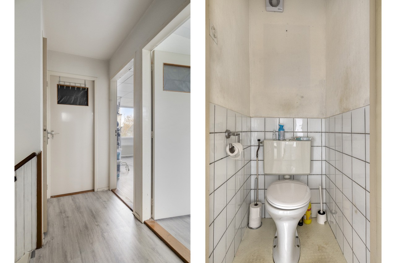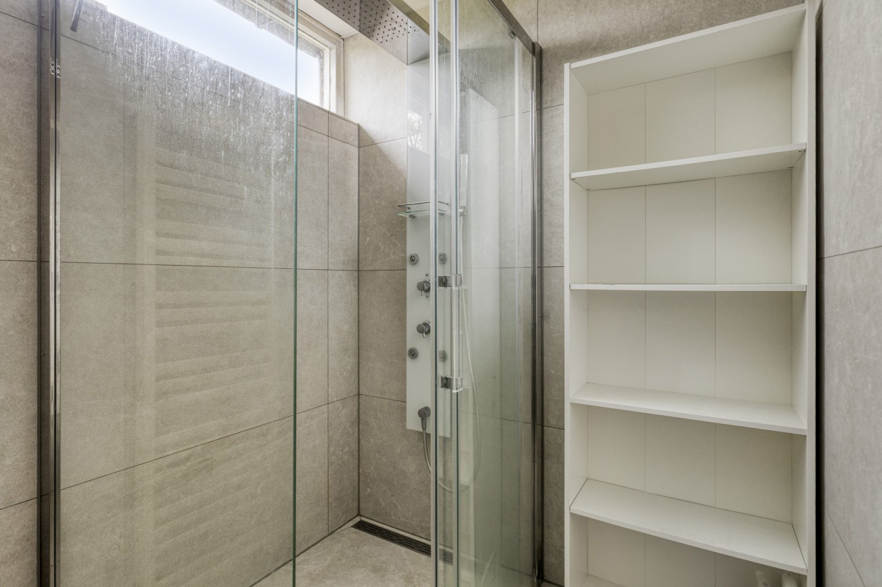 Overloop met vaste trap naar de tweede verdieping, separaat toilet en toegang tot 3 comfortabele slaapkamers en de badkamer. De badkamer is slechts drie jaar oud en is uitgerust met een moderne inloopdouche (regendouche met massagemogelijkheden), een wastafel met meubel en een designradiator.