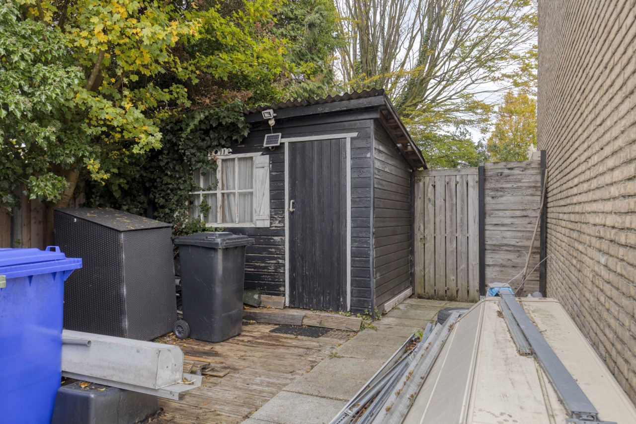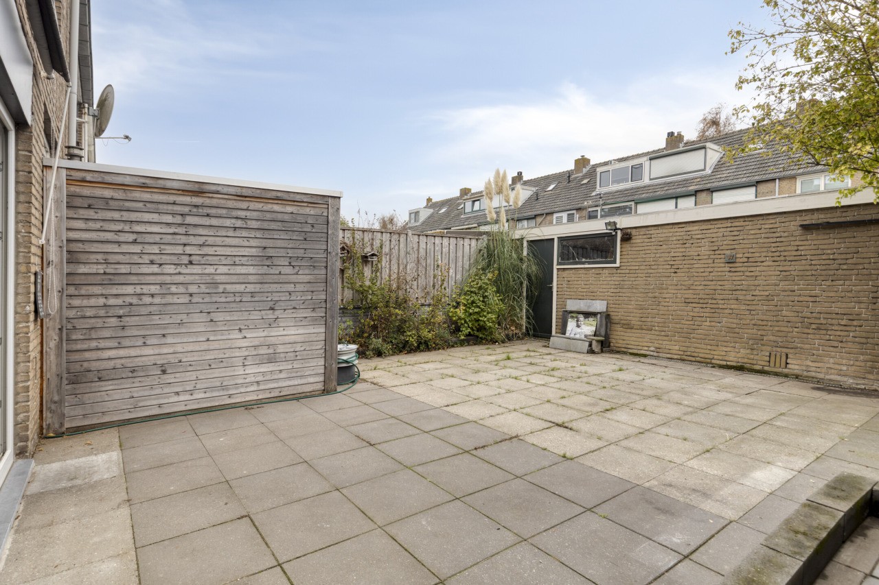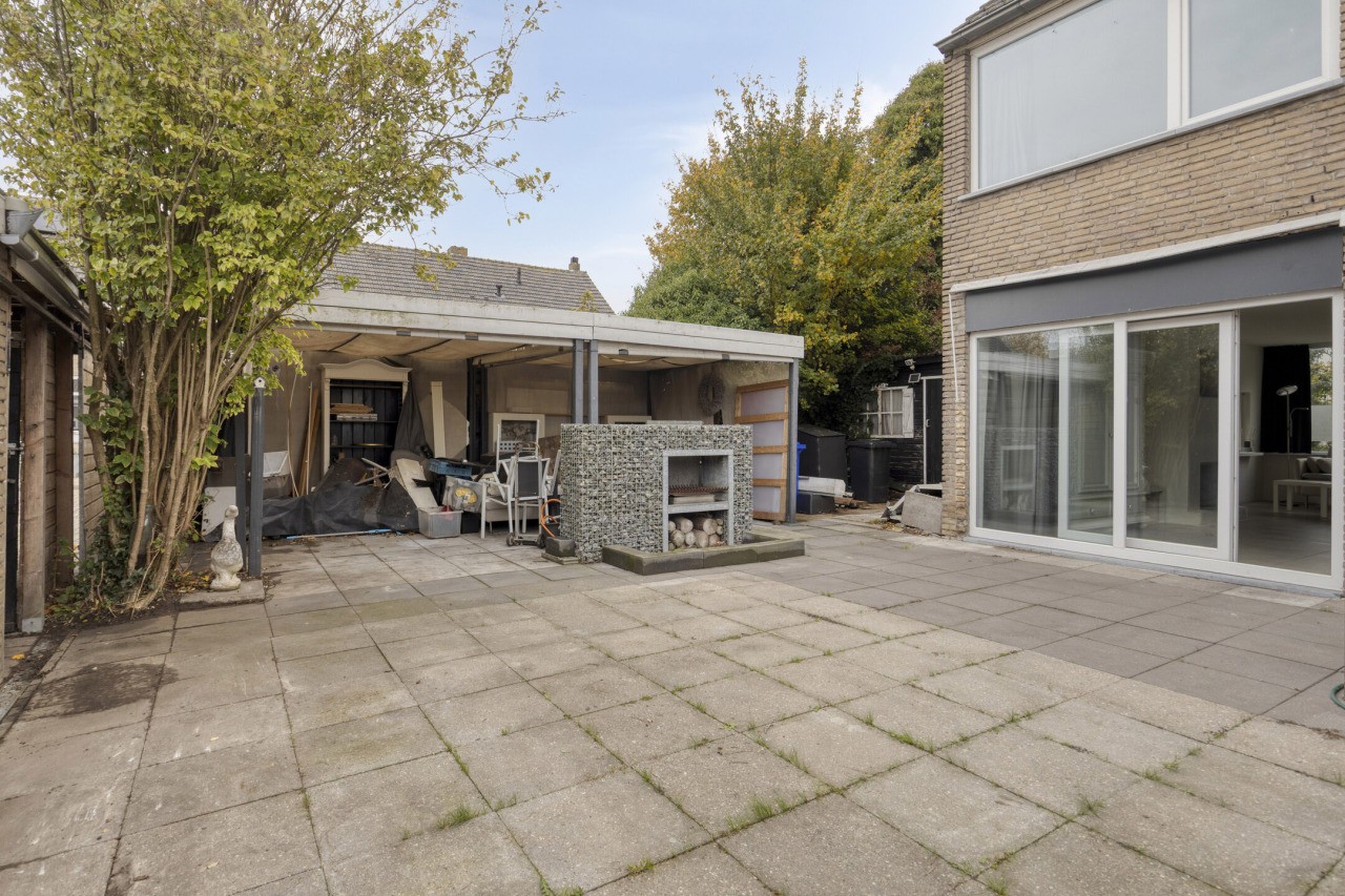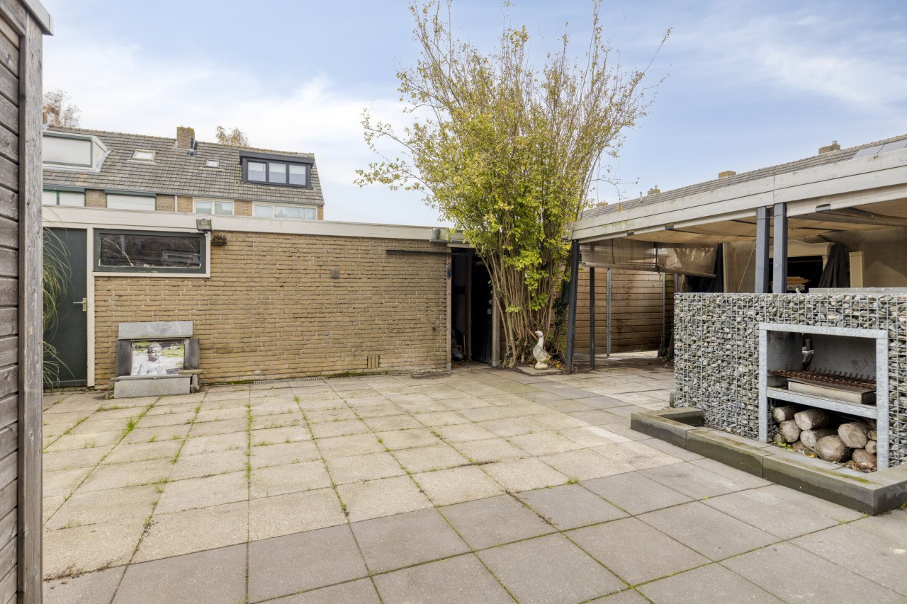 De tuin is een heerlijke plek om te ontspannen. Gelegen op het zuiden, biedt deze zonnige, onderhoudsvriendelijke buitenruimte volop privacy en rust. Achter in de tuin bevindt zich de garage. Voor de garage ligt een carport, waardoor je ruimte hebt om twee auto’s te parkeren op eigen terrein.