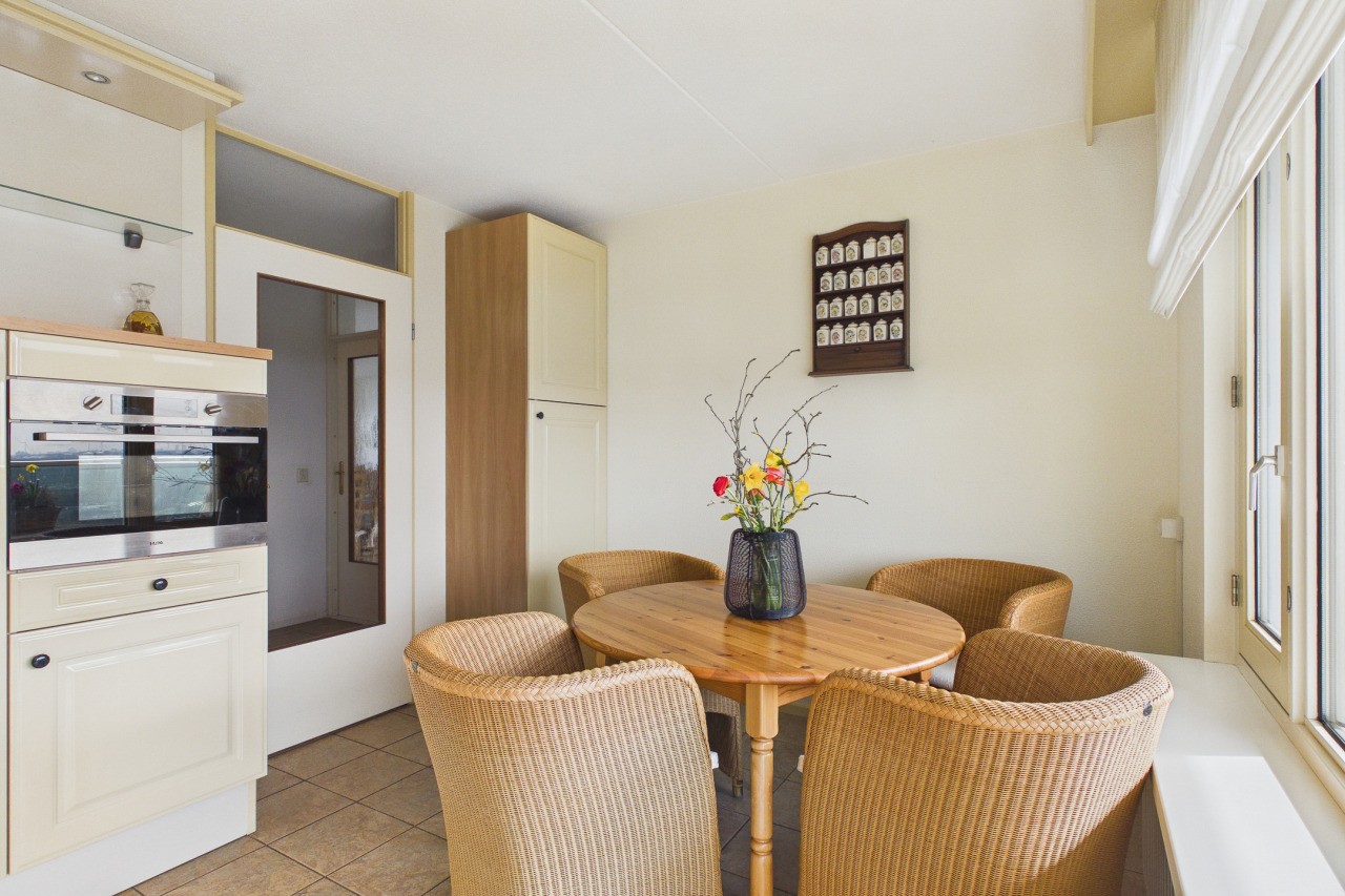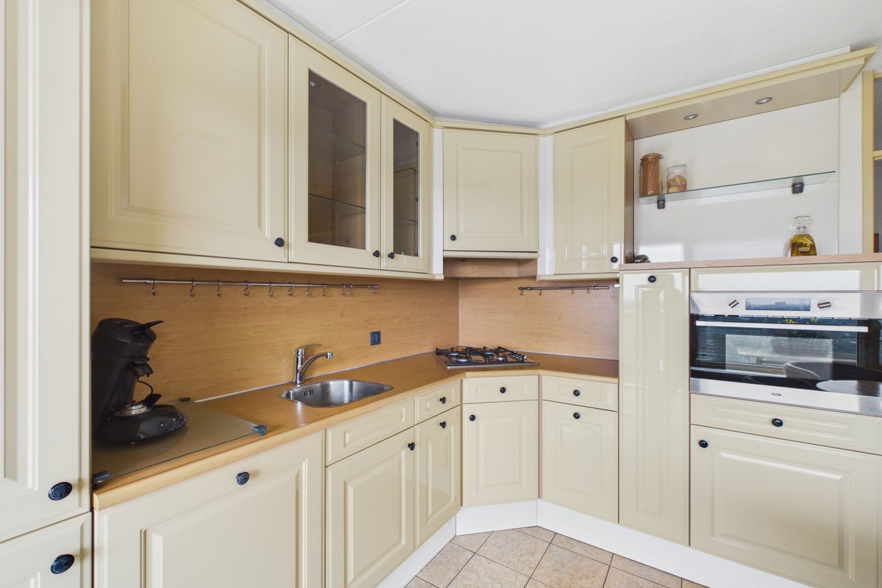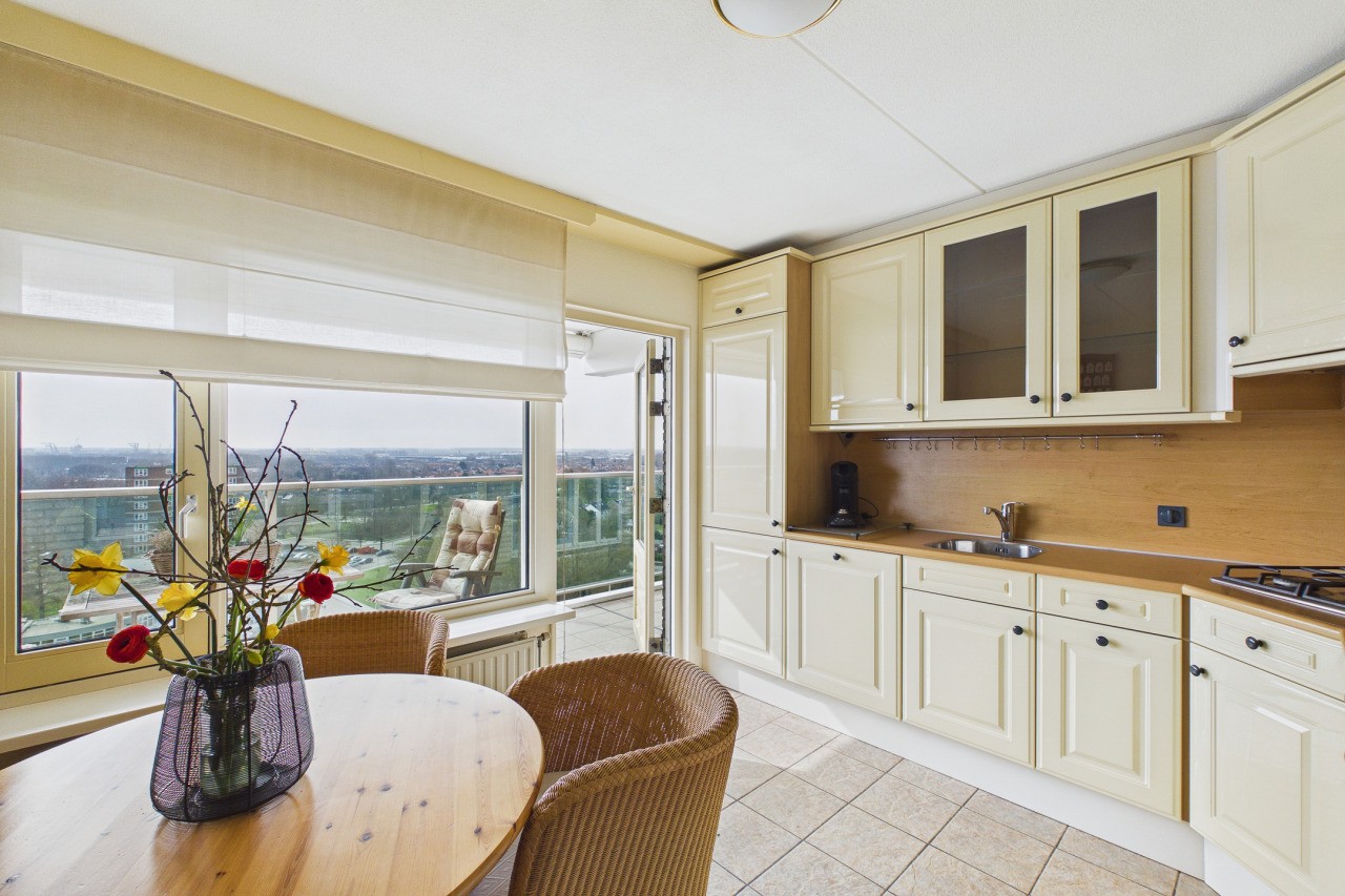 Je komt het appartement binnen in de hal met intercom en de meterkast. Vanuit de hal stap je de gesloten woonkeuken binnen, die in een praktische hoekopstelling is geplaatst en voorzien van diverse inbouwapparatuur zoals een gaskookplaat, afzuigkap, apothekerskast, combi-oven, vaatwasser, koel-vriescombinatie en een spoelbak. Vanuit de keuken heb je toegang tot het royale zonnige balkon aan de landzijde, waar je geniet van een mooi uitzicht over Terneuzen.