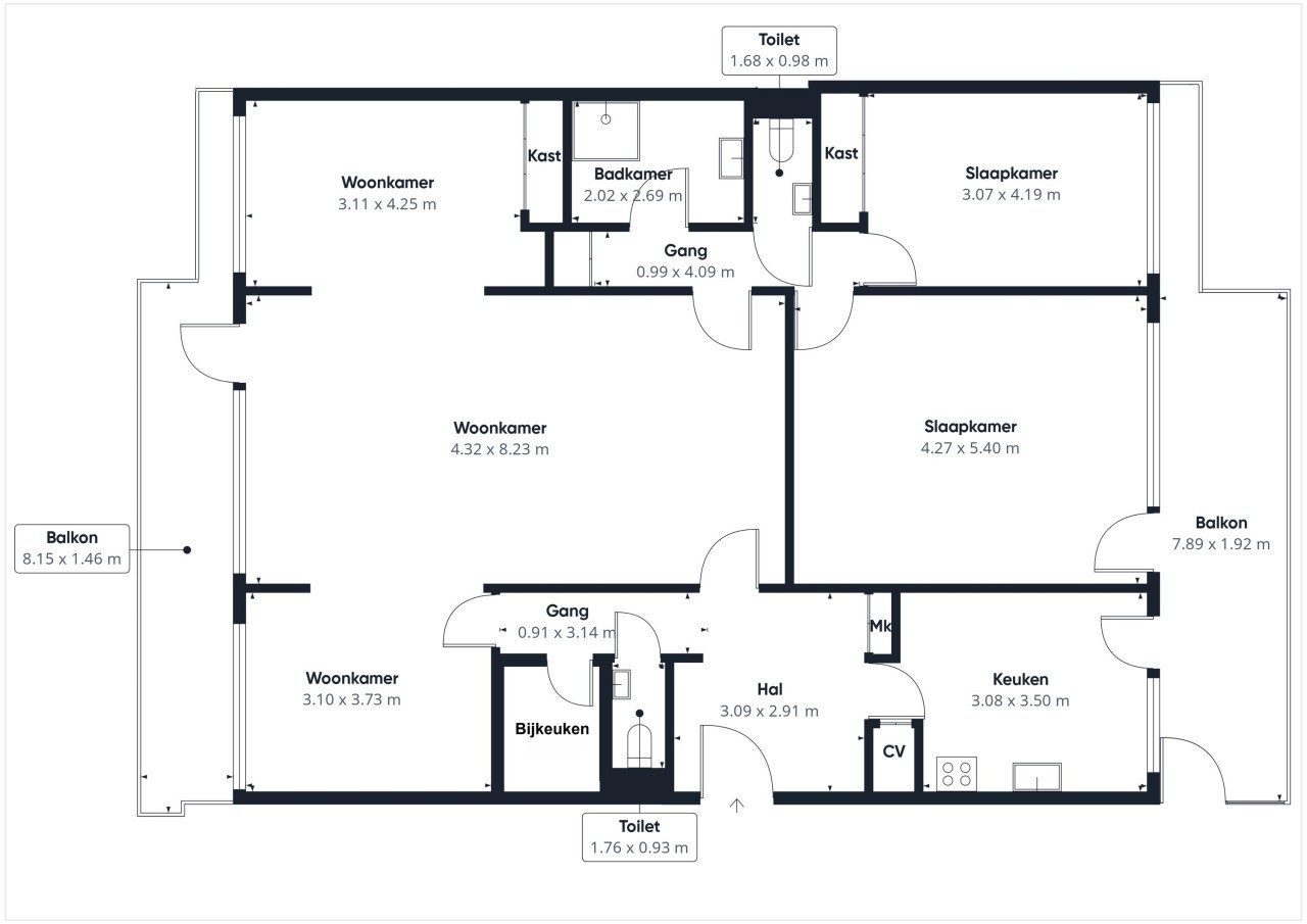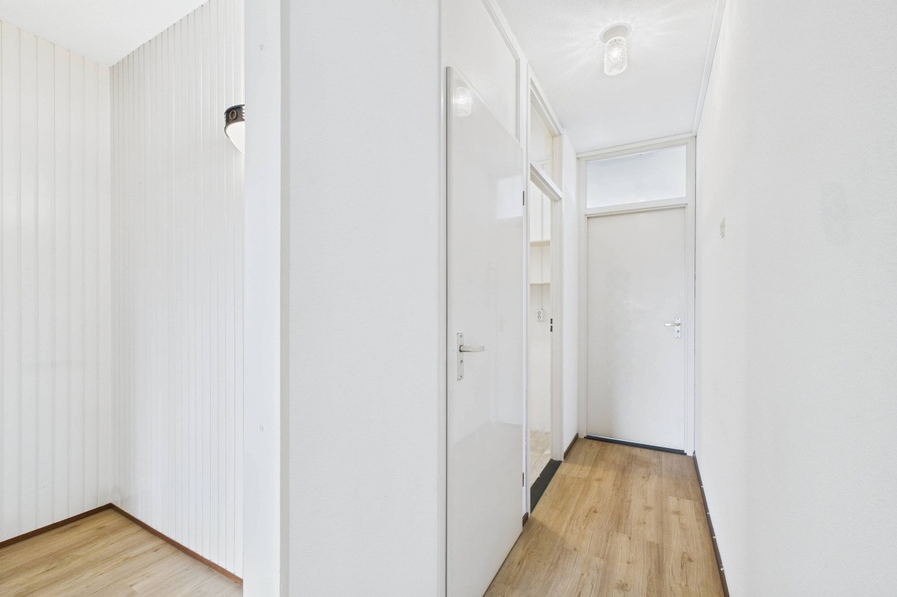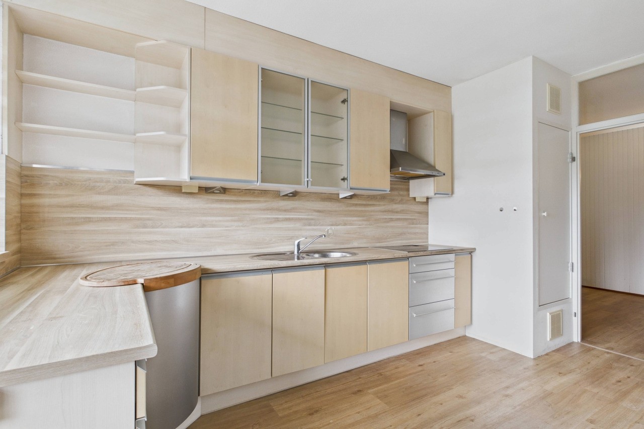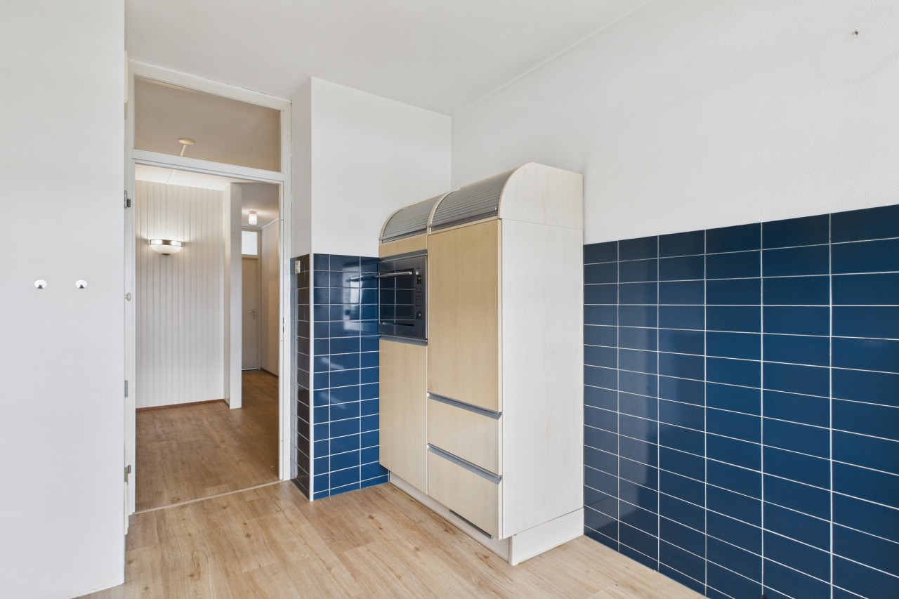 Binnenkomend via de hal tref je aan de rechterzijde de keuken, voorzien van een nette inbouwkeuken met inductiekookplaat, afzuigkap, koelkast en combimagnetron. Vanuit de keuken is er toegang tot het ruime balkon aan de landzijde (circa 17 m²) – ideaal voor de ochtendzon. In de hal bevinden zich verder de meterkast, het toilet en een praktische bijkeuken met aansluitingen voor witgoed.