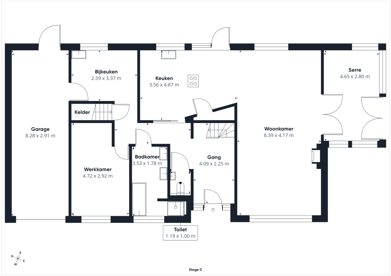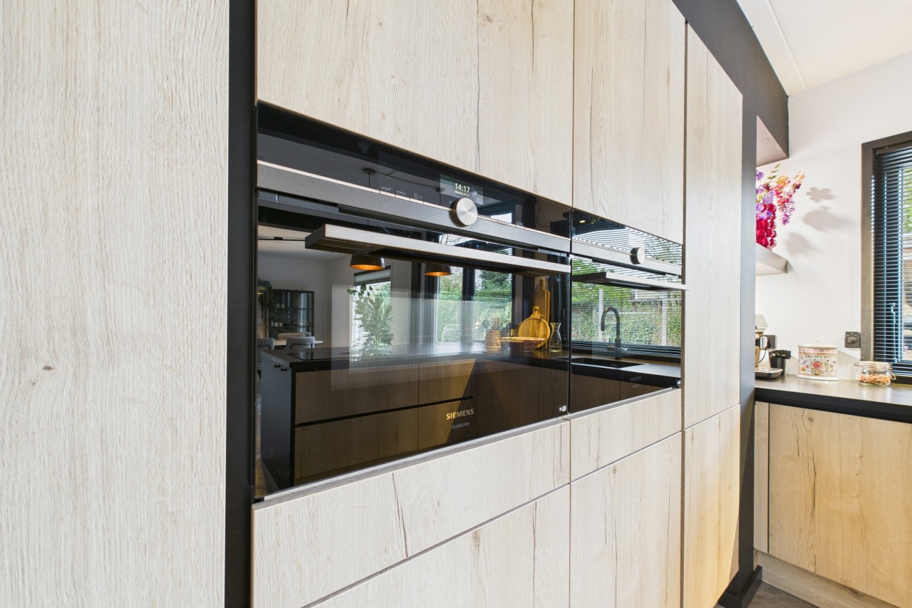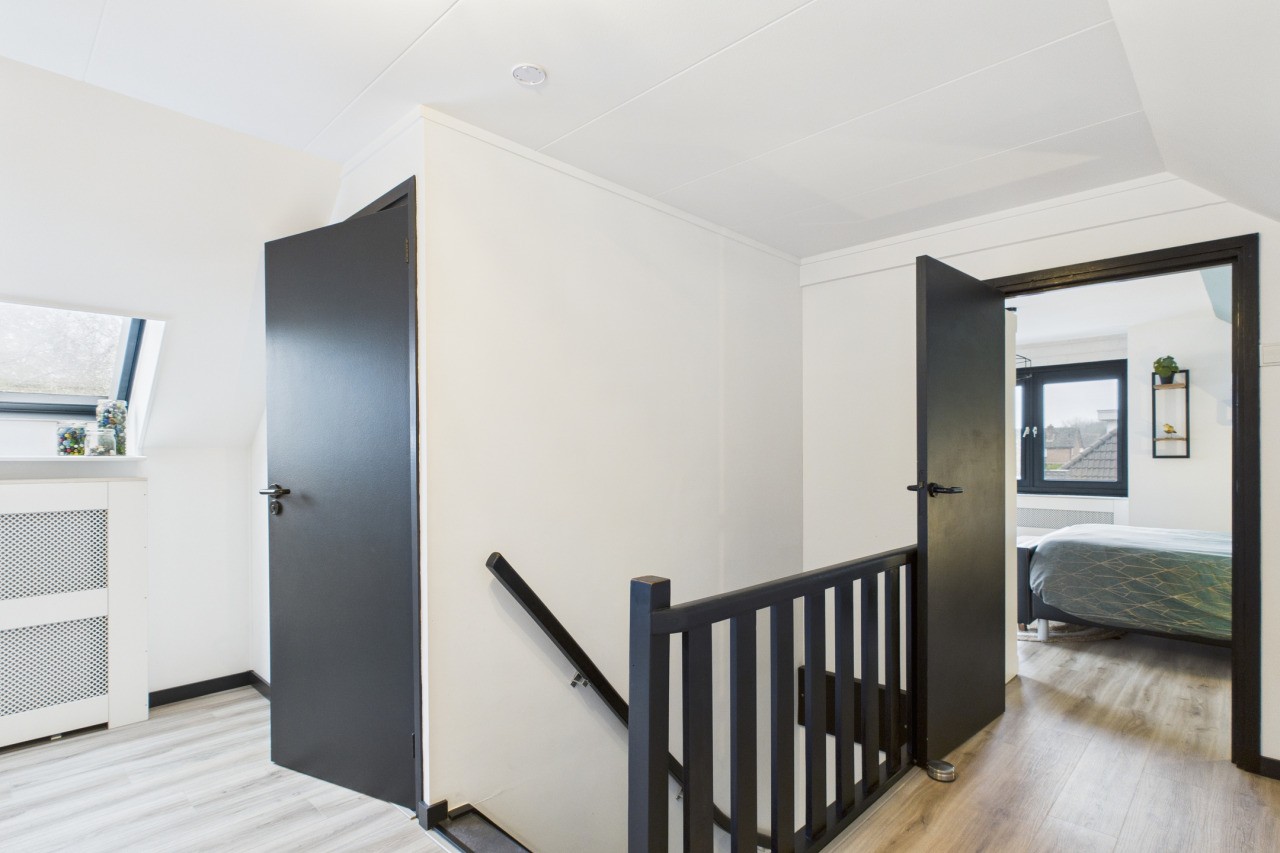 Bij binnenkomst valt de ruime entree op, met garderobe, trap naar de eerste verdieping en een toilet met fonteintje. De woonkamer is licht, met grote ramen en een sfeervolle schouw, en loopt door naar de serre, een fijne plek om te ontspannen en van de tuin te genieten. De woonkeuken in U-opstelling is luxe en modern, voorzien van een Quooker, kookplaat met geïntegreerde afzuiging, stoomoven, een combi-oven/magnetron en veel bergruimte. Vanuit de keuken bereik je de hal die toegang biedt tot de badkamer met dubbele wastafel met -meubel, bubbelbad en inloopdouche. Daarnaast is er een ruime werkkamer, die ook als slaapkamer gebruikt kan worden, en een bijkeuken met witgoedaansluiting en doorgang naar de garage met cv-ketel.