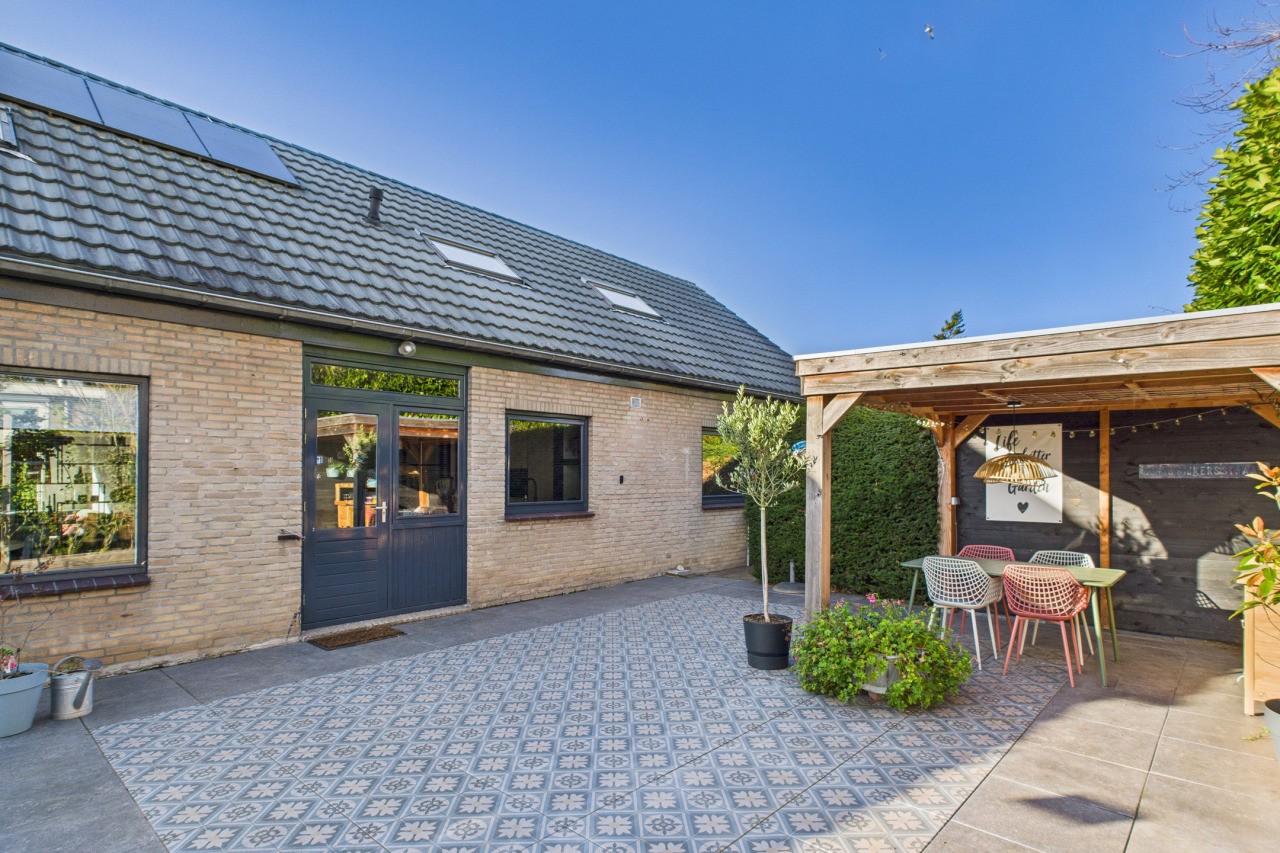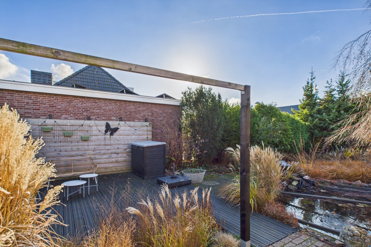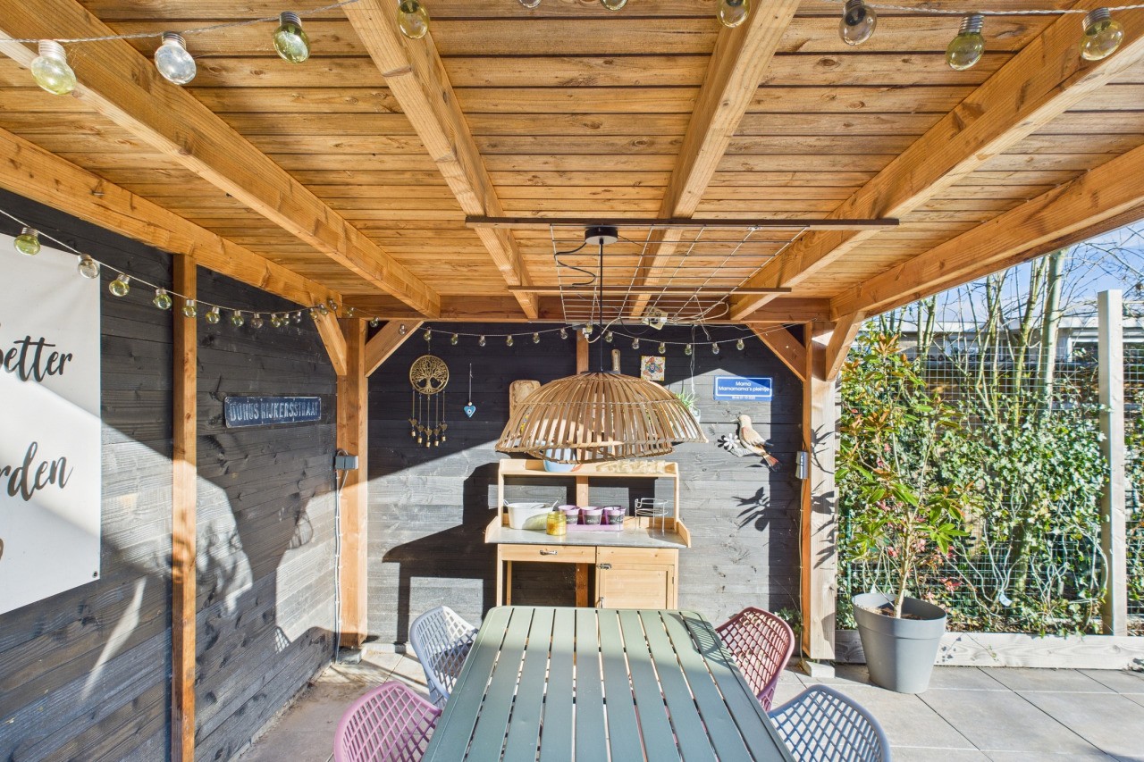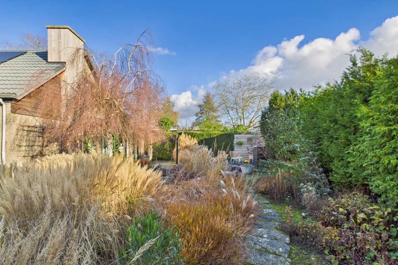 De tuin rondom is een fijne plek om buiten te zijn, met meerdere terrassen waar je kunt kiezen voor zon of schaduw. De fraaie beplanting zorgt voor kleur en sfeer, waardoor de tuin een gezellige en groene uitstraling heeft. Het nette gazon, de sfeervolle overkapping, de vrije achterom en de houten berging maken de buitenruimte compleet én praktisch ingericht.
