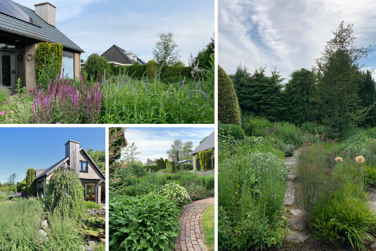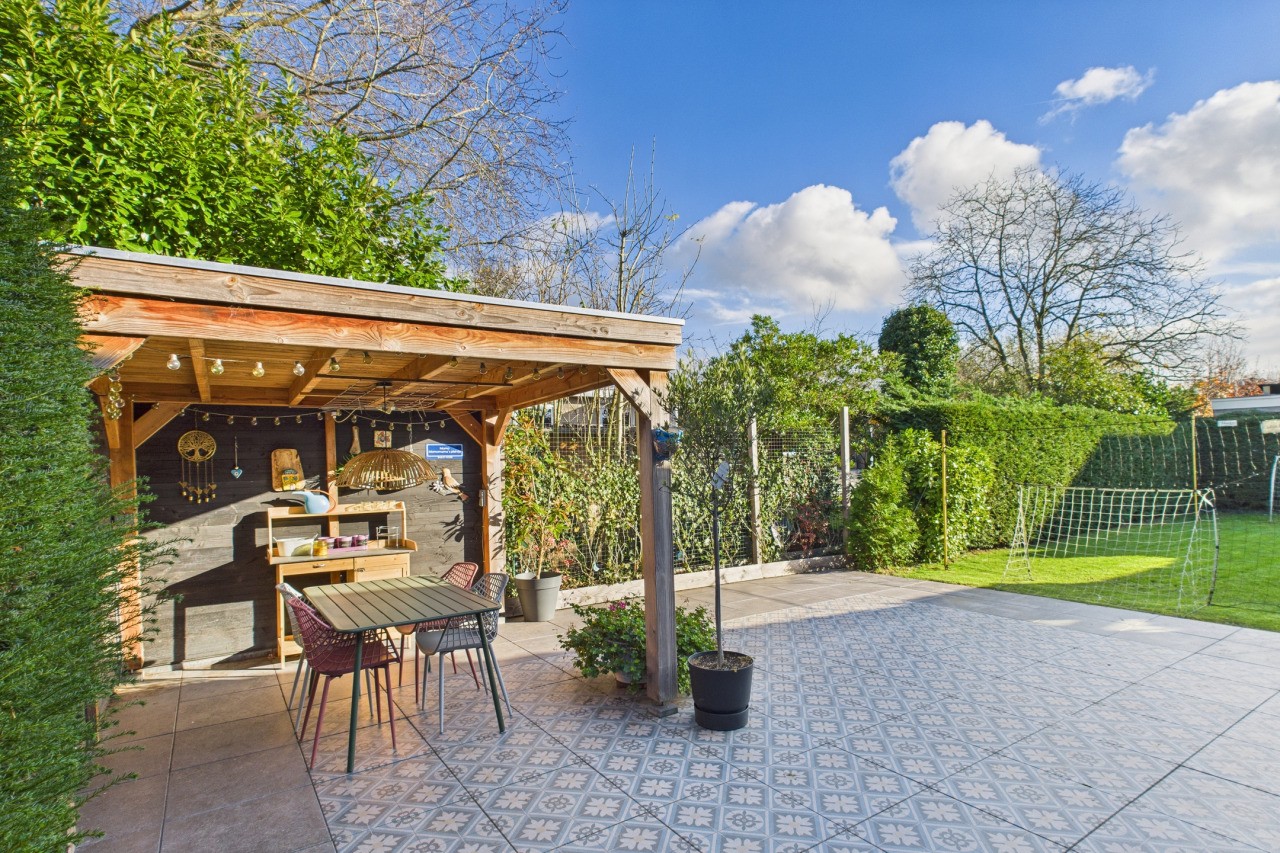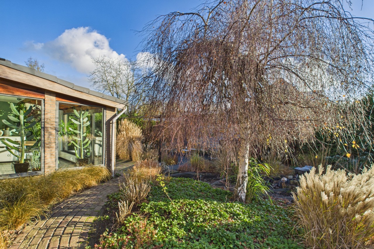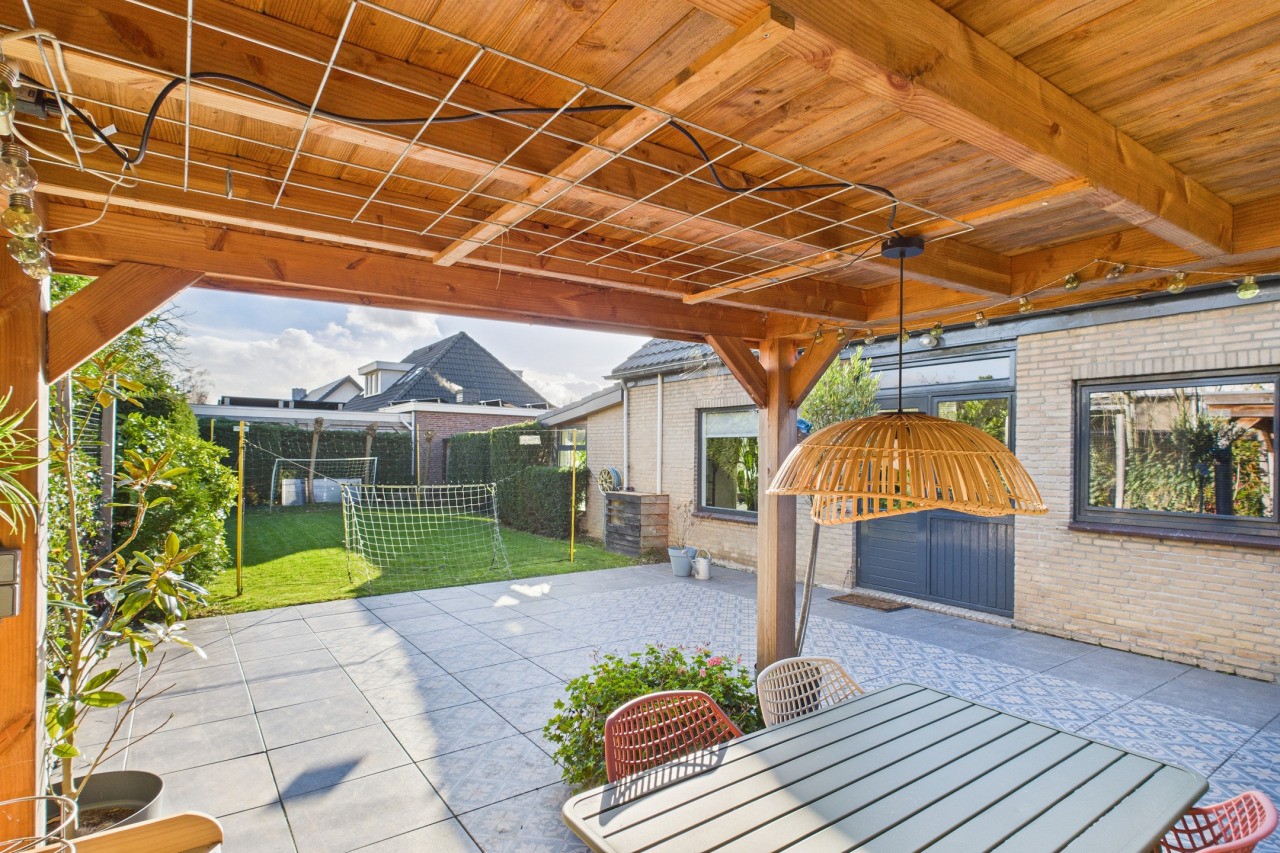 De tuin rondom is een fijne plek om buiten te zijn, met meerdere terrassen waar je kunt kiezen voor zon of schaduw. De fraaie beplanting zorgt voor kleur en sfeer, waardoor de tuin een gezellige en groene uitstraling heeft. Het nette gazon, de sfeervolle overkapping, de vrije achterom en de houten berging maken de buitenruimte compleet én praktisch ingericht.