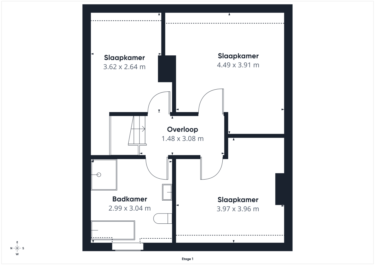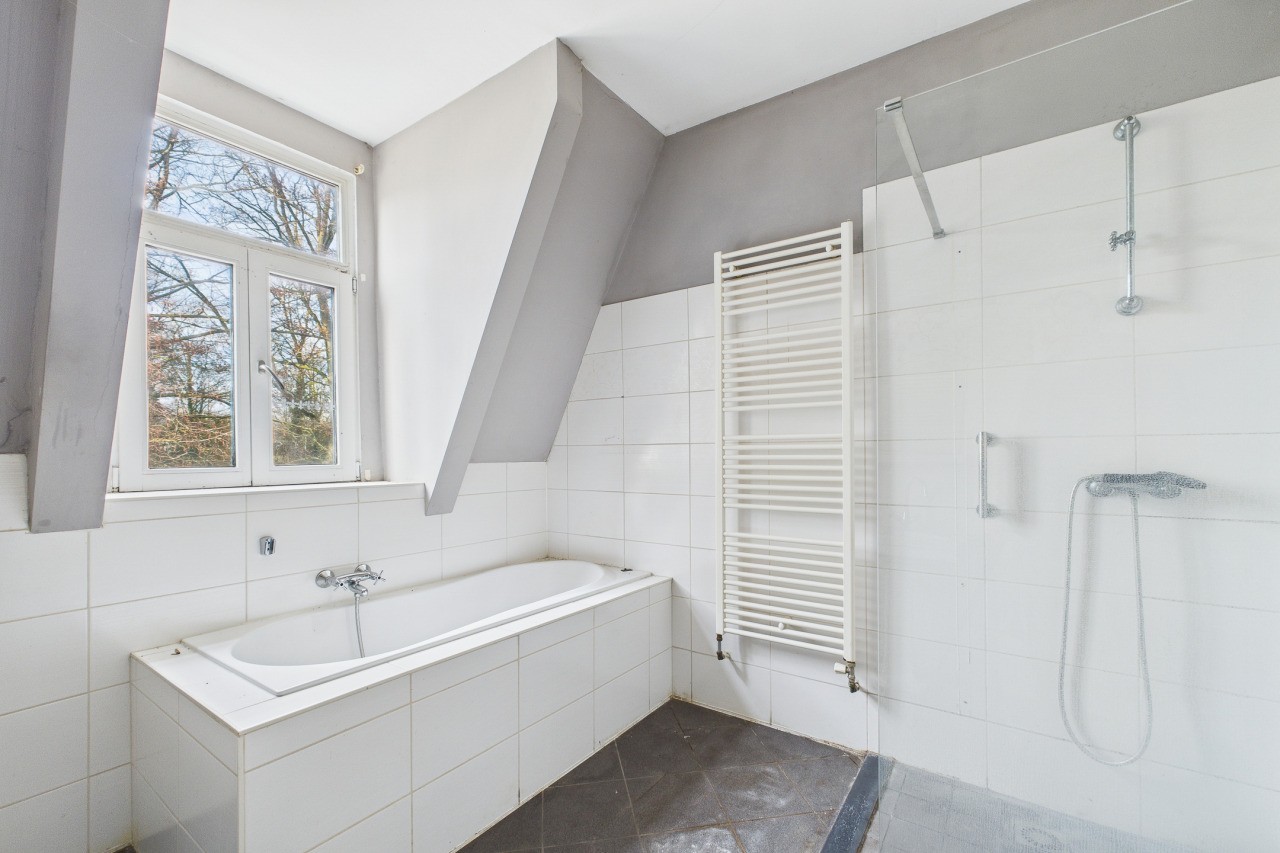 Op de eerste verdieping geeft de overloop toegang tot drie slaapkamers, die stuk voor stuk beschikken over een prettige lichtinval. De badkamer is ingericht met een ligbad, een inloopdouche, een wastafel en een toilet. Ook deze verdieping biedt een goede basis voor een eigentijdse herindeling of modernisering.