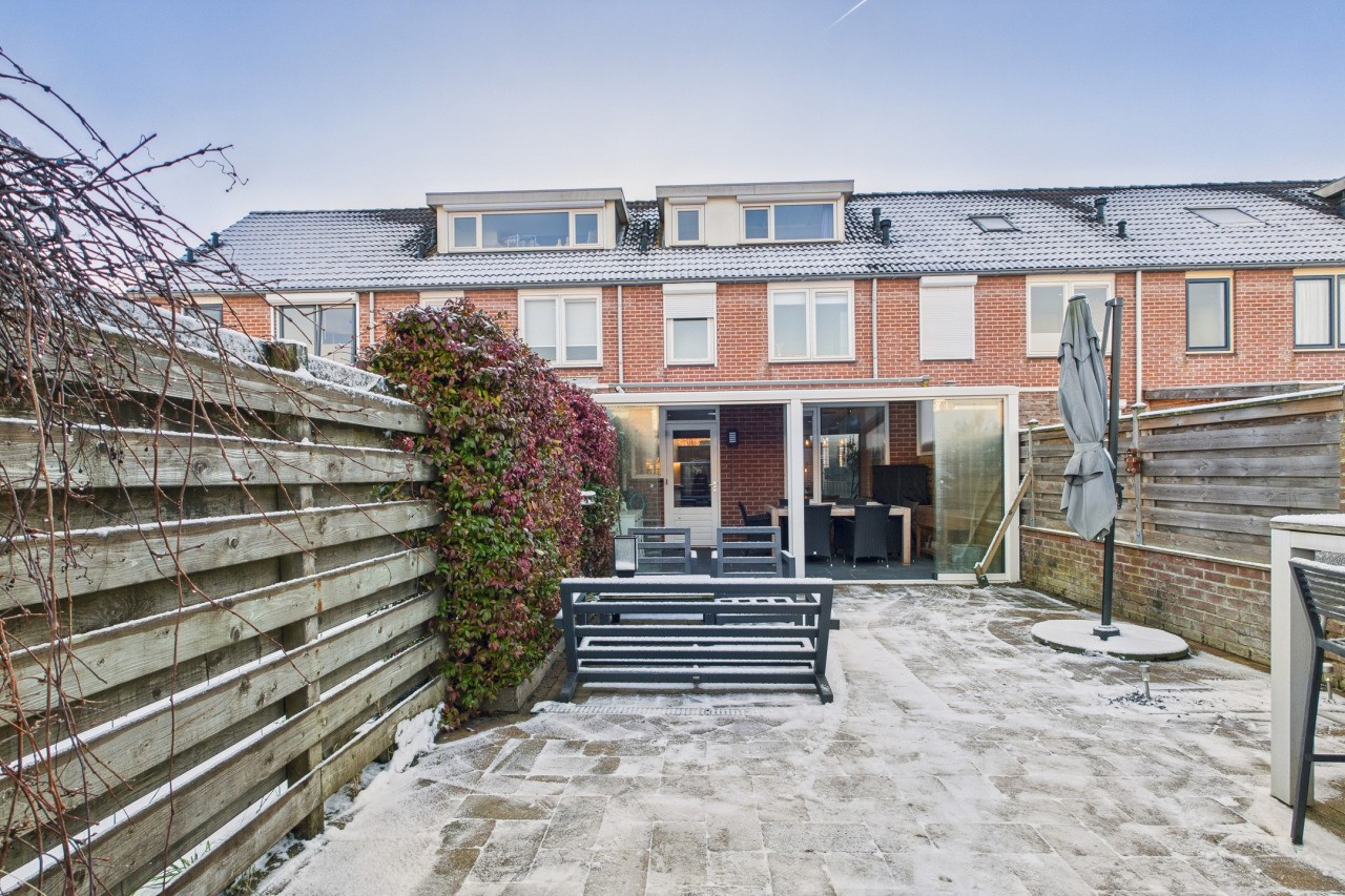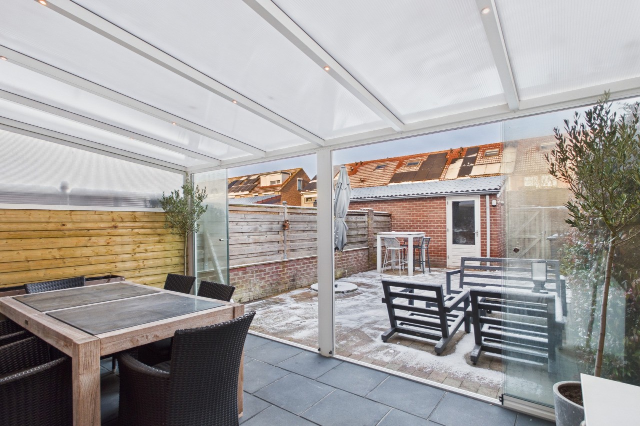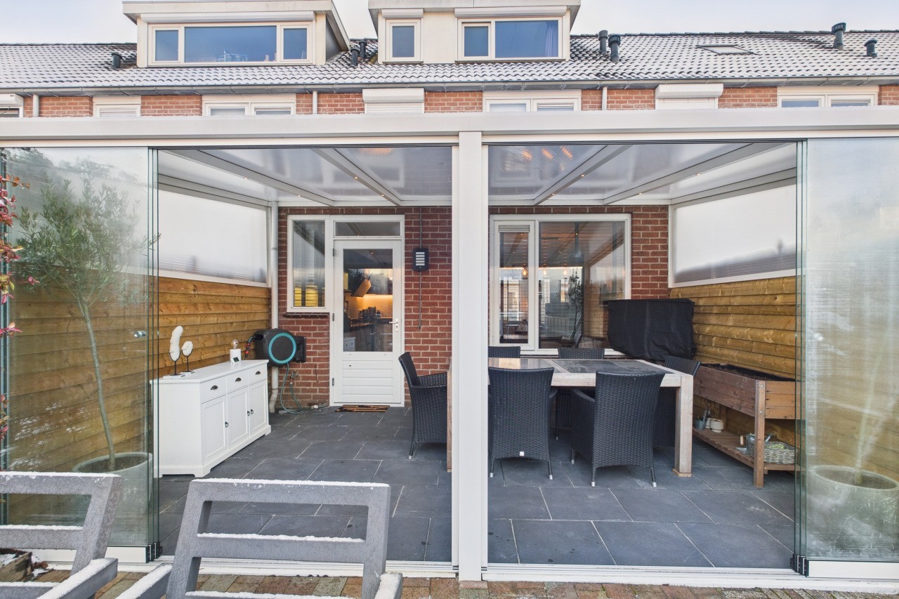 Aansluitend aan de keuken ligt de serre, uitgerust met geïntegreerde verlichting en een mooie lichtinval. Een plek waar je het hele jaar door van het uitzicht op de tuin geniet. De onderhoudsvriendelijke achtertuin ligt op het noordwesten en is voorzien van een stenen berging en een vrije achterom. Dankzij de open omgeving en minimale bebouwing valt er veel zonlicht binnen, waardoor het een prettige plek is om te ontspannen, te tuinieren of buiten te eten met vrienden.