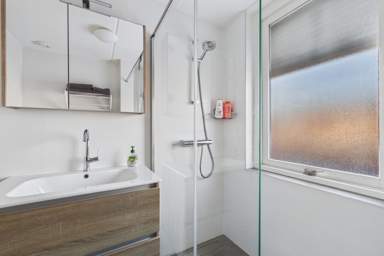 Op de eerste verdieping kom je uit op de overloop die toegang biedt tot drie slaapkamers. Aan de voorzijde ligt een ruime ouderslaapkamer, terwijl de andere kamers flexibel te gebruiken zijn als kinder-, werk- of logeerkamer. De badkamer is keurig afgewerkt en ingericht met een inloopdouche, een wastafel met meubel en een toilet. Een vaste trap leidt naar de tweede verdieping.