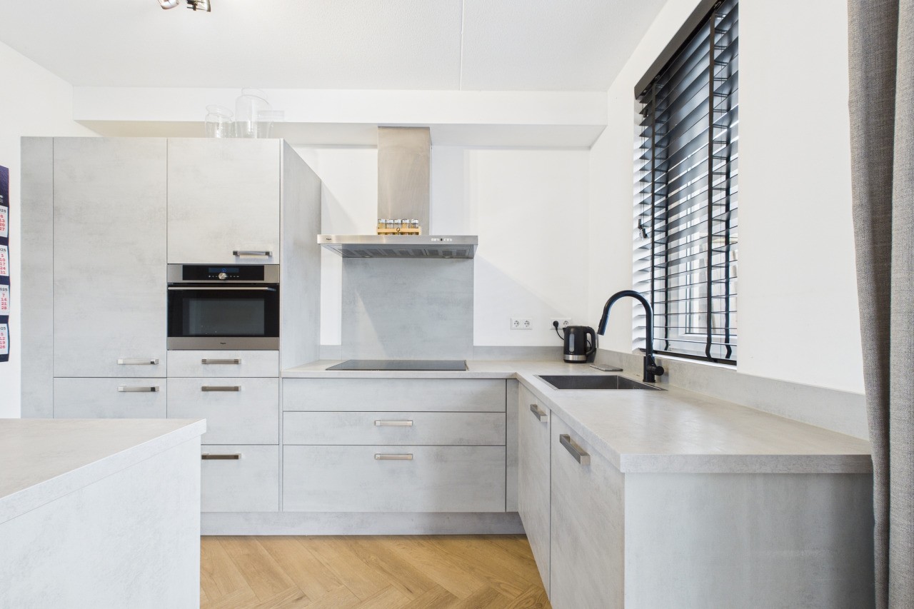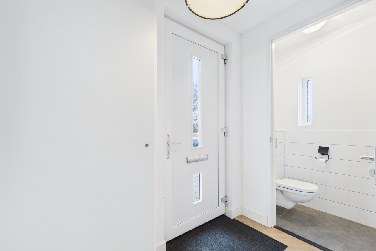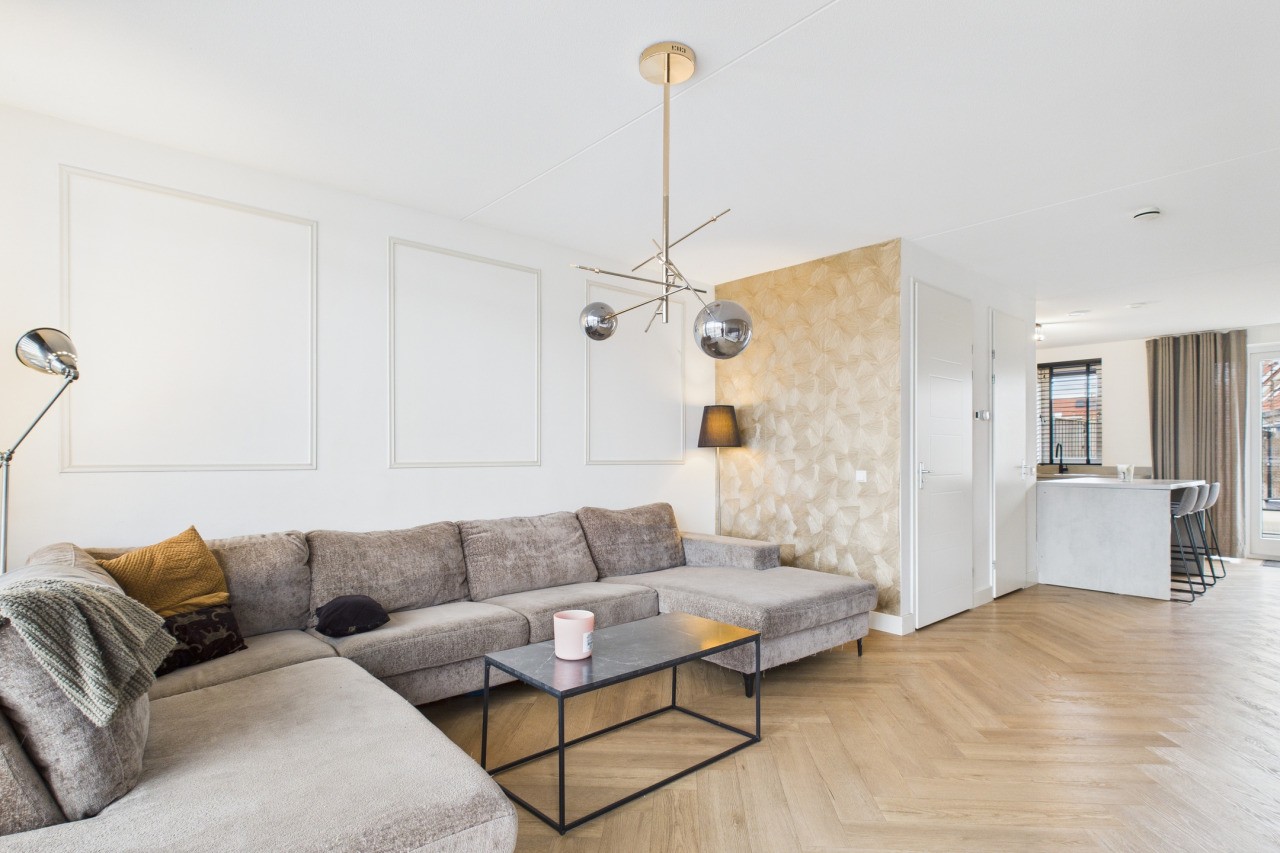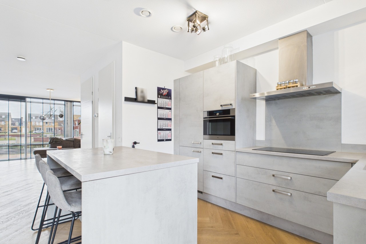 Via de hal met toiletruimte en meterkast is de begane grond toegankelijk. De woonkamer is een doorzonruimte met aan de voorzijde een zithoek en aan de achterzijde de keuken. In het midden vind je een portaal met de trap naar de verdieping en een voorraadkast. De keuken is uitgevoerd in een hoekopstelling met een losstaand eiland en beschikt over openslaande deuren naar de tuin. Vanuit de keuken is tevens de inpandige garage bereikbaar, wat het dagelijks gebruik vergemakkelijkt.