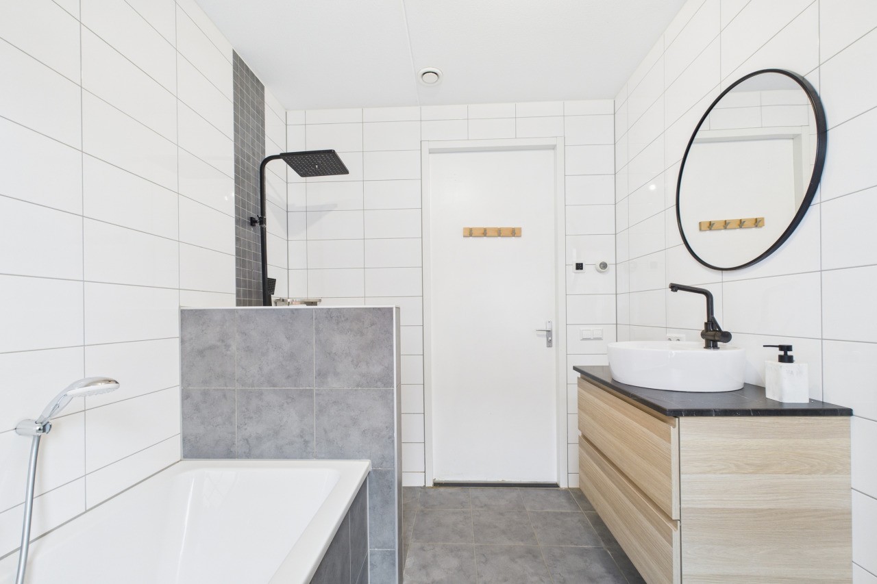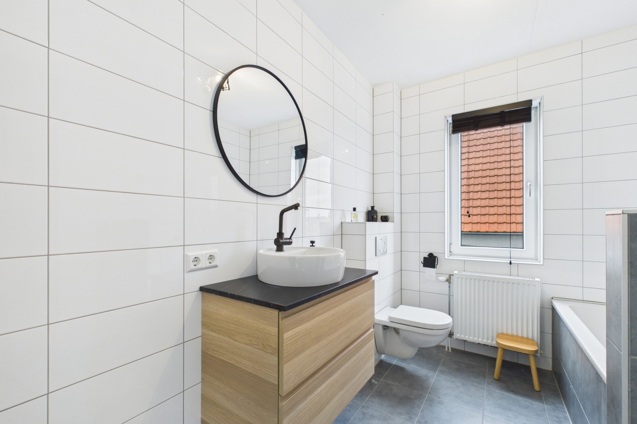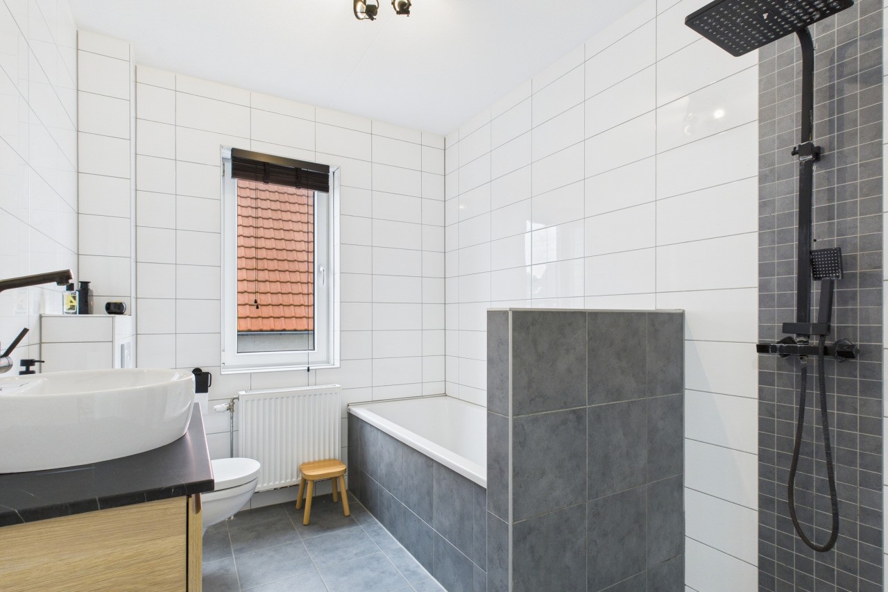 Op de eerste verdieping bevinden zich drie slaapkamers, elk met een eigen karakter. Eén slaapkamer is voorzien van een dakkapel en een andere van een Velux dakraam. De moderne badkamer is uitgerust met een inloopdouche, ligbad, wastafelmeubel en een zwevend toilet. De overloop biedt toegang tot de vaste trap naar de tweede verdieping.