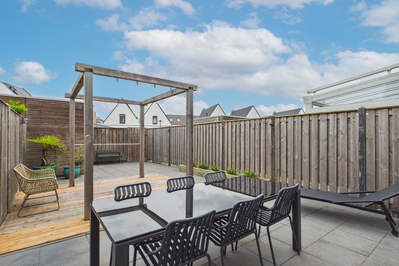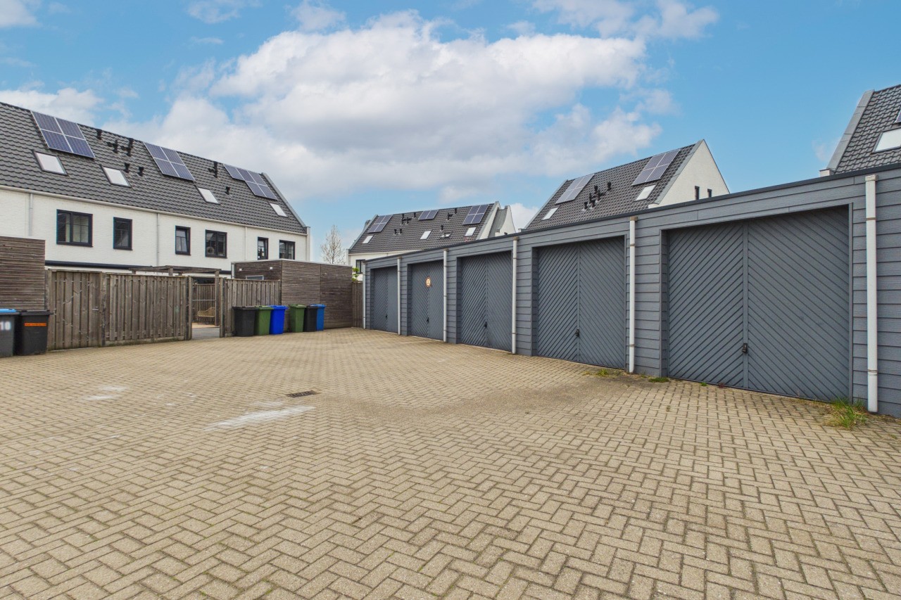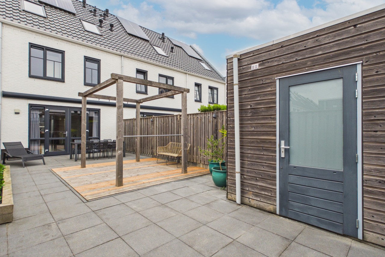 De achtertuin is gelegen op het oosten en is verzorgd en onderhoudsvriendelijk aangelegd met een terras en een vlonder. Dankzij de eigen achterom is de tuin gemakkelijk bereikbaar. Aan de achtergevel is een zonnescherm geplaatst, wat zorgt voor extra comfort op zonnige dagen. Achter in de tuin bevindt zich een houten berging en op het achtergelegen pleintje ligt de bijbehorende garagebox.