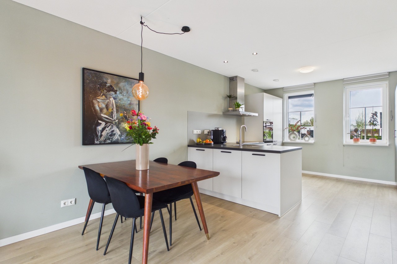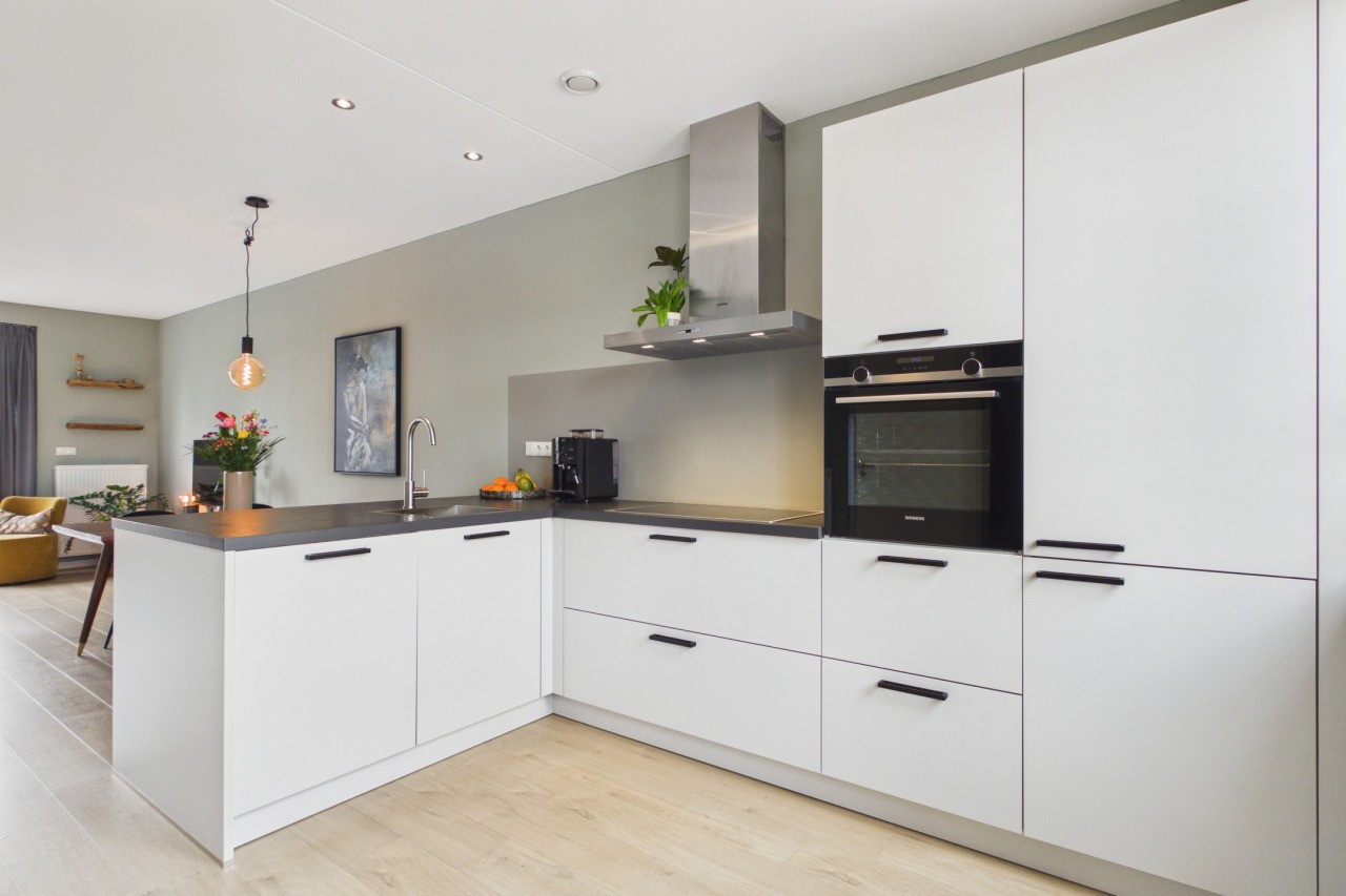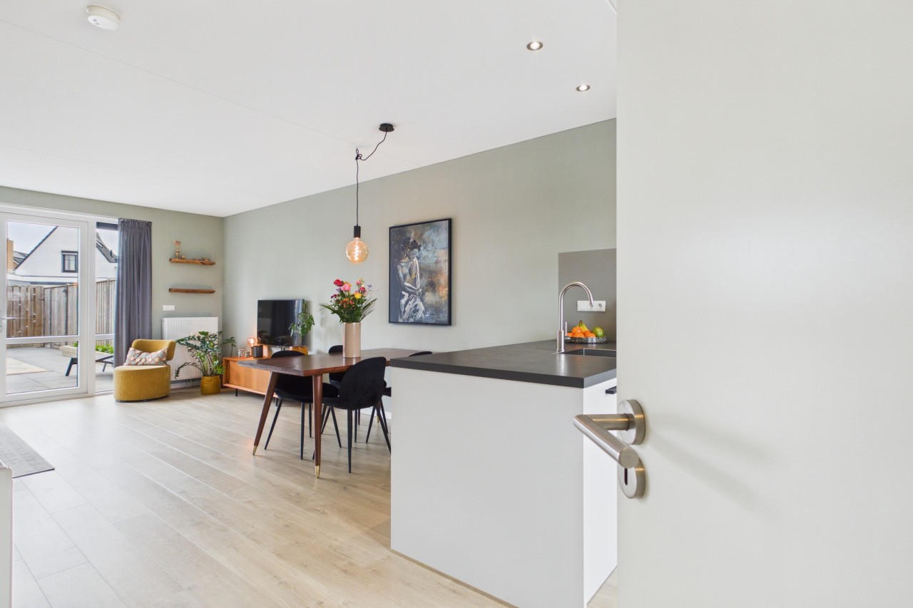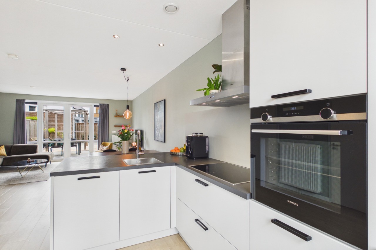 Je komt de woning binnen in de hal met meterkast en een toilet met fonteintje. Vanuit hier betreed je de lichte en sfeervolle woonkamer. Aan de voorzijde van de woning bevindt zich de moderne open keuken in hoekopstelling, voorzien van diverse Siemens inbouwapparatuur zoals een inductiekookplaat, afzuigkap, oven, vaatwasser en een koel-/vriescombinatie. Het zitgedeelte is aan de achterzijde gesitueerd en profiteert van veel lichtinval door de openslaande tuindeuren, met een mooi zicht op de achtertuin.