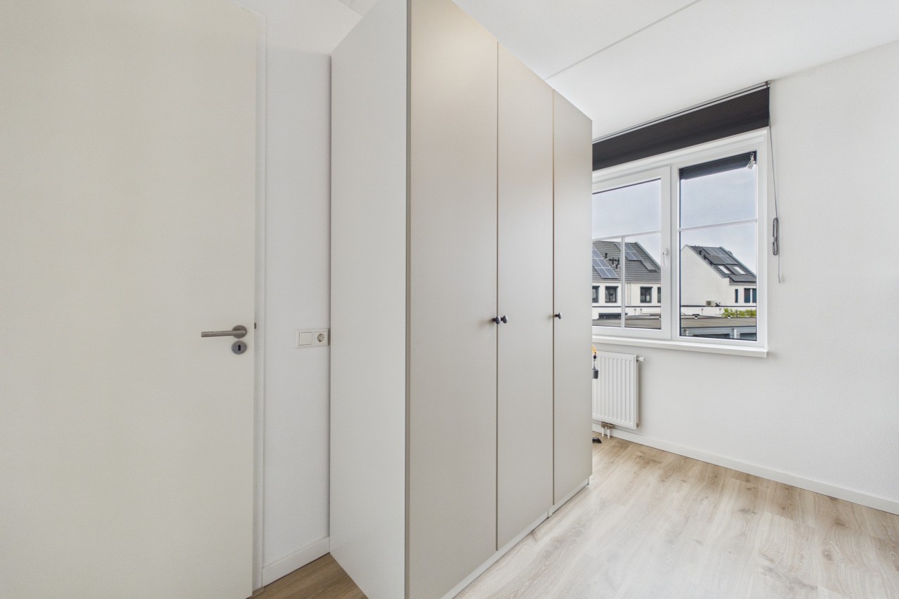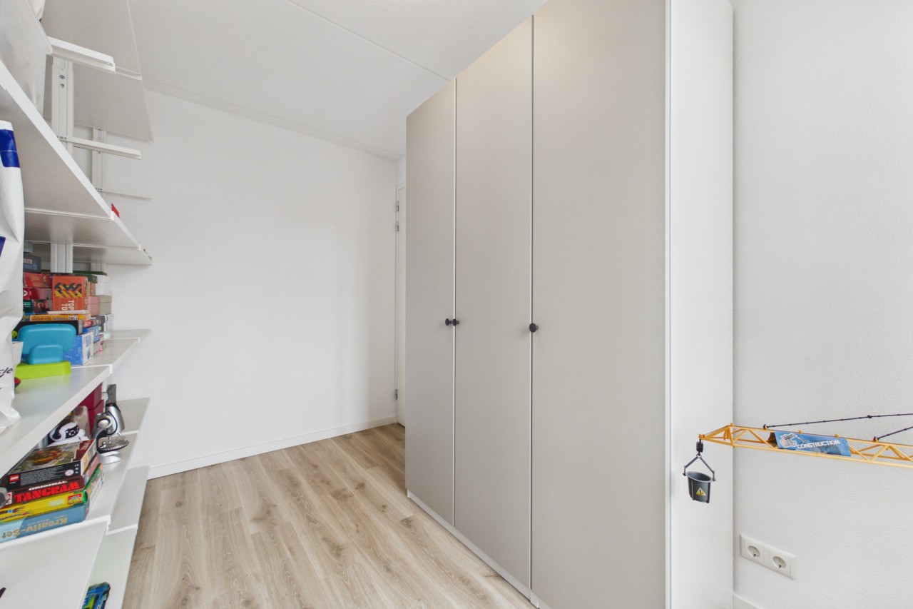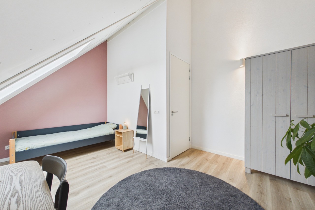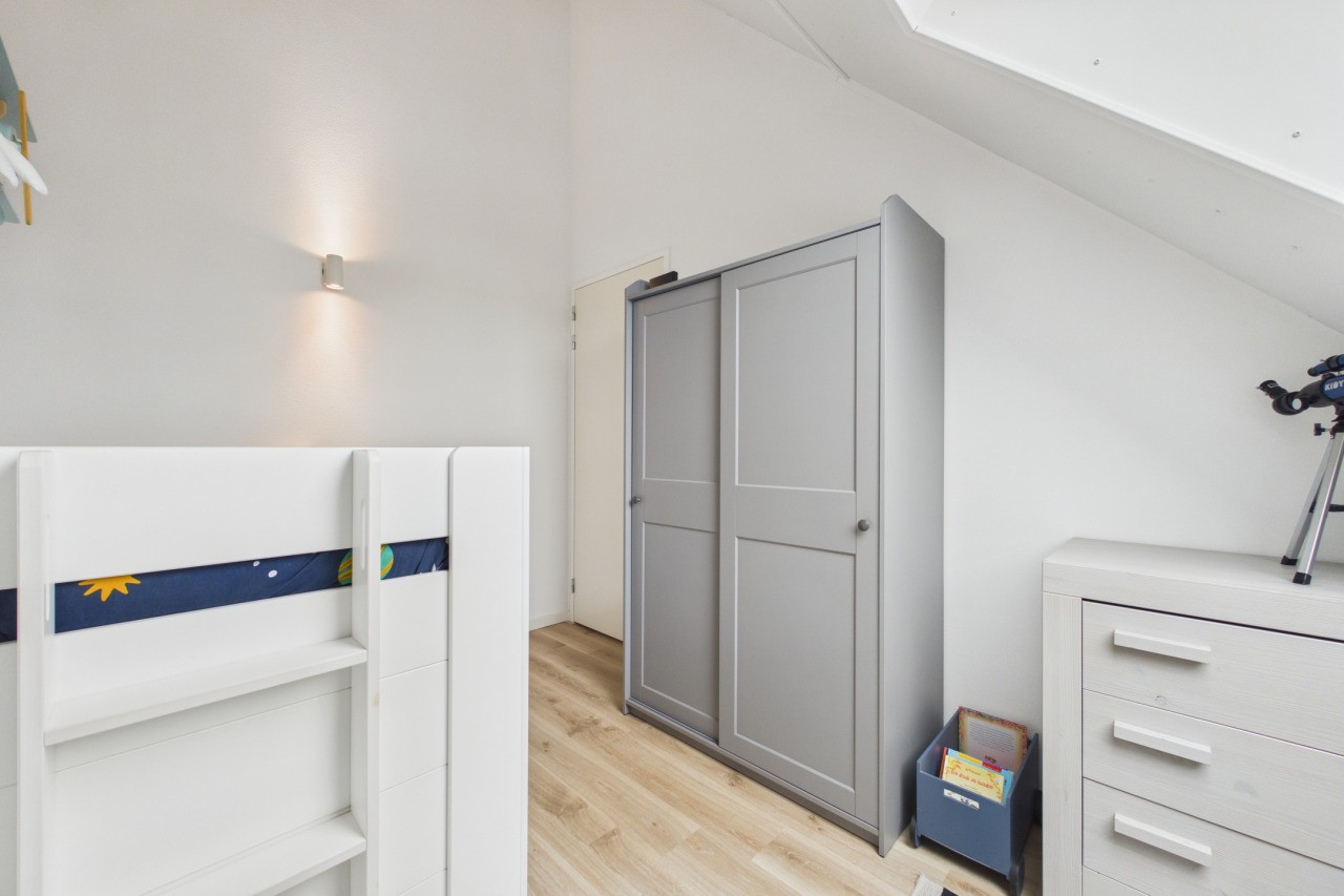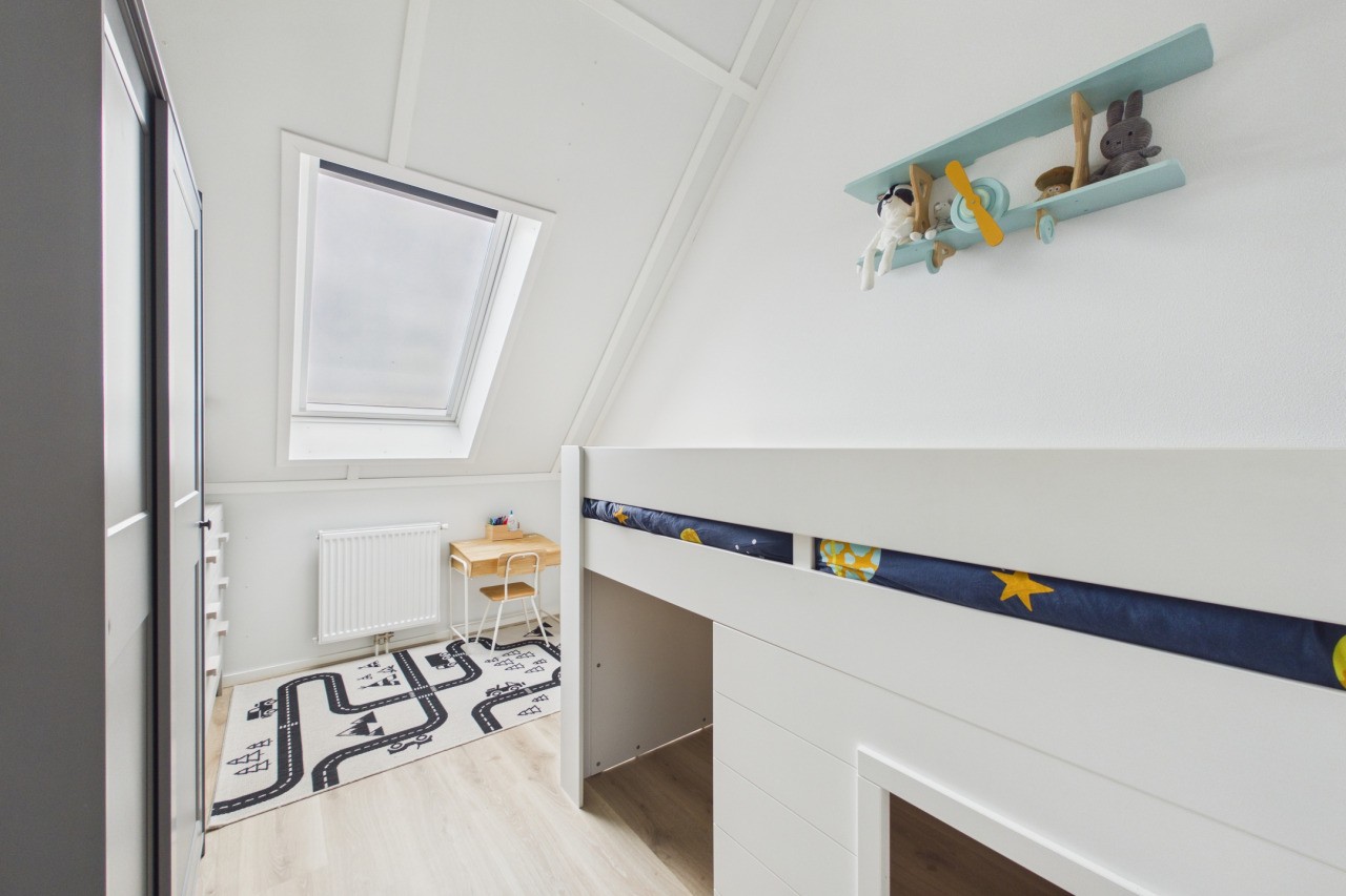 De tweede verdieping biedt nog eens twee slaapkamers, beide voorzien van een Velux dakraam en praktische bergruimte achter de knieschotten. Daarnaast is er een aparte berging aanwezig met de cv-opstelling en aansluitingen voor witgoedapparatuur, eveneens voorzien van een Velux dakraam.