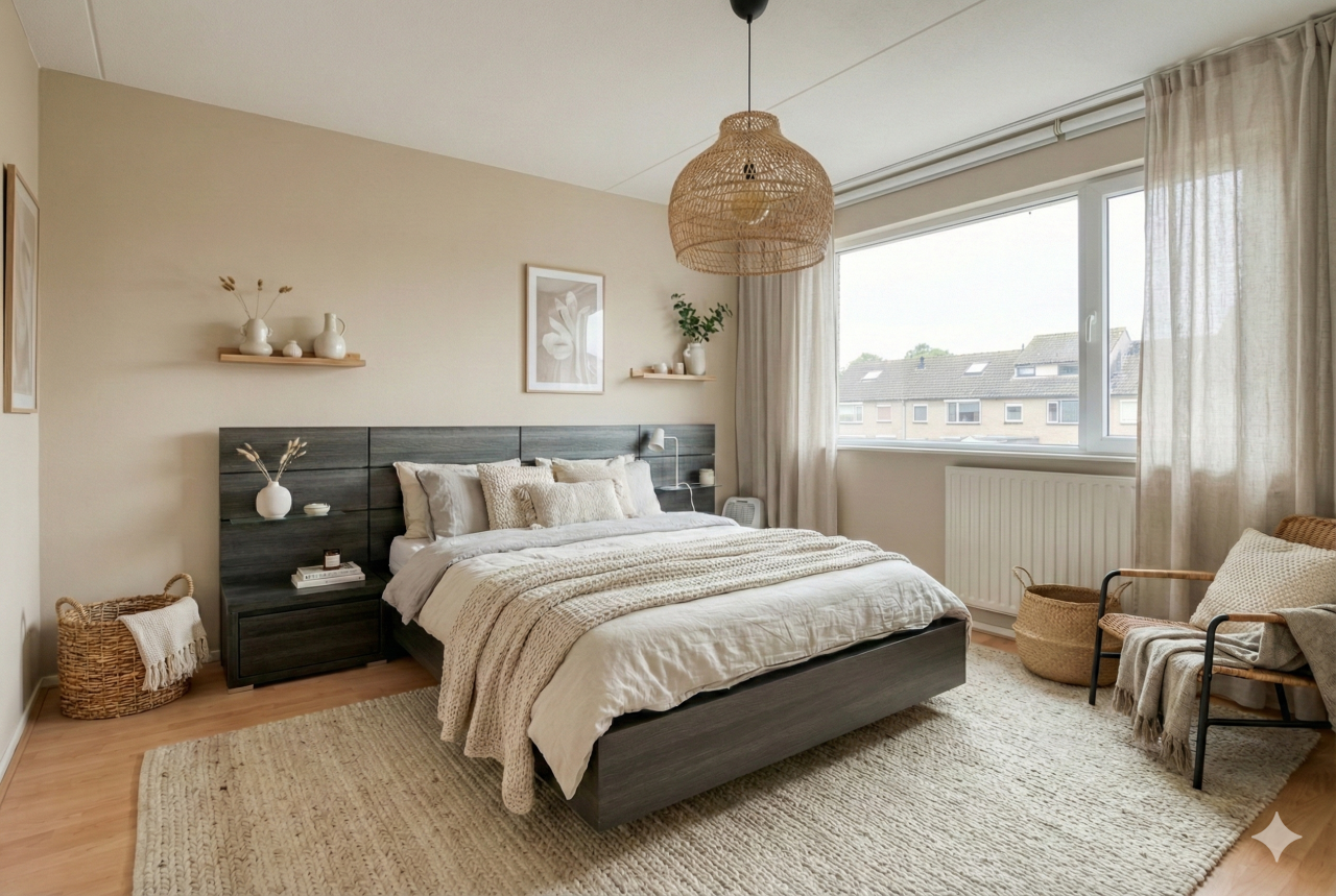 De tweede verdieping is via een vaste trap bereikbaar en biedt een extra ruime slaapkamer. Dankzij de dakkapel is hier niet alleen veel licht, maar ook extra leefruimte gecreëerd. De kamer beschikt bovendien over een eigen wastafel. Op de overloop vind je de cv-installatie en de aansluiting voor het witgoed.