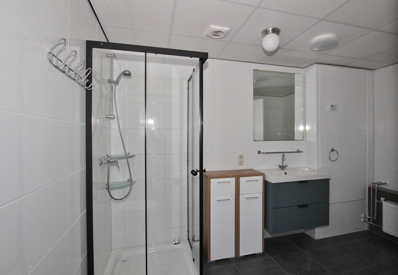 -Nette badkamer met douche en wastafel, verzorgd en praktisch ingericht.