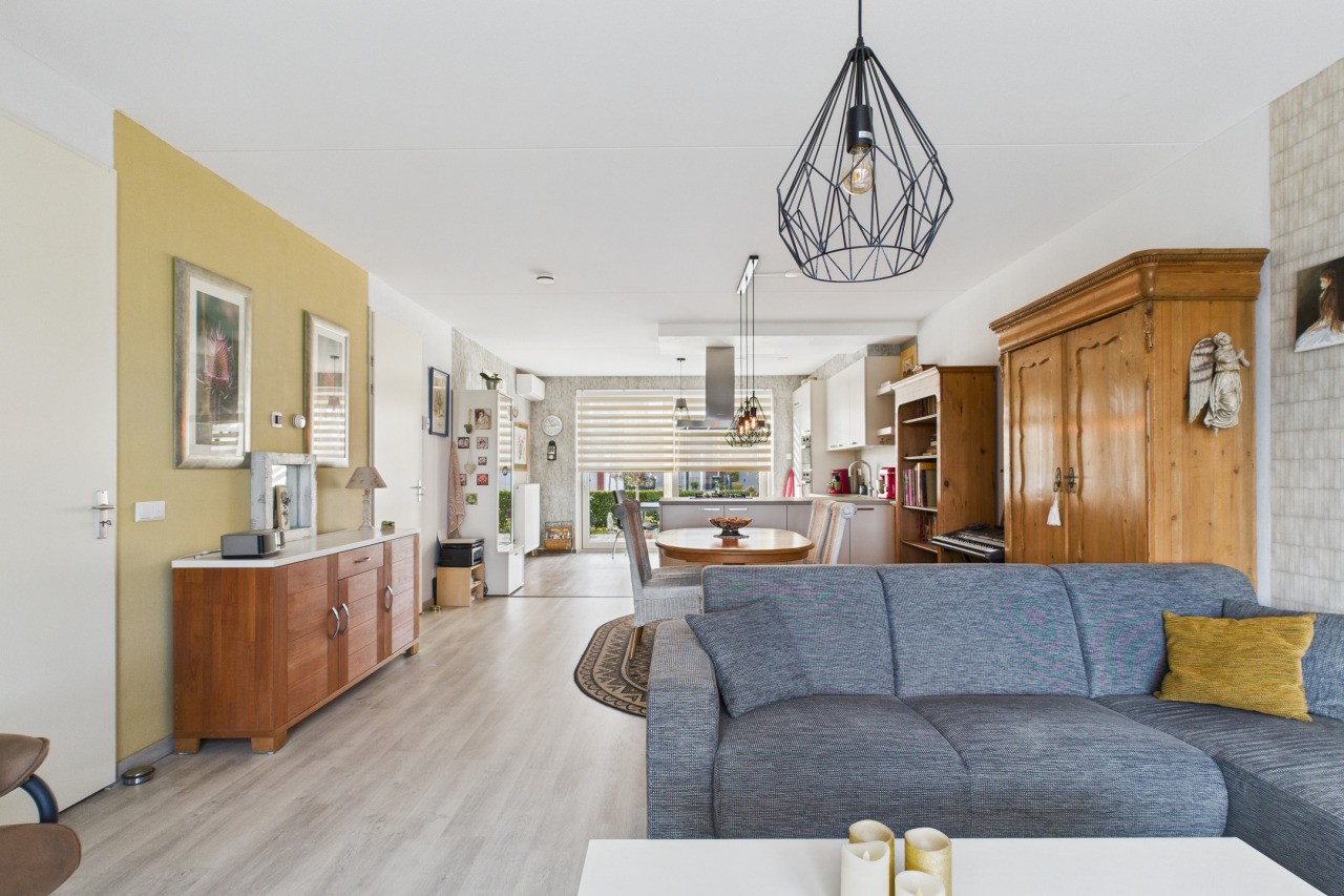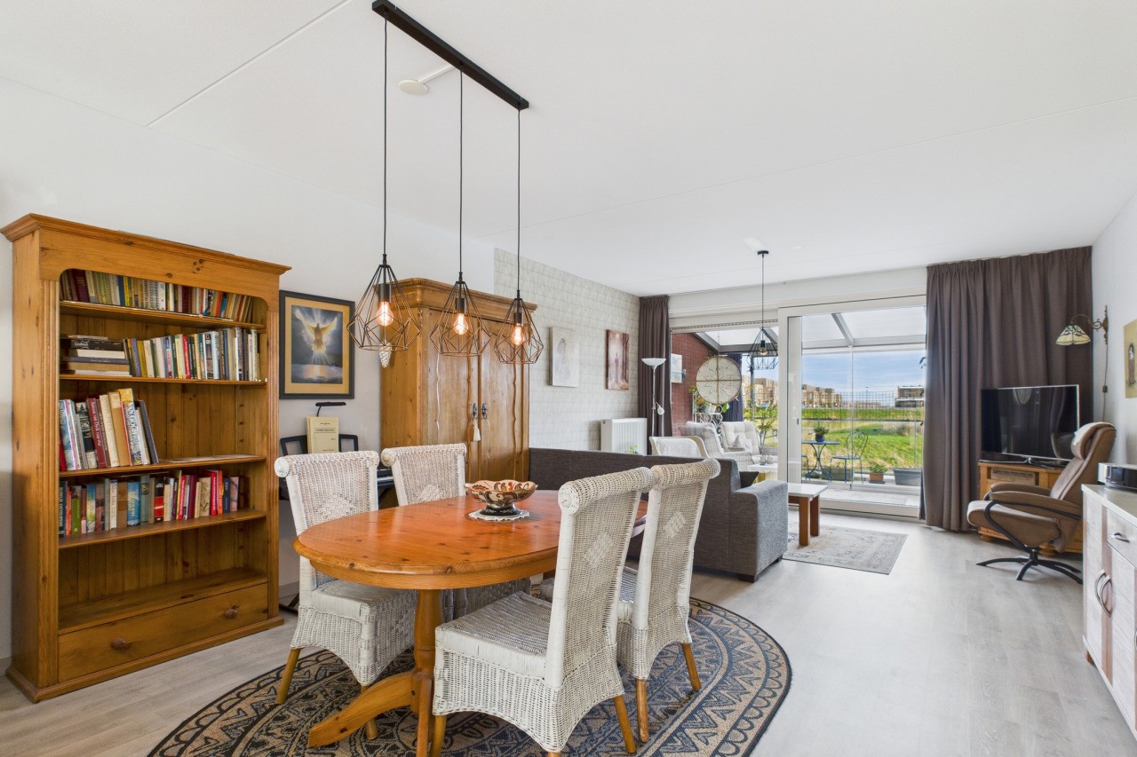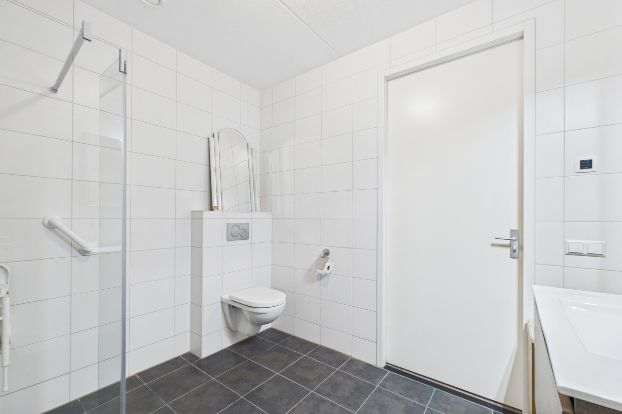 Aan de achterzijde van de woning bevindt zich het lichte en sfeervolle woongedeelte met aansluitend de serre, waar je via een schuifpui het balkon bereikt: een heerlijke plek om te genieten! Op de begane grond bevindt zich verder een royale slaapkamer en de moderne badkamer met inloopdouche, wastafelmeubel en toilet, wat gelijkvloers wonen bijzonder comfortabel maakt.