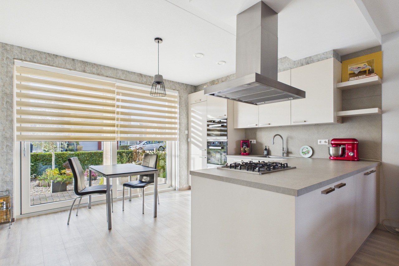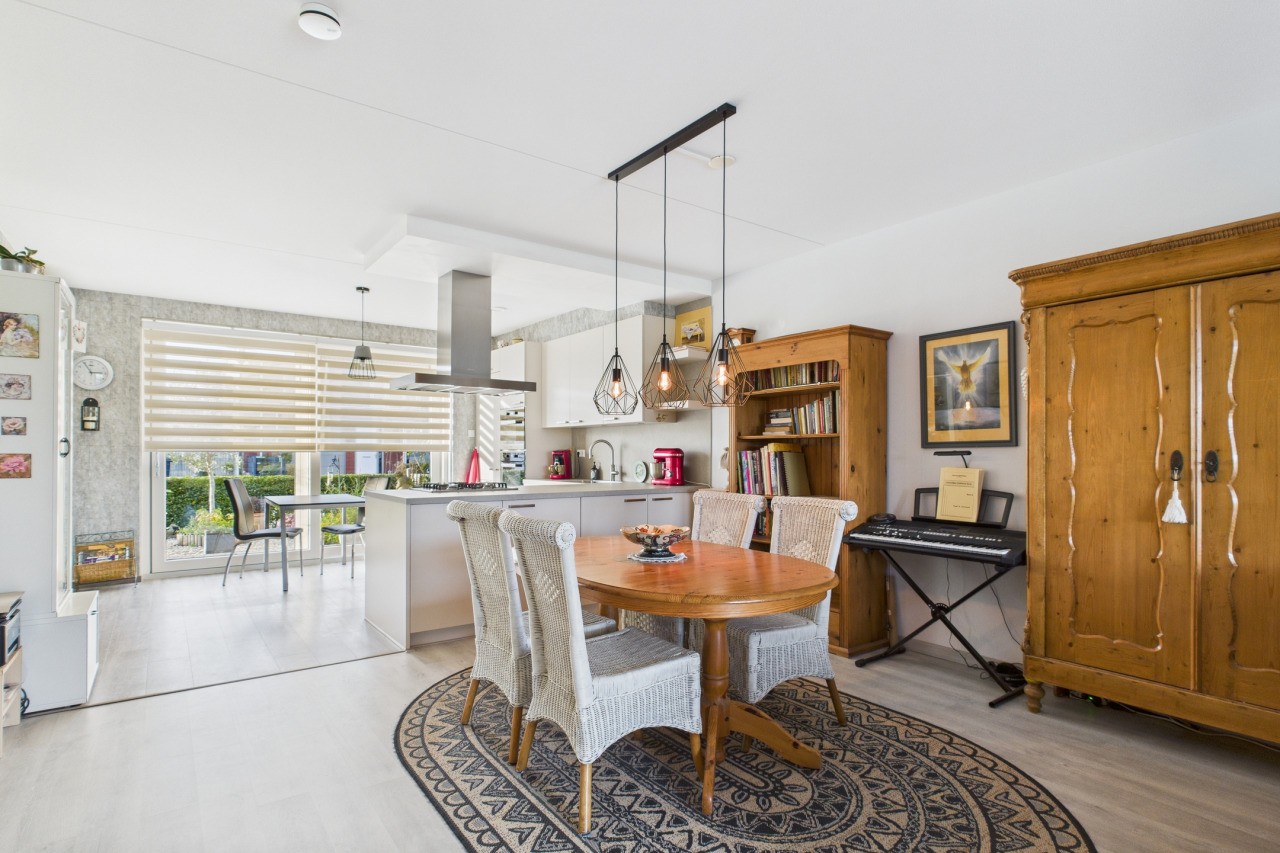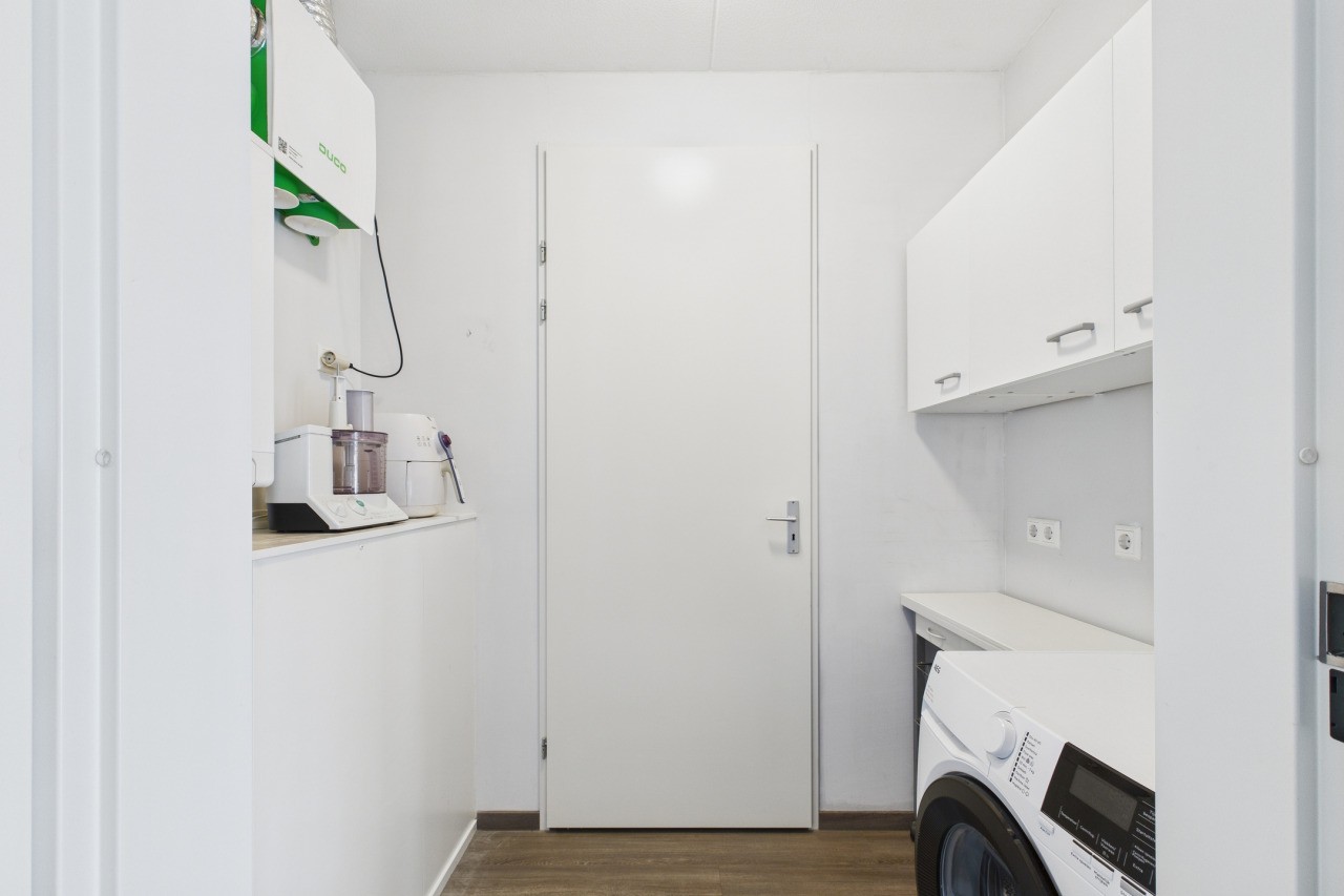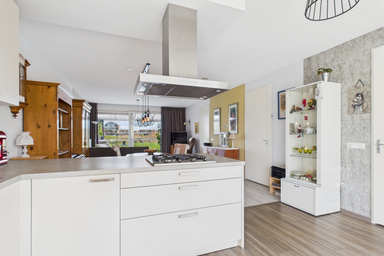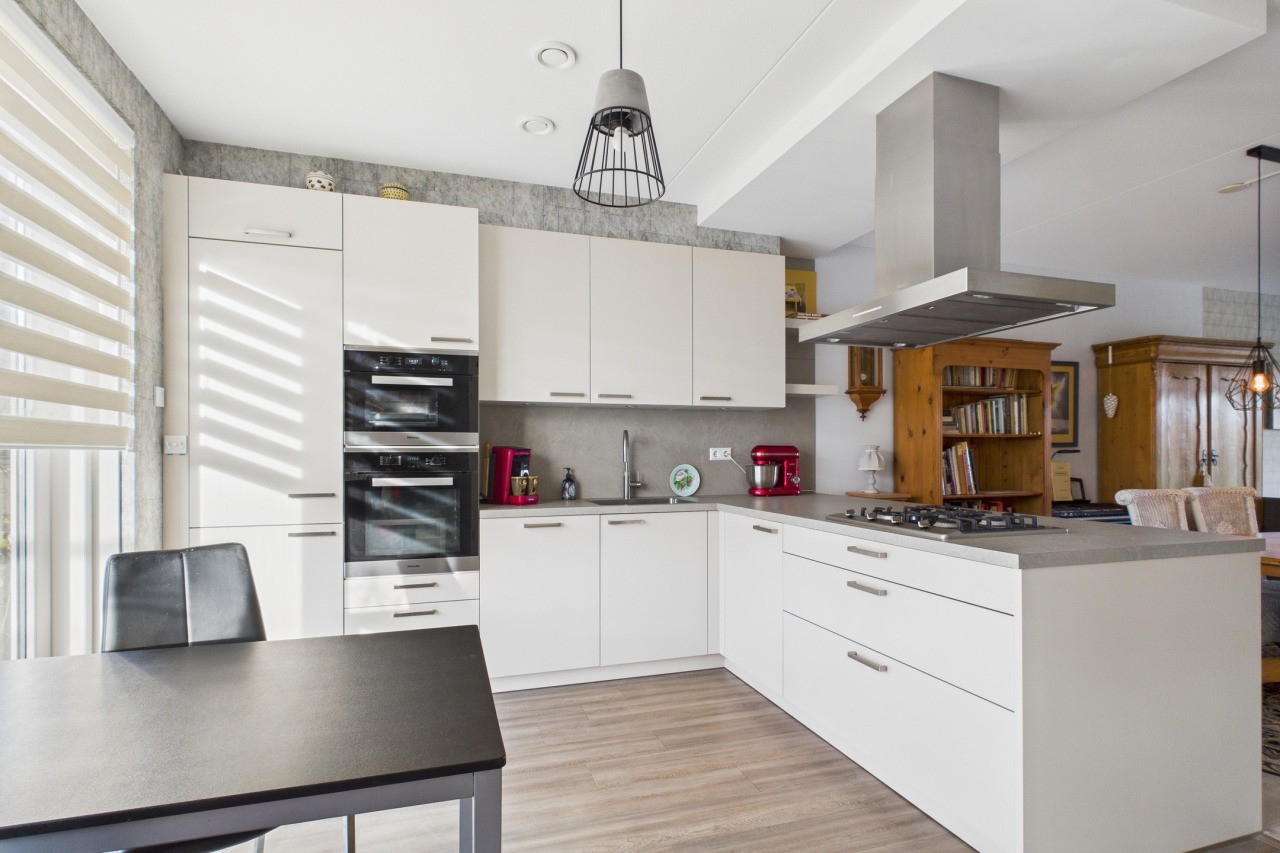 Vanuit de hal met meterkast en toilet met fonteintje stap je de ruime en moderne open keuken binnen. De keuken is geplaatst in een praktische hoekopstelling en voorzien van alle benodigde inbouwapparatuur, zoals o.a. een gaskookplaat, afzuigkap, oven en stoomoven, koelkast, vriezer, vaatwasser en een Quooker. De aanwezige airconditioning zorgt hier voor extra comfort, zowel in de zomer als in de winter. Vanuit de keuken bereik je de bijkeuken met witgoedaansluitingen en toegang tot de inpandige garage met elektrische deur.