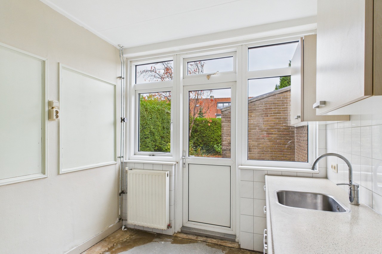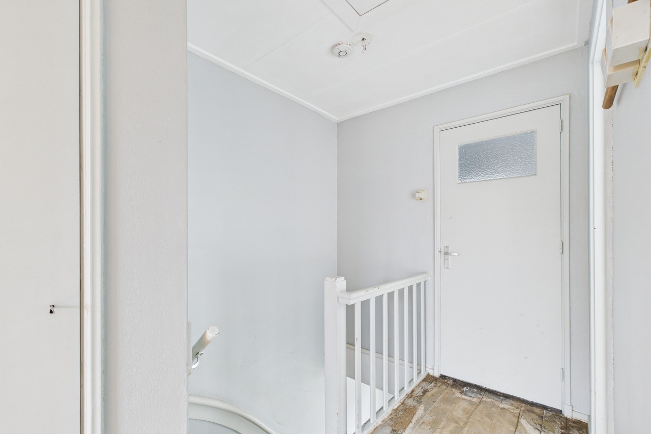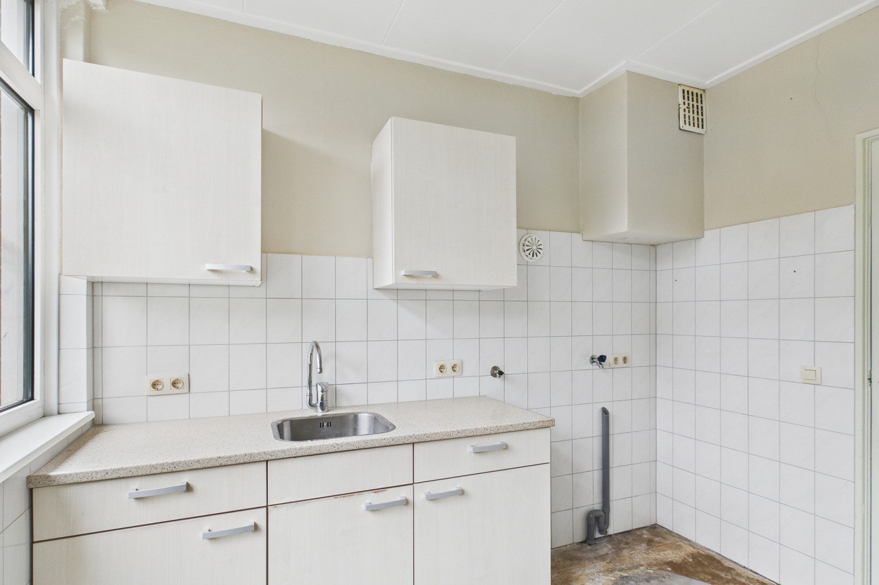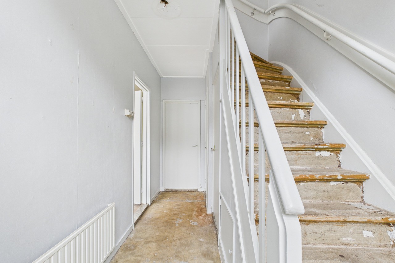 Hal met meterkast, trapopgang, trapkast en een eenvoudig toilet. Lichte doorzon woonkamer met vaste kastruimte en toegang tot de dichte keuken. De keuken is zowel vanuit de woonkamer als vanuit de hal bereikbaar en beschikt over vaste kasten, een eenvoudig keukenblok en een achterdeur naar de tuin.