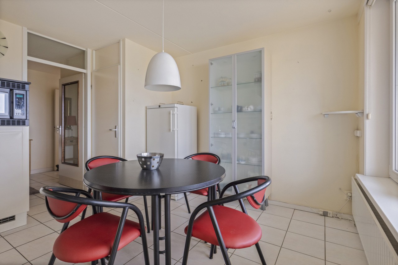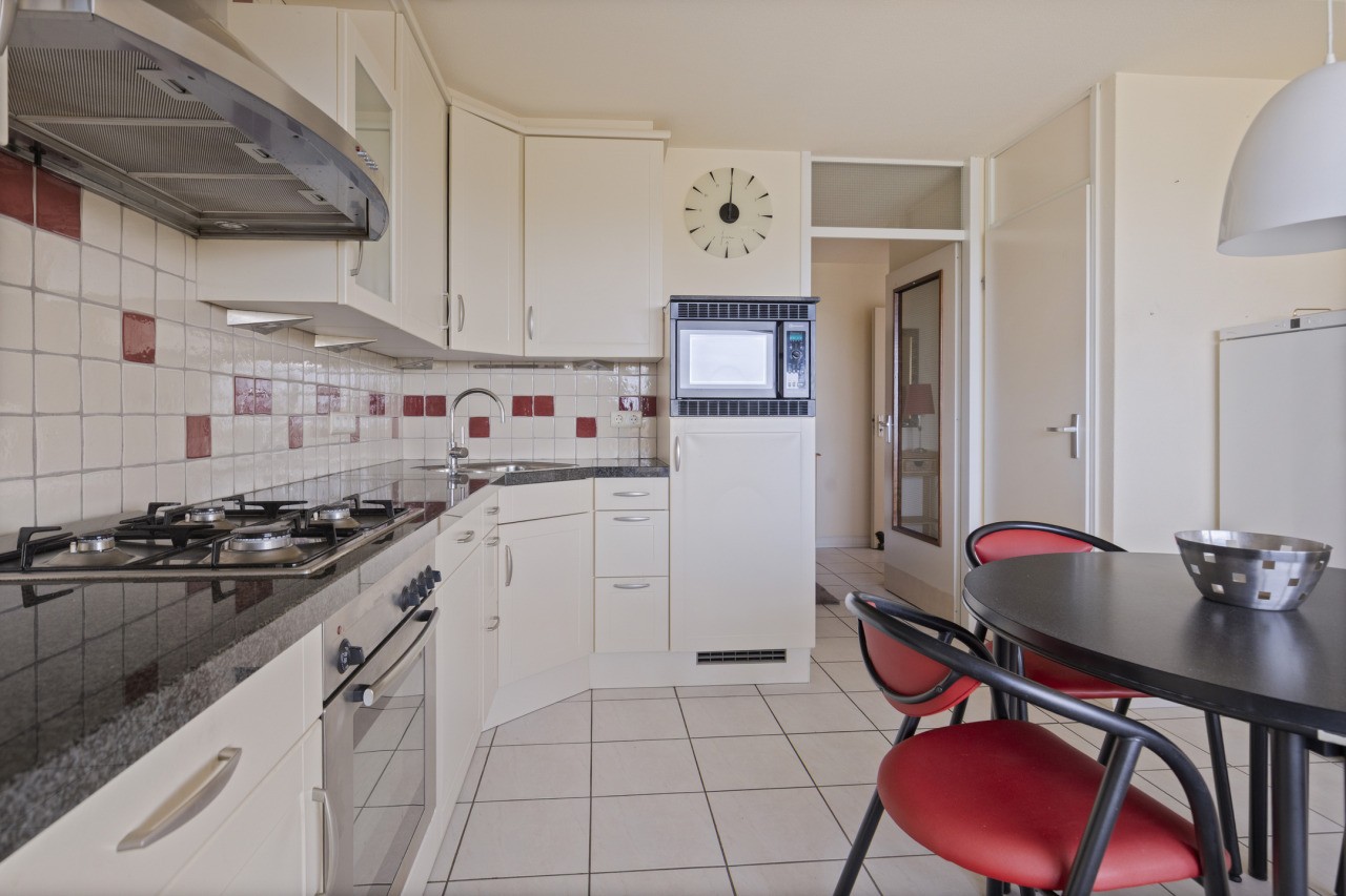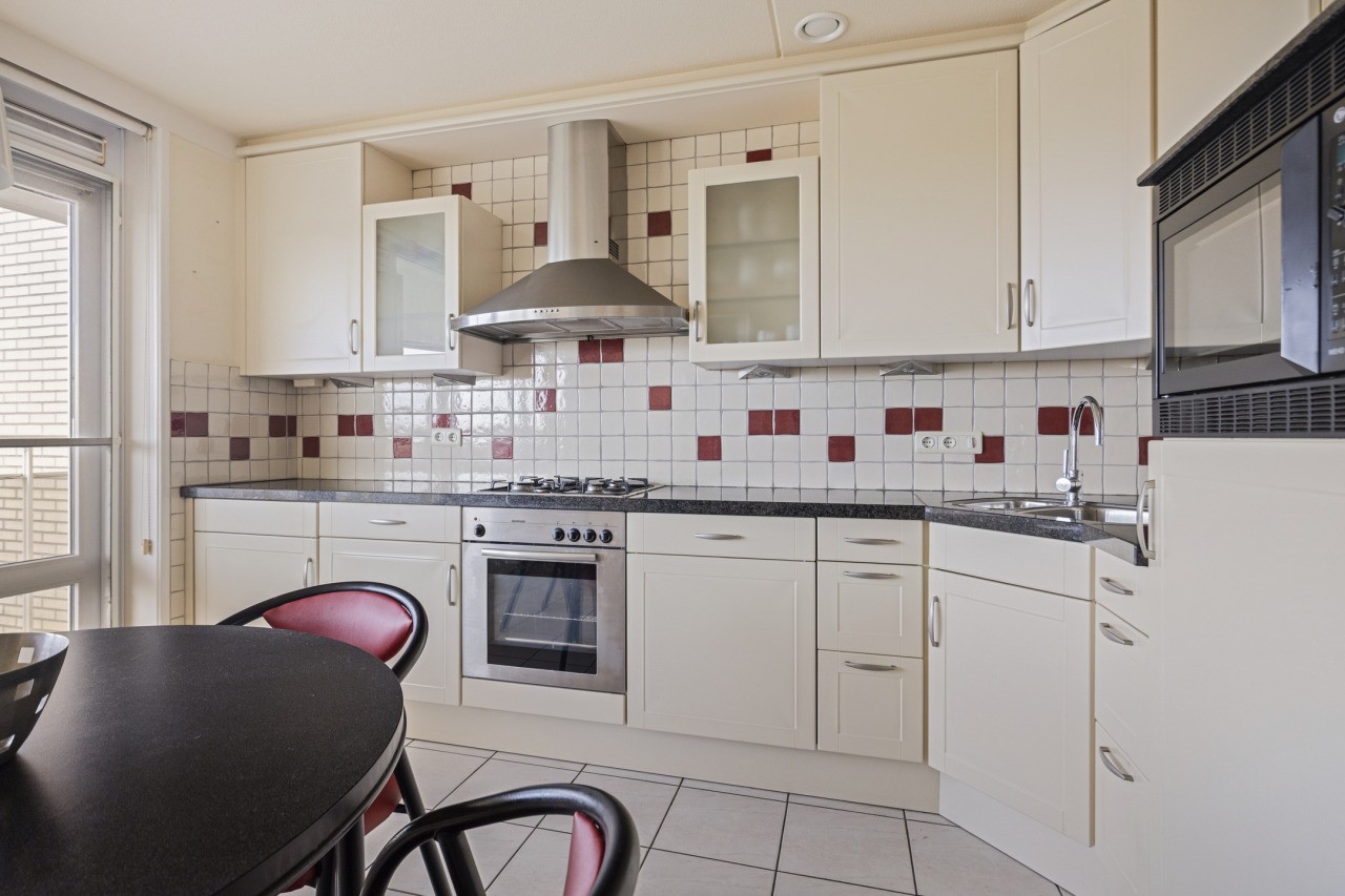 De woonkeuken is uitgevoerd in een rechte opstelling en voorzien van de benodigde inbouwapparatuur. Vanuit de keuken heb je toegang tot het zonnige balkon, waar je een fijne plek hebt om buiten te zitten met uitzicht over de stad.