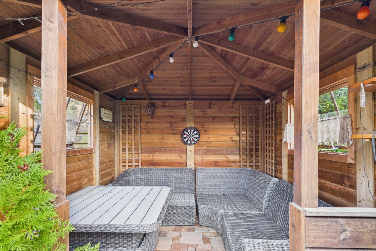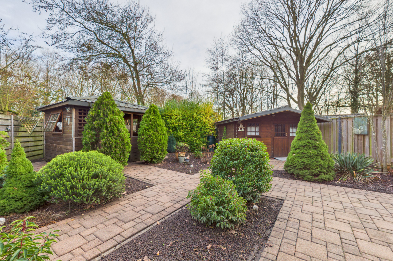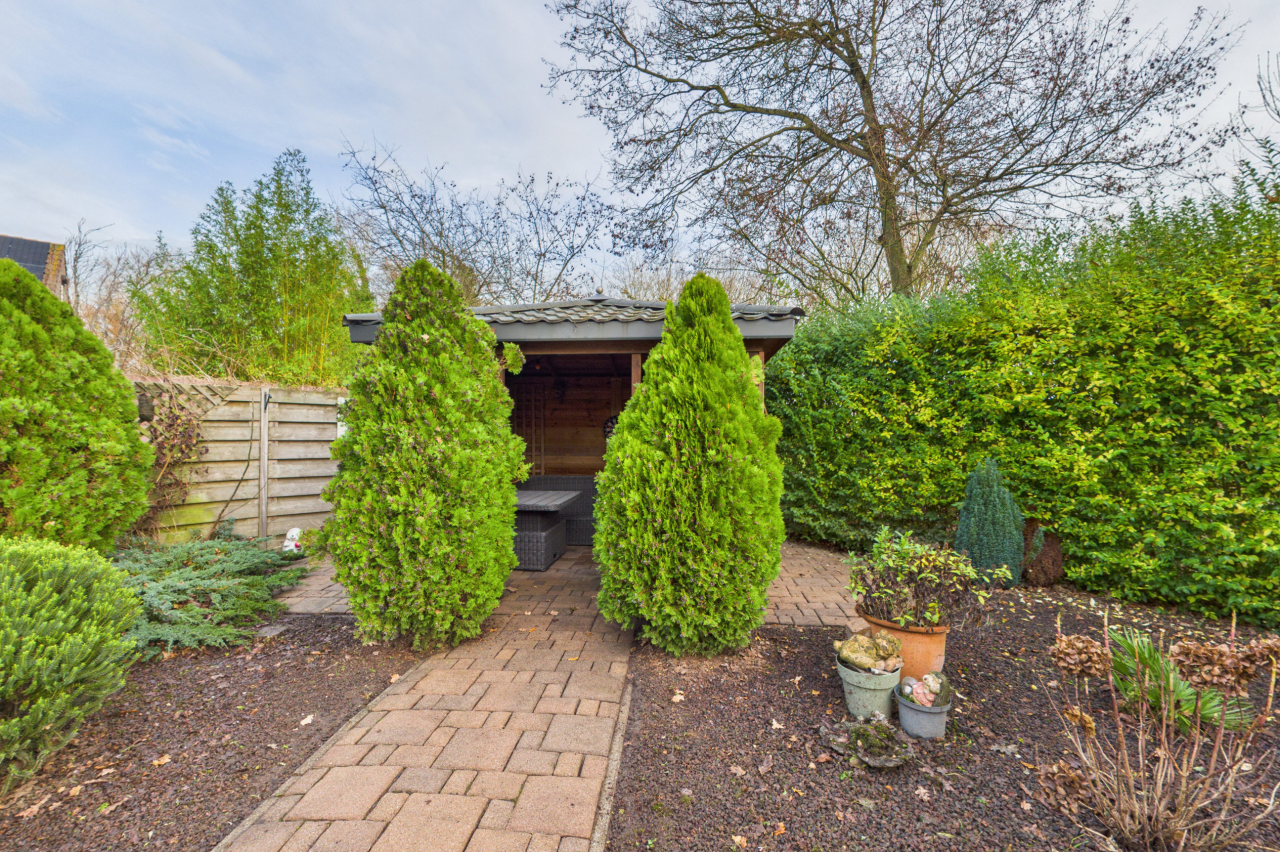 De tuin is een heerlijke plek om volop van het buitenleven te genieten. Dankzij de ligging op het zuidoosten kun je hier al vroeg op de dag van de zon genieten en tot in de middag buiten zitten. De tuin is met zorg aangelegd en biedt een prettige afwisseling van een ruim terras, groene plantenborders en een gezellige overkapping waar je ook op minder zonnige dagen fijn kunt verblijven. Het houten tuinhuis zorgt voor extra bergruimte en met de eigen achterom is de tuin bovendien praktisch en goed bereikbaar.