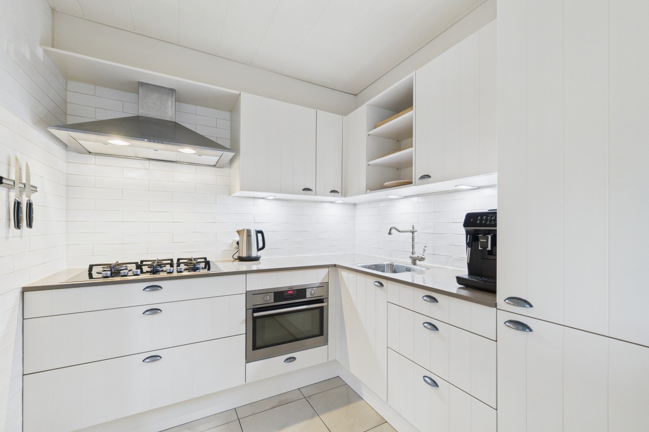 Je komt de woning binnen in de hal met meterkast, toilet en trapopgang naar de eerste verdieping. Vanuit de hal stap je de ruime en gezellige L-vormige woonkamer binnen, waar de sfeervolle haard zorgt voor warmte en gezelligheid. Aan de achterzijde verbindt een schuifpui de woonkamer met de tuin, waardoor binnen en buiten mooi in elkaar overlopen. De open keuken is praktisch opgesteld in een hoek en voorzien van een gaskookplaat, afzuigkap, combi-oven, koelkast en spoelbak. Vanuit de keuken heb je toegang tot de bijkeuken met aansluitingen voor witgoedapparatuur, een loopdeur naar de tuin en een directe doorgang naar de garage, wat zorgt voor extra gemak in het dagelijks gebruik.