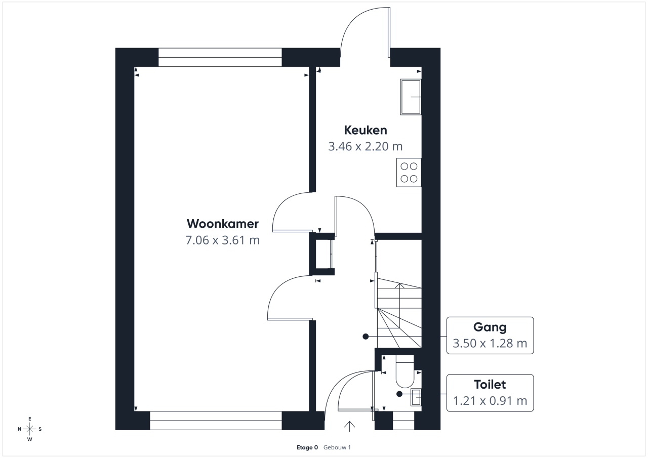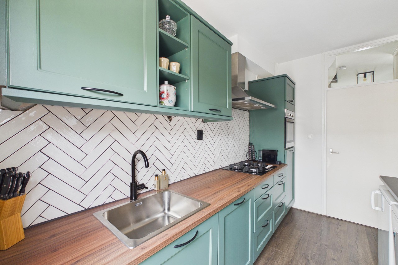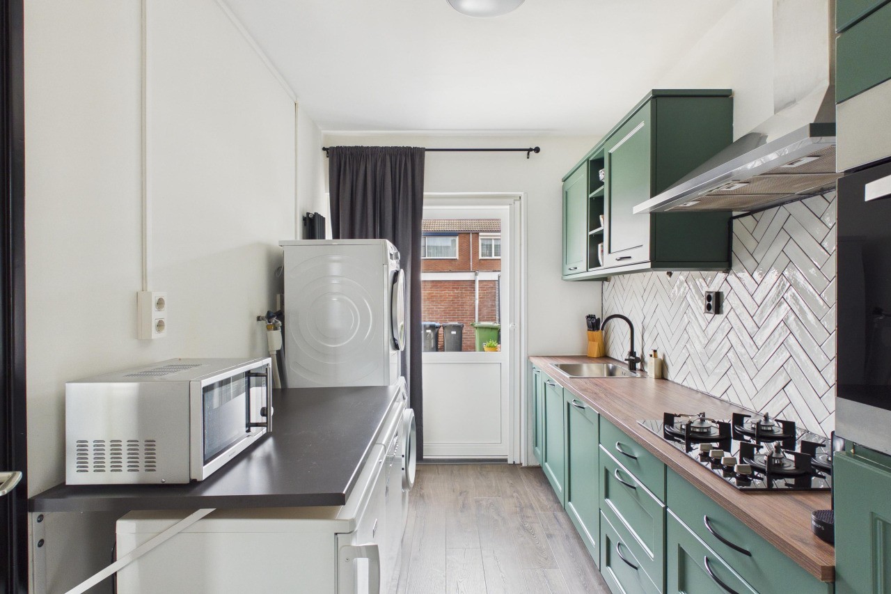 Bij binnenkomst kom je in de hal met meterkast, toilet, praktische bergkast en de trap naar boven. Vanuit hier loop je door naar de woonkamer en de keuken. De doorzonwoonkamer is ruim en aangenaam licht, met een nette laminaatvloer die zorgt voor een rustige uitstraling. De dichte keuken is uitgevoerd met een verzorgde inbouwopstelling, voorzien van onder andere een gaskookplaat, afzuigkap, oven en koelkast. Ook de witgoedaansluiting bevindt zich hier, wat het geheel extra praktisch maakt. Vanuit de keuken stap je zo de achtertuin in.