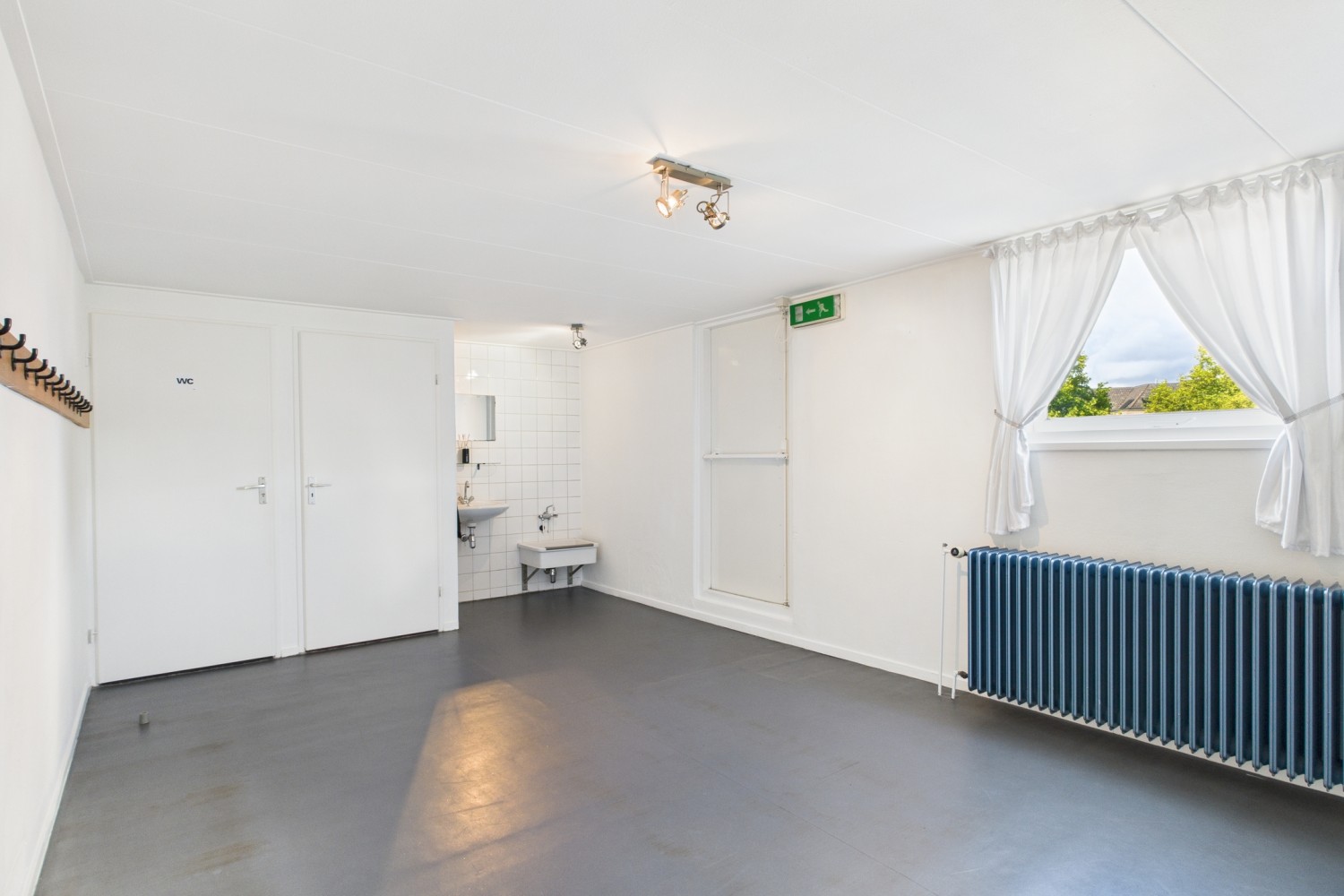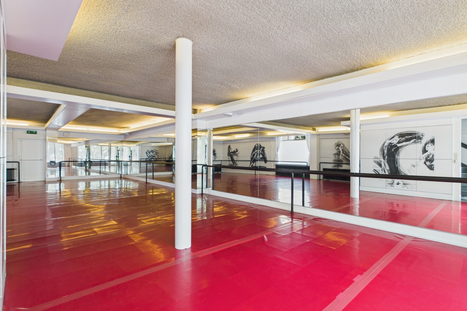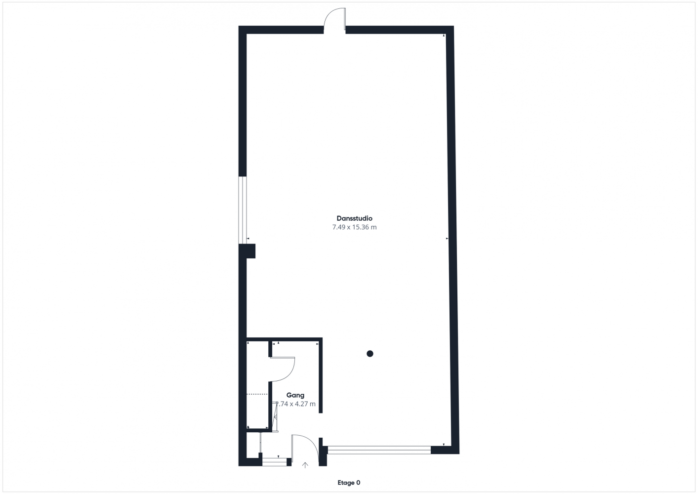 Bij binnenkomst stap je de hal in, waar ook de trapopgang en een handige trapkast te vinden zijn. Vanuit hier loop je door naar de royale dansstudio die tot voor kort het hart van deze locatie vormde. De ruimte is indrukwekkend groot en biedt tal van mogelijkheden voor herinrichting of alternatief gebruik. Aan de achterzijde is een nooduitgang die toegang geeft tot de brandgang en achtertuin.