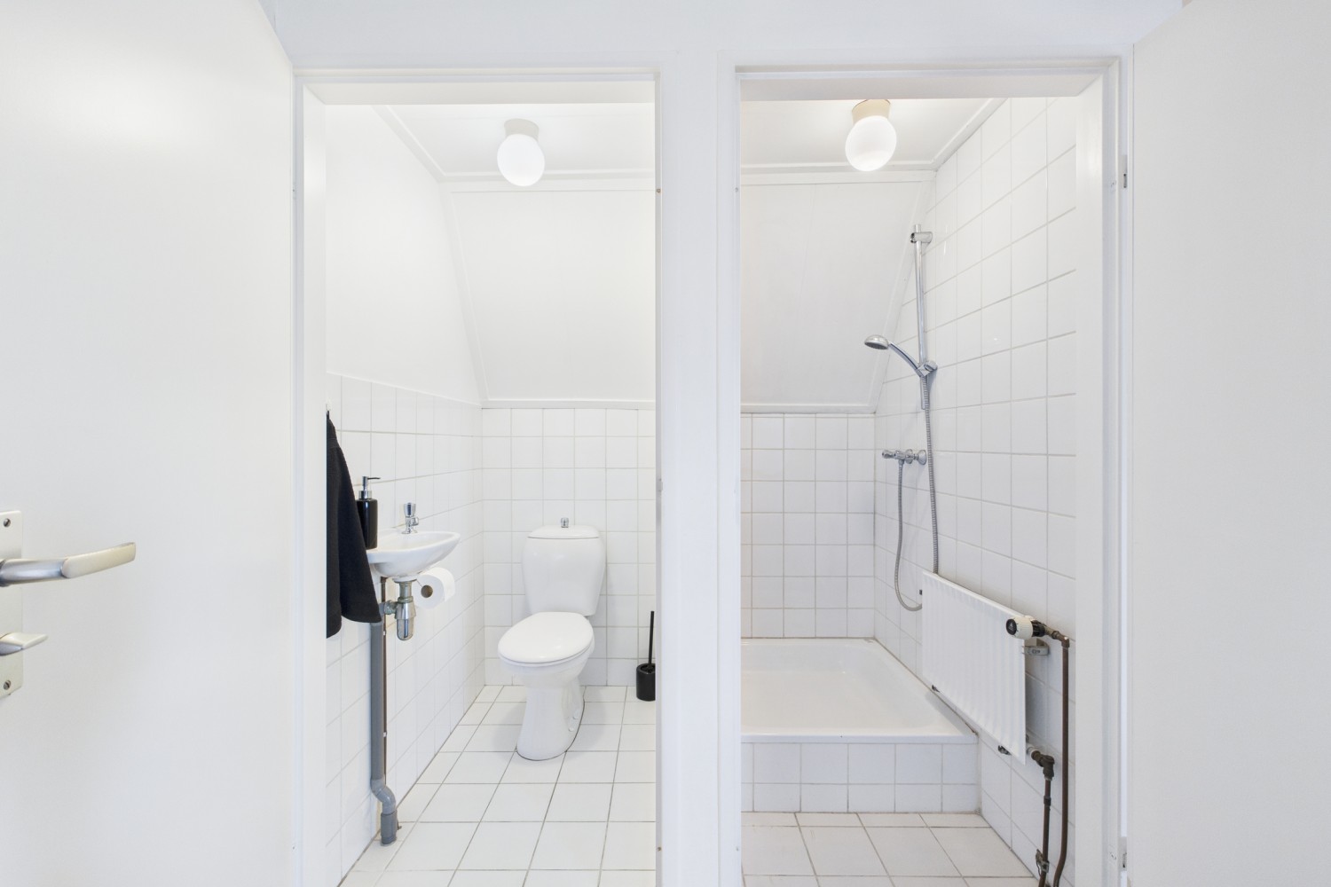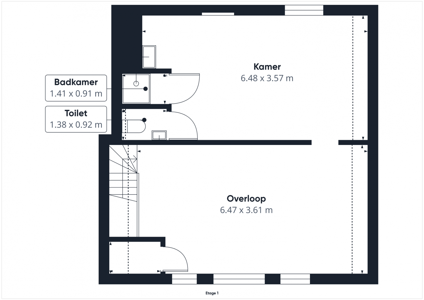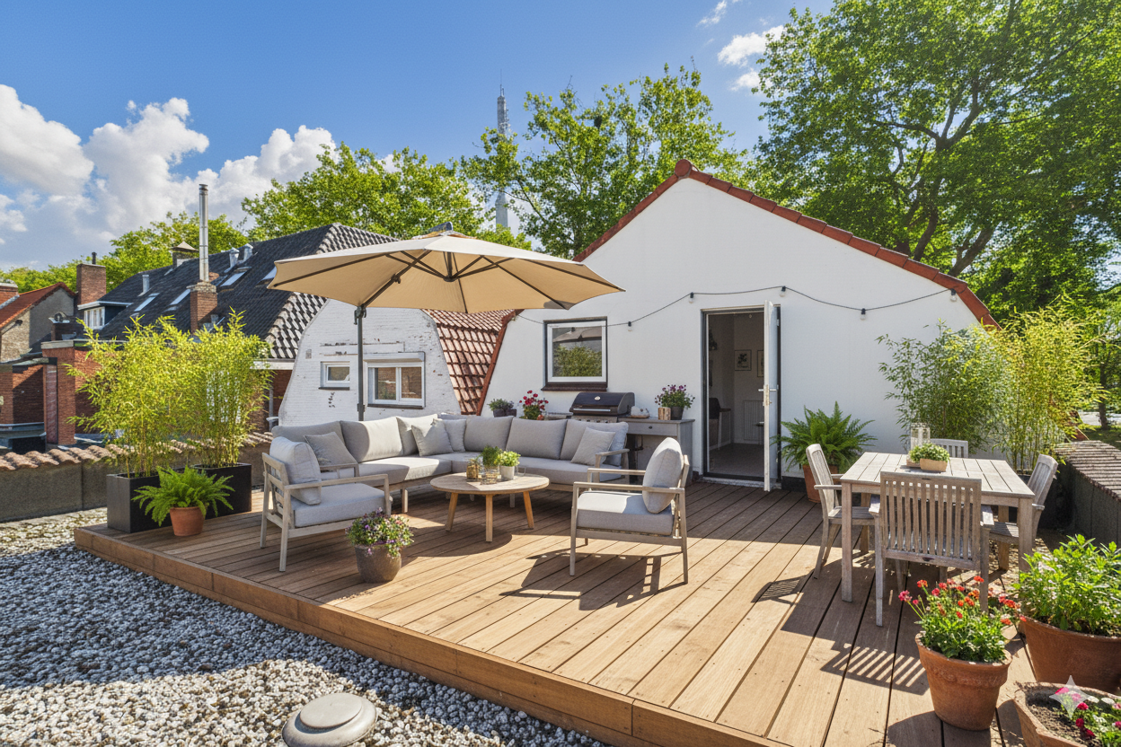 Op de eerste verdieping valt meteen de zeer ruime overloop op, waar zich ook de stookruimte bevindt. Daarnaast is er een kamer ingericht met twee wastafels, een separate douche en een apart toilet. Vanuit deze kamer is er toegang naar het dakterras aan de achterzijde, waar je een extra buitenruimte tot je beschikking hebt.