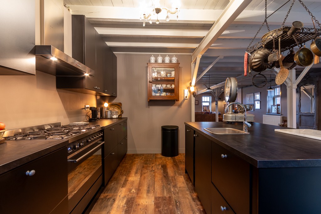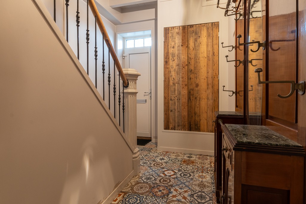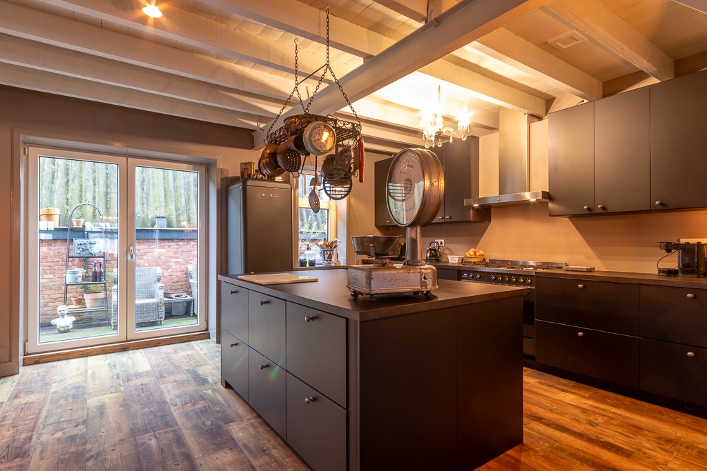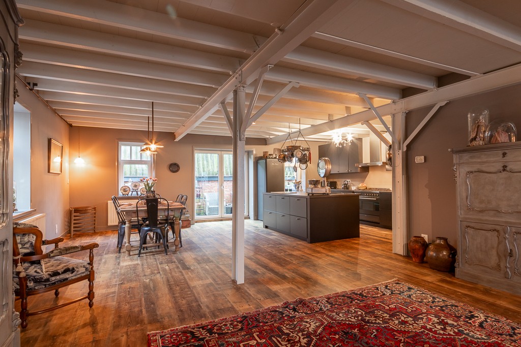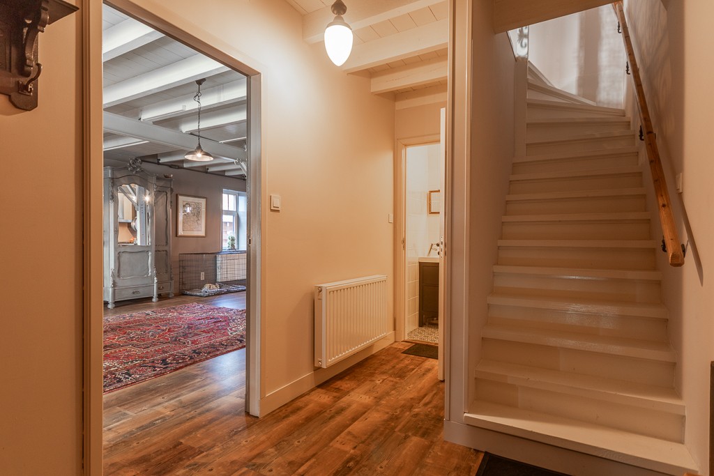 Overloop met bergkast, toilet (zwevend met fonteintje), trapopgang naar de tweede verdieping en toegang tot de woonkamer. De royale, sfeervolle woonkamer met balkenplafond en authentieke details maken dit een fijne ruimte om tot rust te komen na een lange werkdag. De grote, open keuken is ingericht met een SMEG gasfornuis met oven, afzuigkap, vaatwasser en een spoeleiland. Via de openslaande deuren kom je op het zonneterras, waar het heerlijk toeven is in de avondzon.