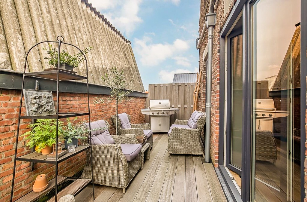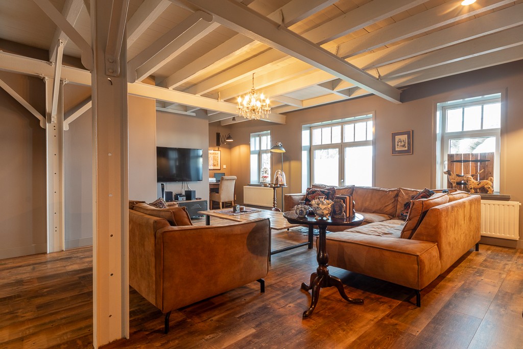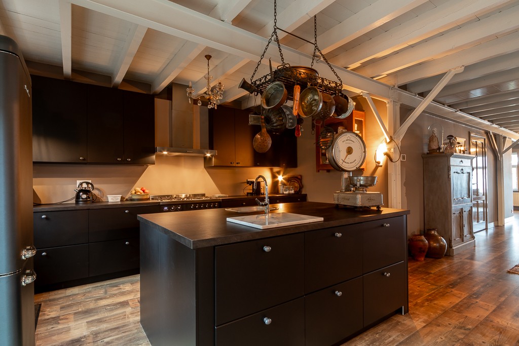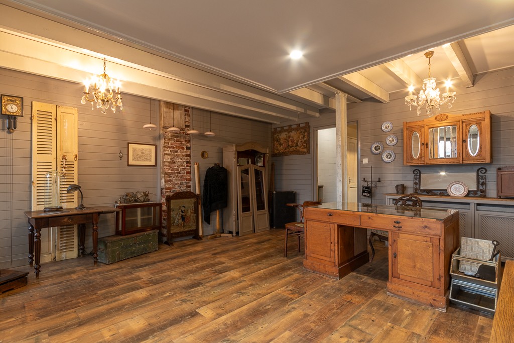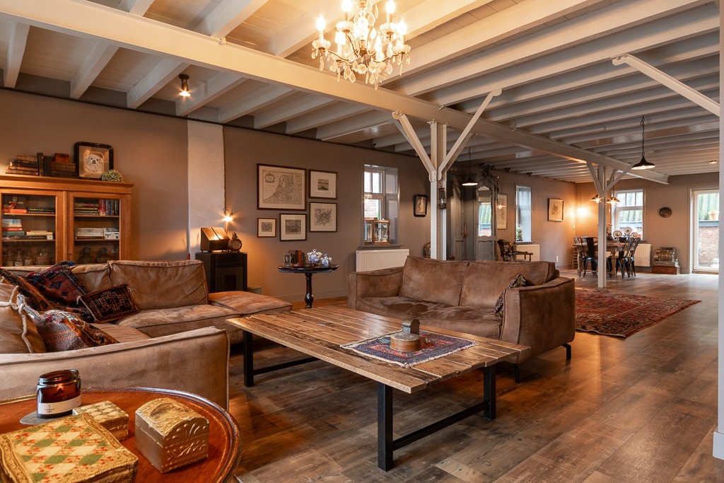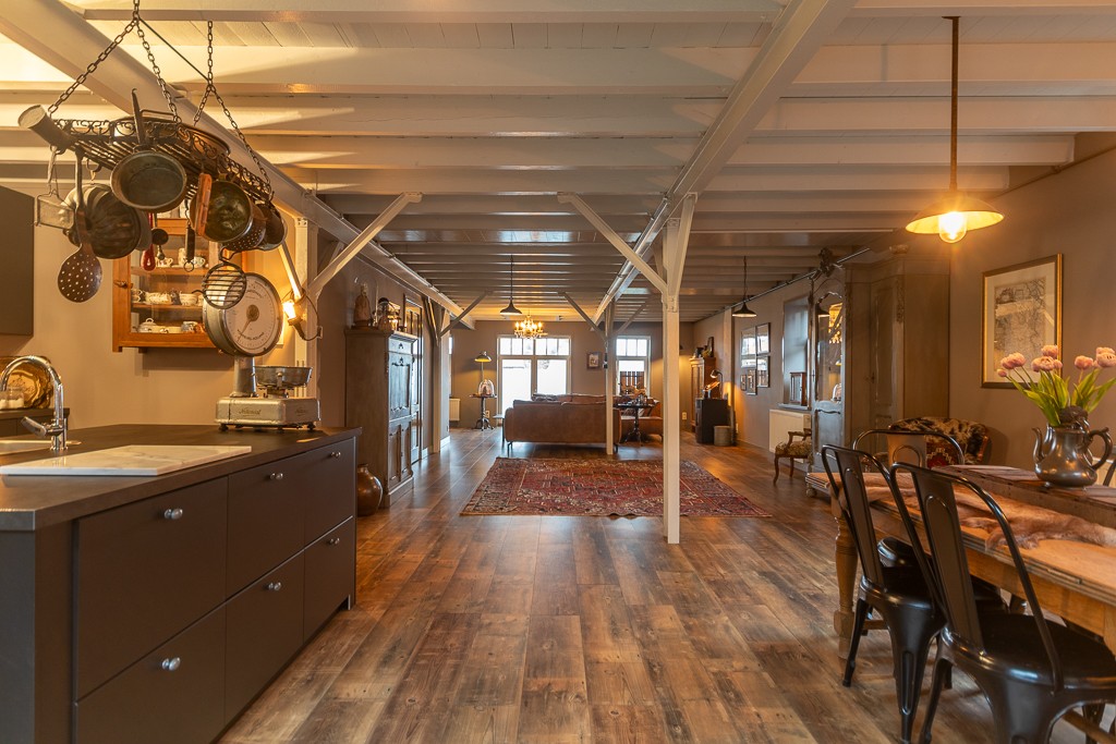 Overloop met bergkast, toilet (zwevend met fonteintje), trapopgang naar de tweede verdieping en toegang tot de woonkamer. De royale, sfeervolle woonkamer met balkenplafond en authentieke details maken dit een fijne ruimte om tot rust te komen na een lange werkdag. De grote, open keuken is ingericht met een SMEG gasfornuis met oven, afzuigkap, vaatwasser en een spoeleiland. Via de openslaande deuren kom je op het zonneterras, waar het heerlijk toeven is in de avondzon.