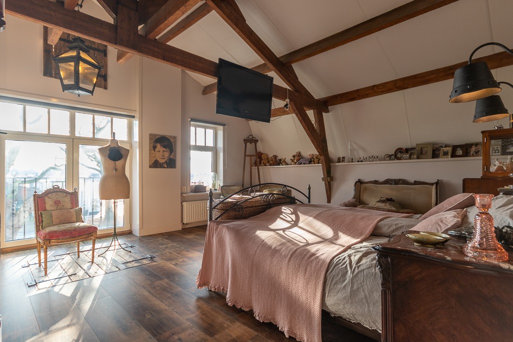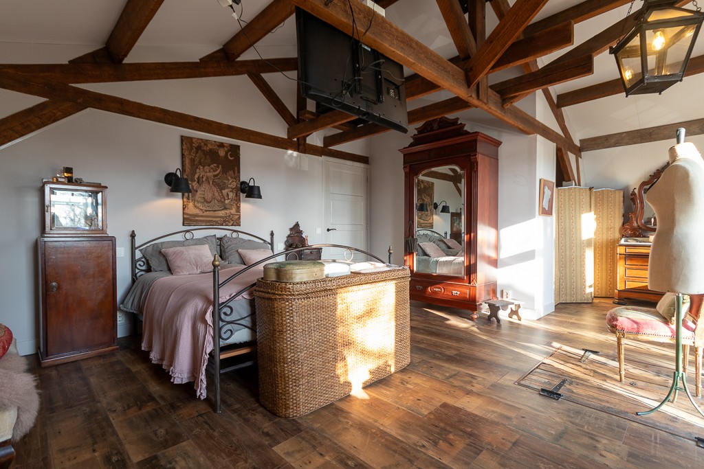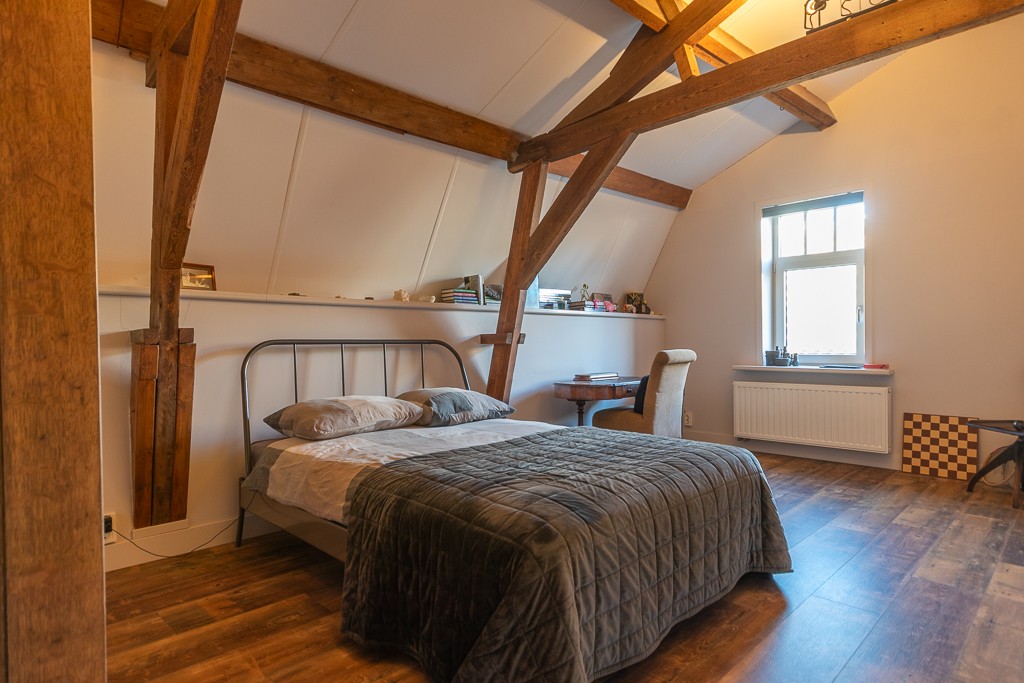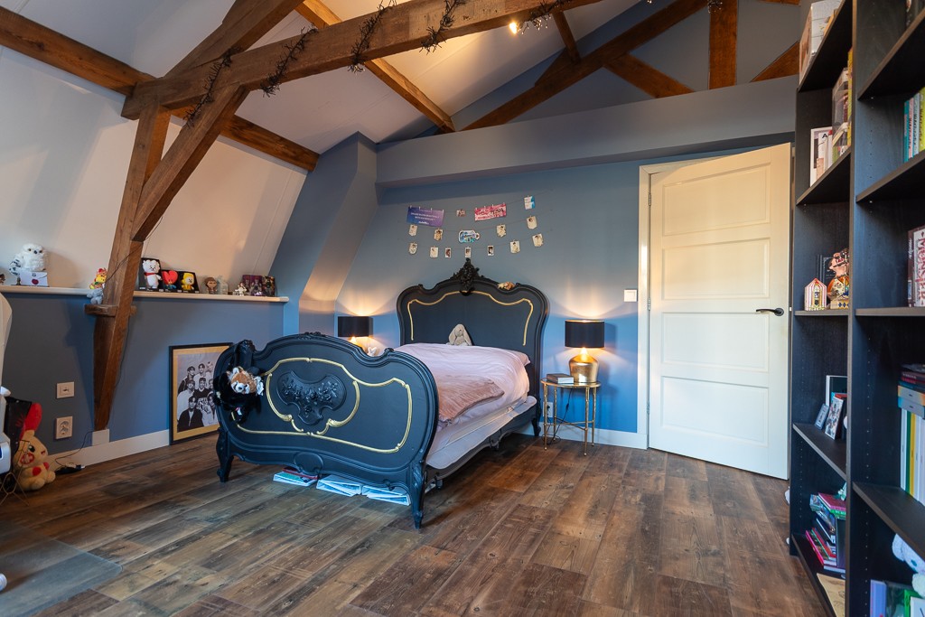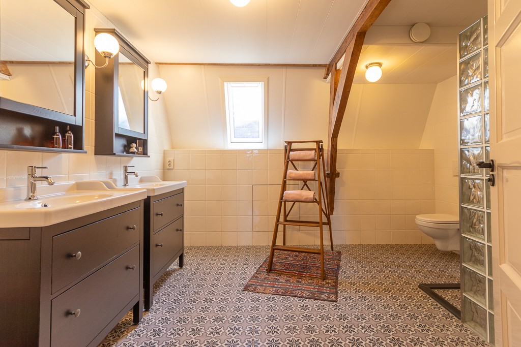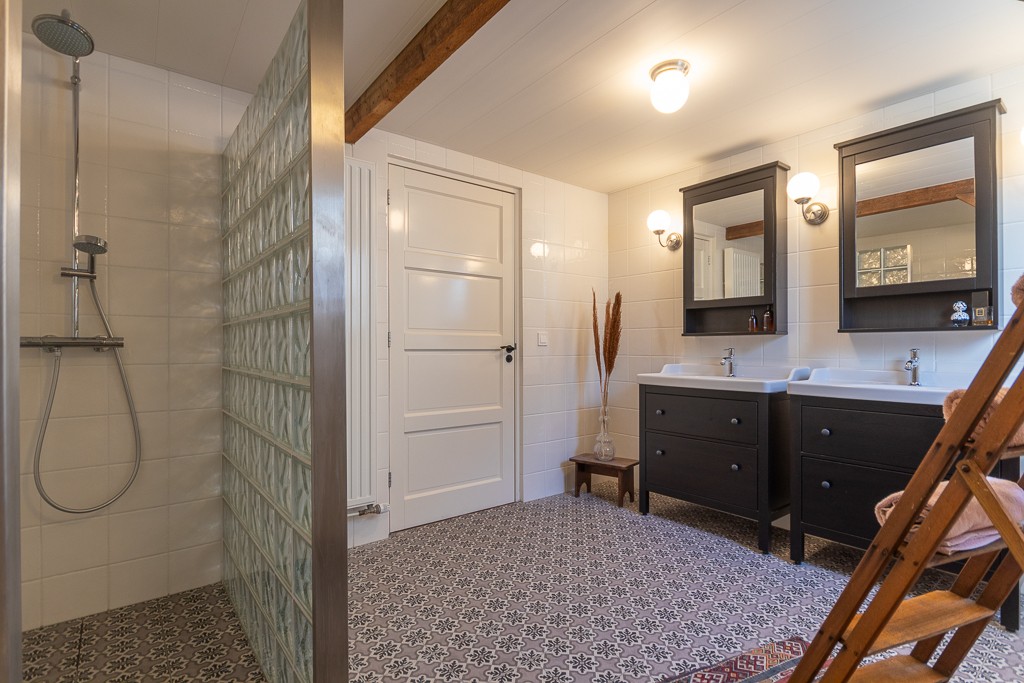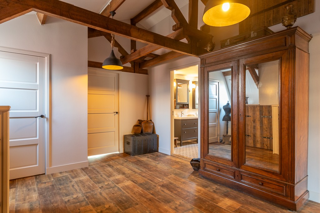 De overloop geeft toegang tot drie slaapkamers, de badkamer en de garderobe/inloopkast. Ook op deze verdieping voeren de prachtige authentieke balkenplafonds de boventoon. De badkamer is uitgerust met een grote inloopdouche, twee aparte wastafels met meubel en een hangtoilet. Via de overloop heb je toegang tot de vliering met praktische bergruimte.