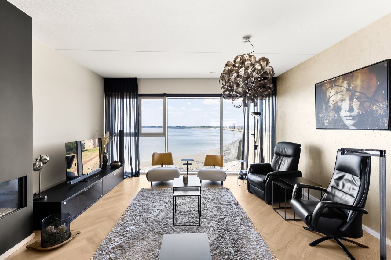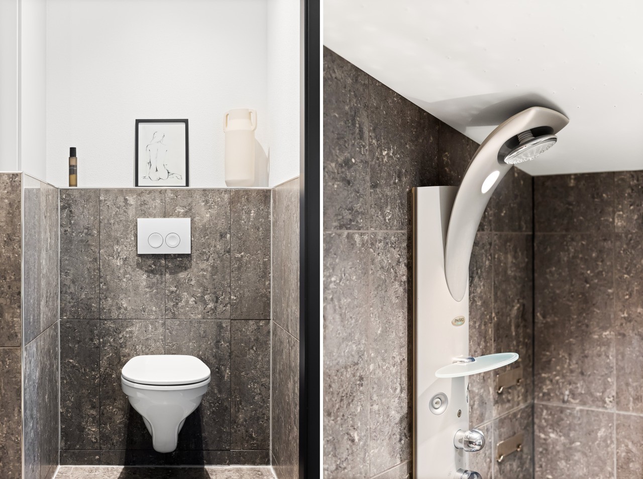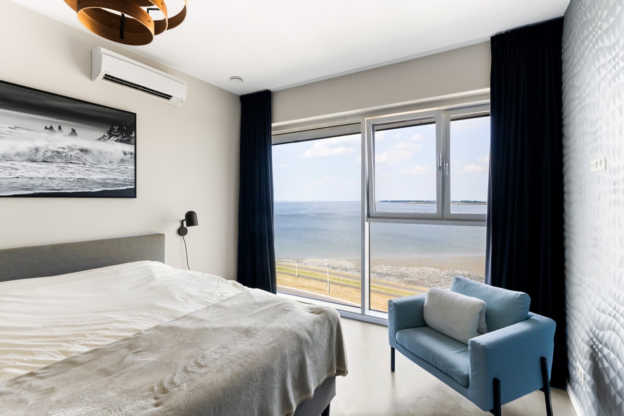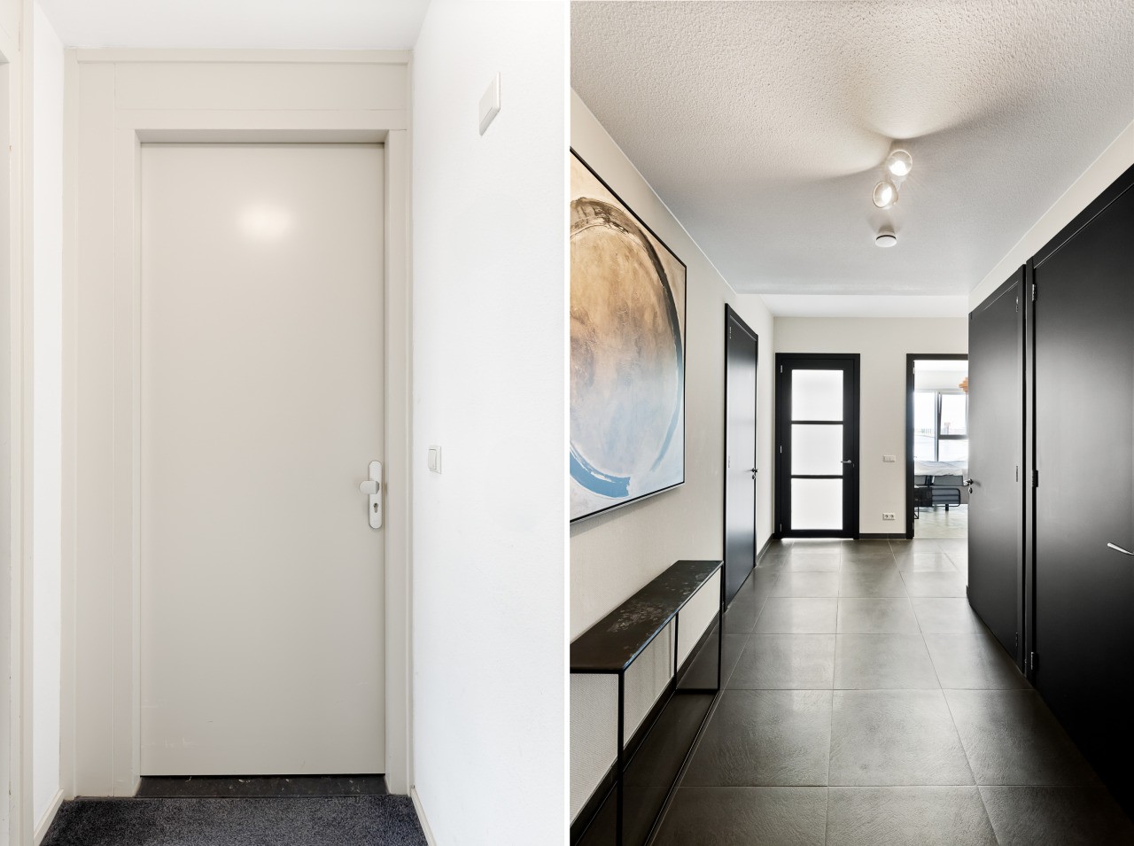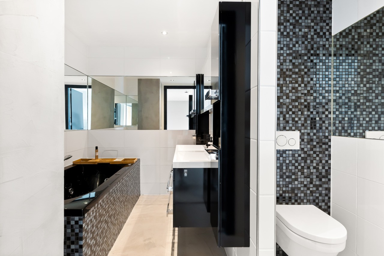 Via de ruime hal met videofooninstallatie en stijlvolle donkere vloertegels betreed je het penthouse. Hier bevinden zich het gastentoilet, een praktische berging met witgoedaansluitingen, twee royale slaapkamers met uitzicht op zee én een luxe badkamer met dubbele waskommen, maatwerkkasten, vrijstaand ligbad en een wellnessruimte met stoomfunctie en massagedouche.