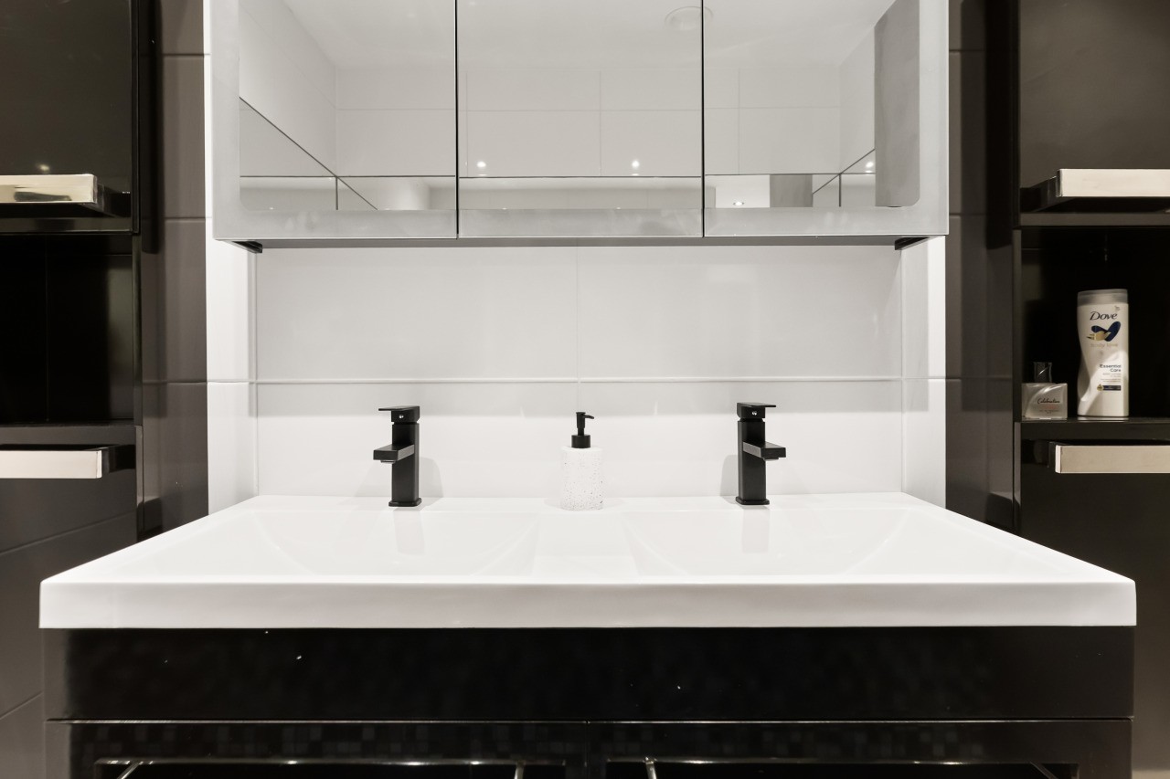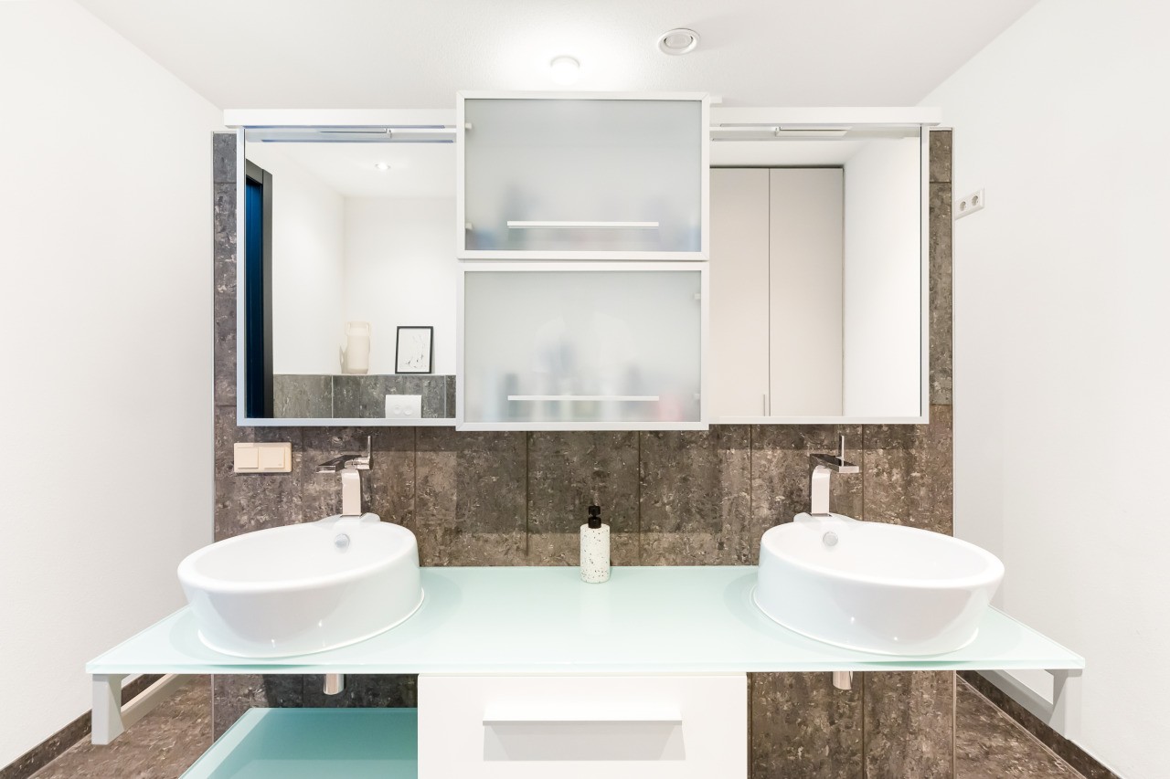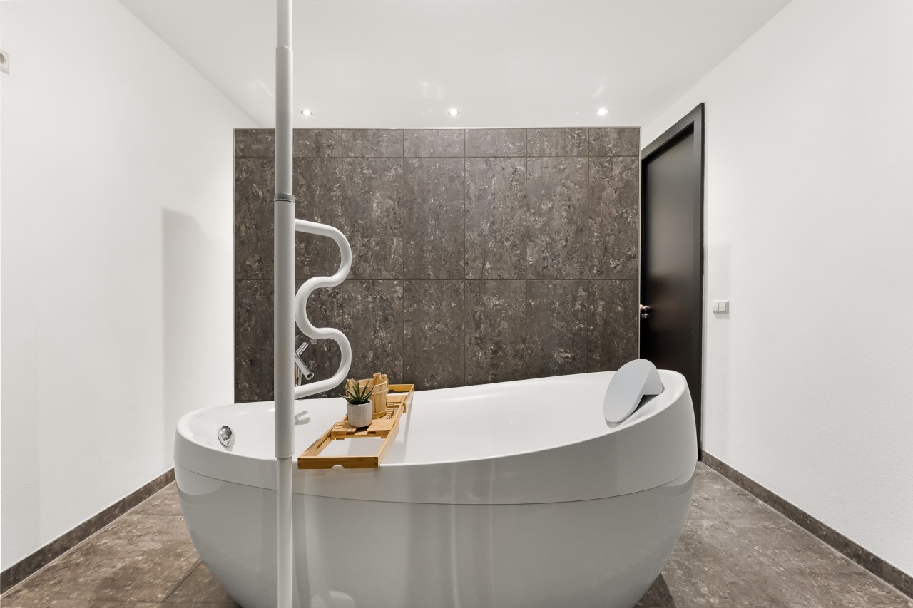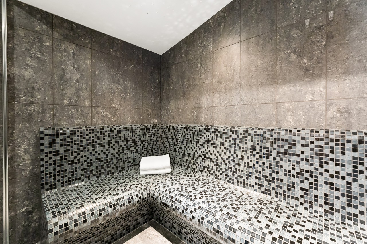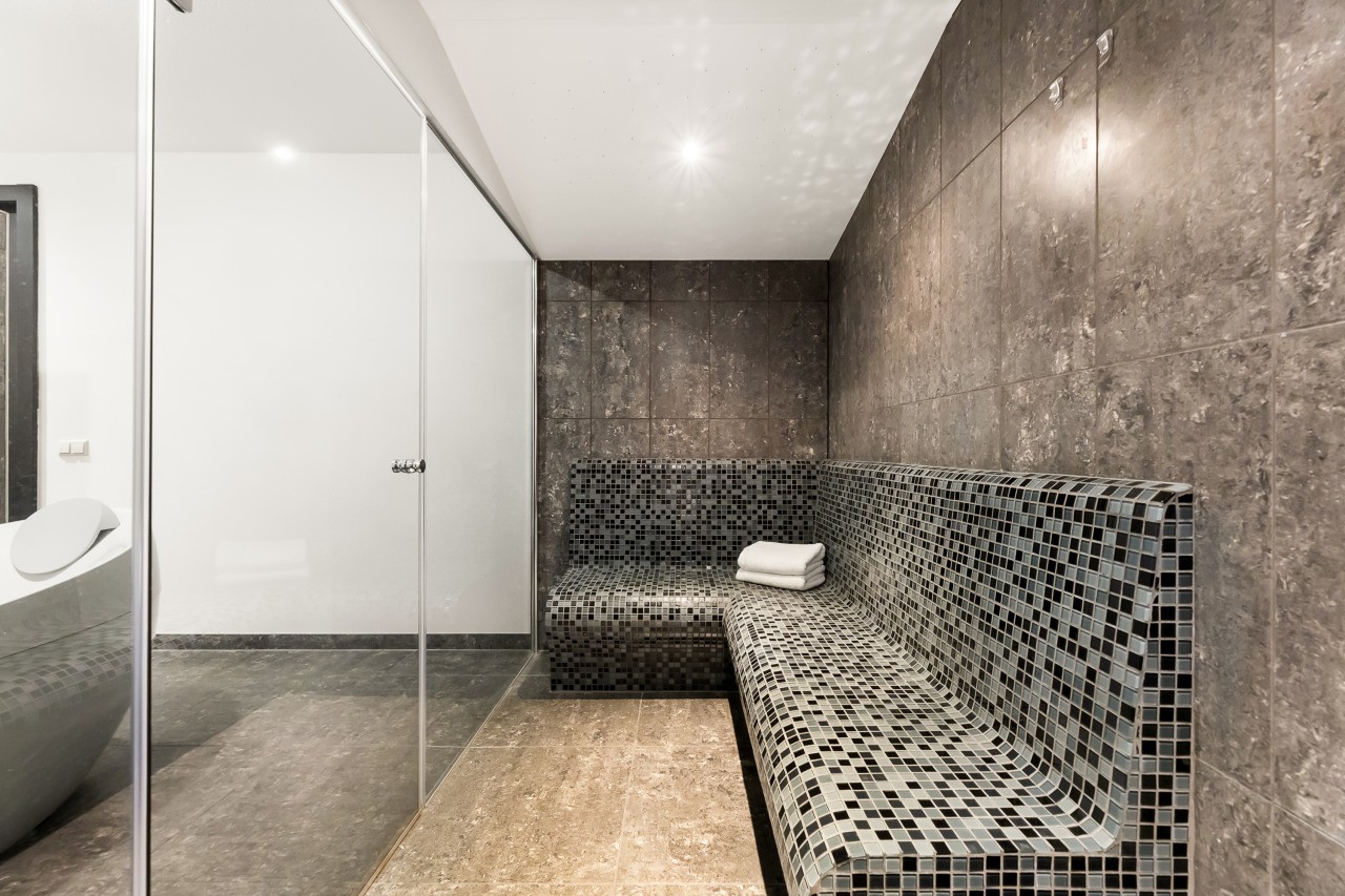 Via de ruime hal met videofooninstallatie en stijlvolle donkere vloertegels betreed je het penthouse. Hier bevinden zich het gastentoilet, een praktische berging met witgoedaansluitingen, twee royale slaapkamers met uitzicht op zee én een luxe badkamer met dubbele waskommen, maatwerkkasten, vrijstaand ligbad en een wellnessruimte met stoomfunctie en massagedouche.