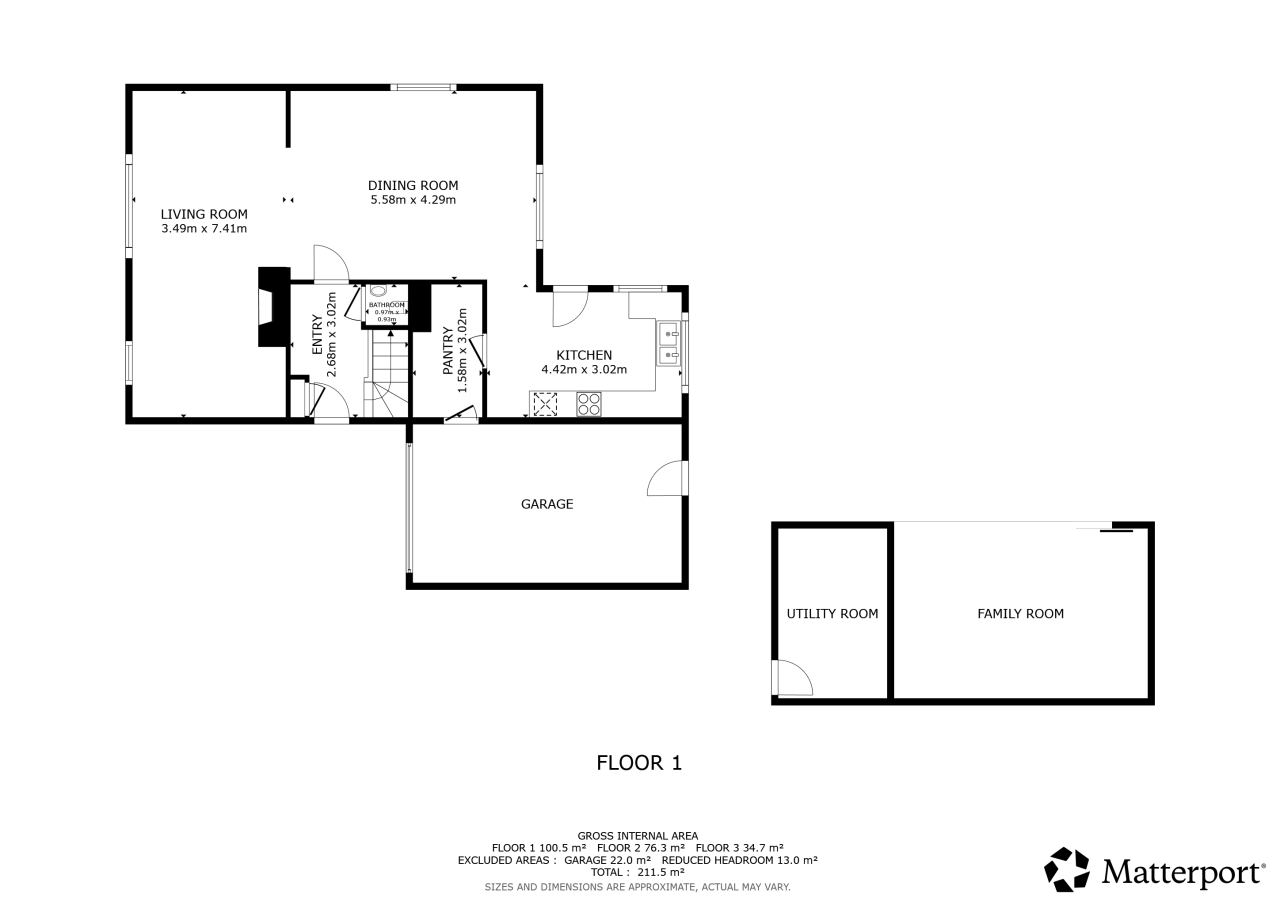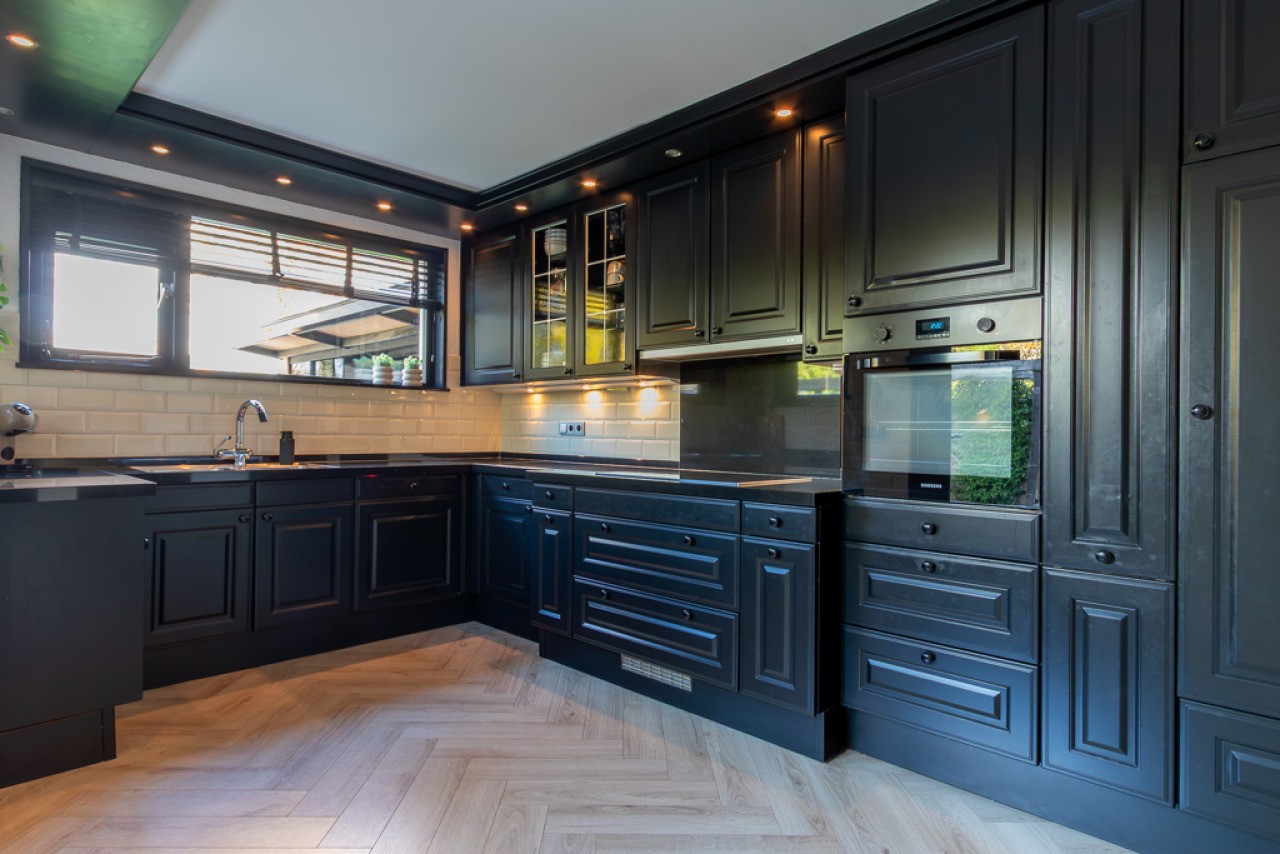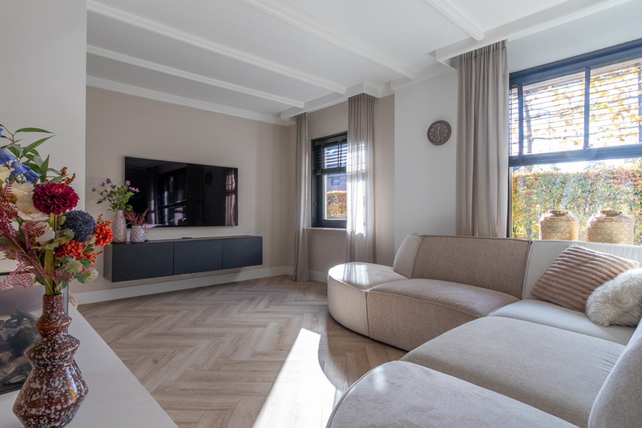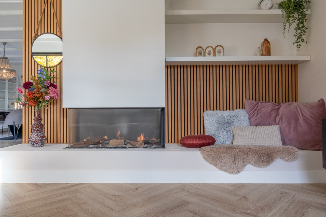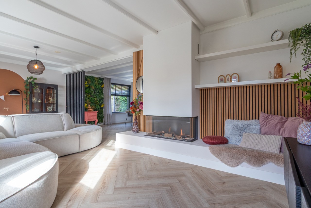 Bij binnenkomst in de hal valt direct de verzorgde uitstraling op. Vanuit hier bereik je de trapopgang, de meterkast en een modern toilet met fonteintje. De L-vormige doorzonwoonkamer voelt licht en ruim aan, met een sfeervolle sierhaard en een eethoek met prachtig uitzicht op de achtertuin. De zwarte U-keuken is van alle gemakken voorzien en biedt toegang tot de bijkeuken, die weer doorloopt naar de inpandige garage – ideaal voor fietsen, opslag of een extra werkruimte.