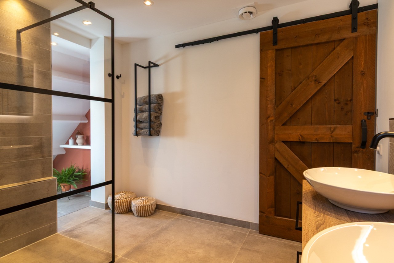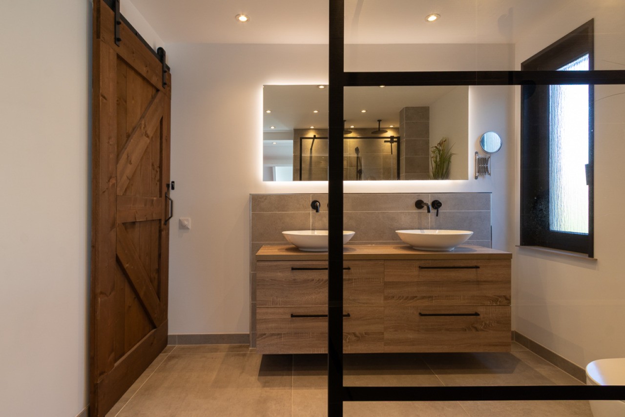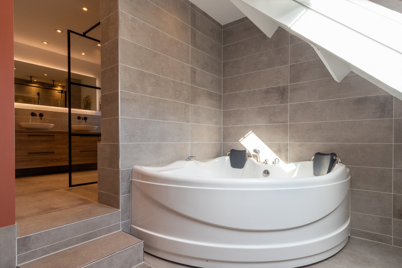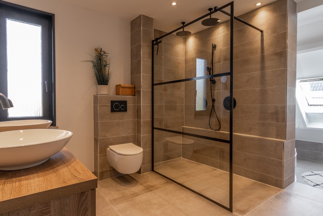 Op de eerste verdieping vind je 3 slaapkamers, waarvan de royale ouderslaapkamer een grote dressing heeft. De badkamer is modern en comfortabel, met een inloopdouche voorzien van dubbele douchekop, een dubbel wastafelmeubel en toilet, en een aparte ruimte met een ruim ligbad – ideaal om na een lange dag te ontspannen.
