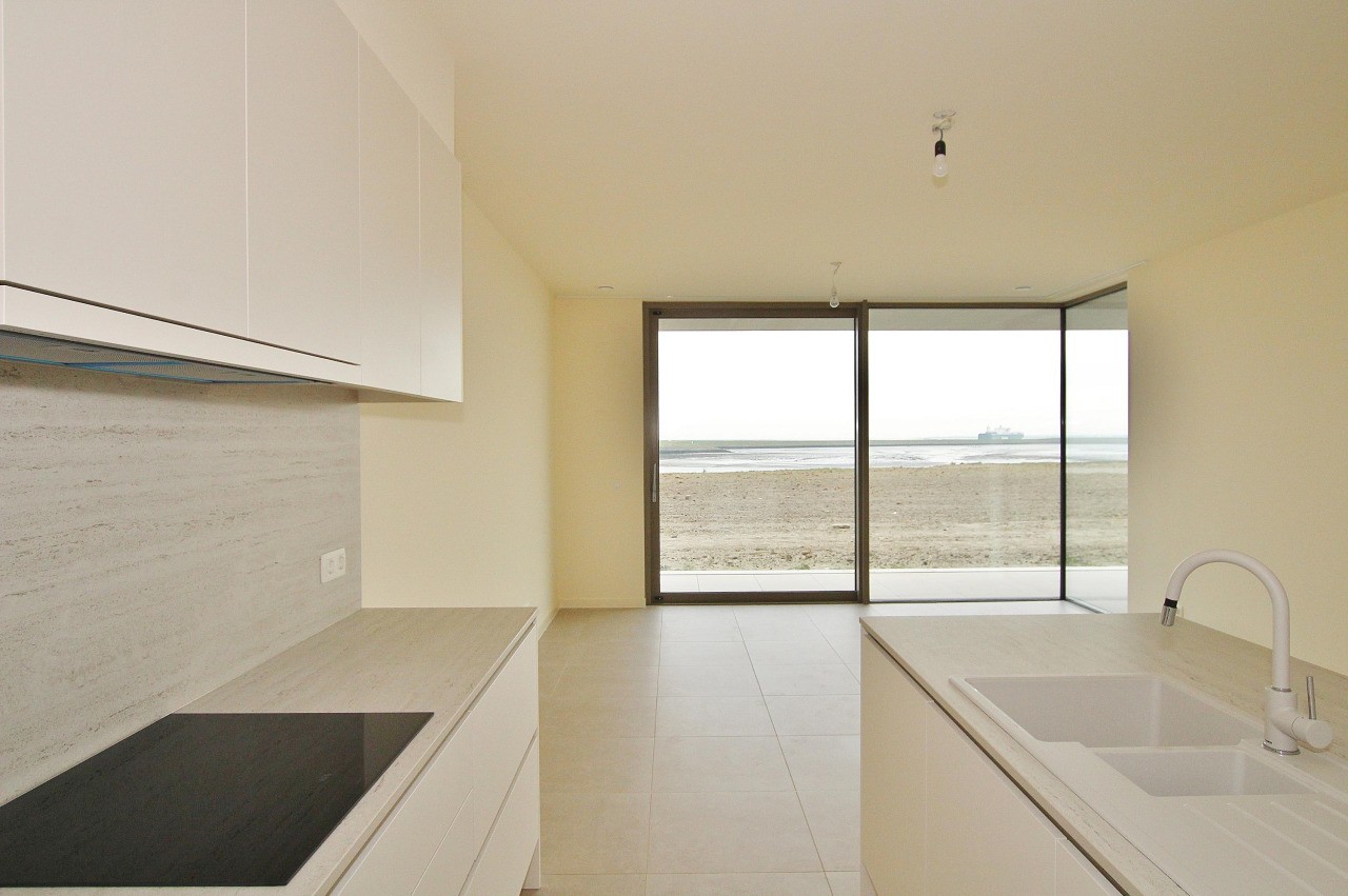 De ruime woonkamer met open keuken vormt het hart van de woning. Dankzij de grote schuifpuien staat de leefruimte in direct contact met het terras en het indrukwekkende uitzicht over de Westerschelde.