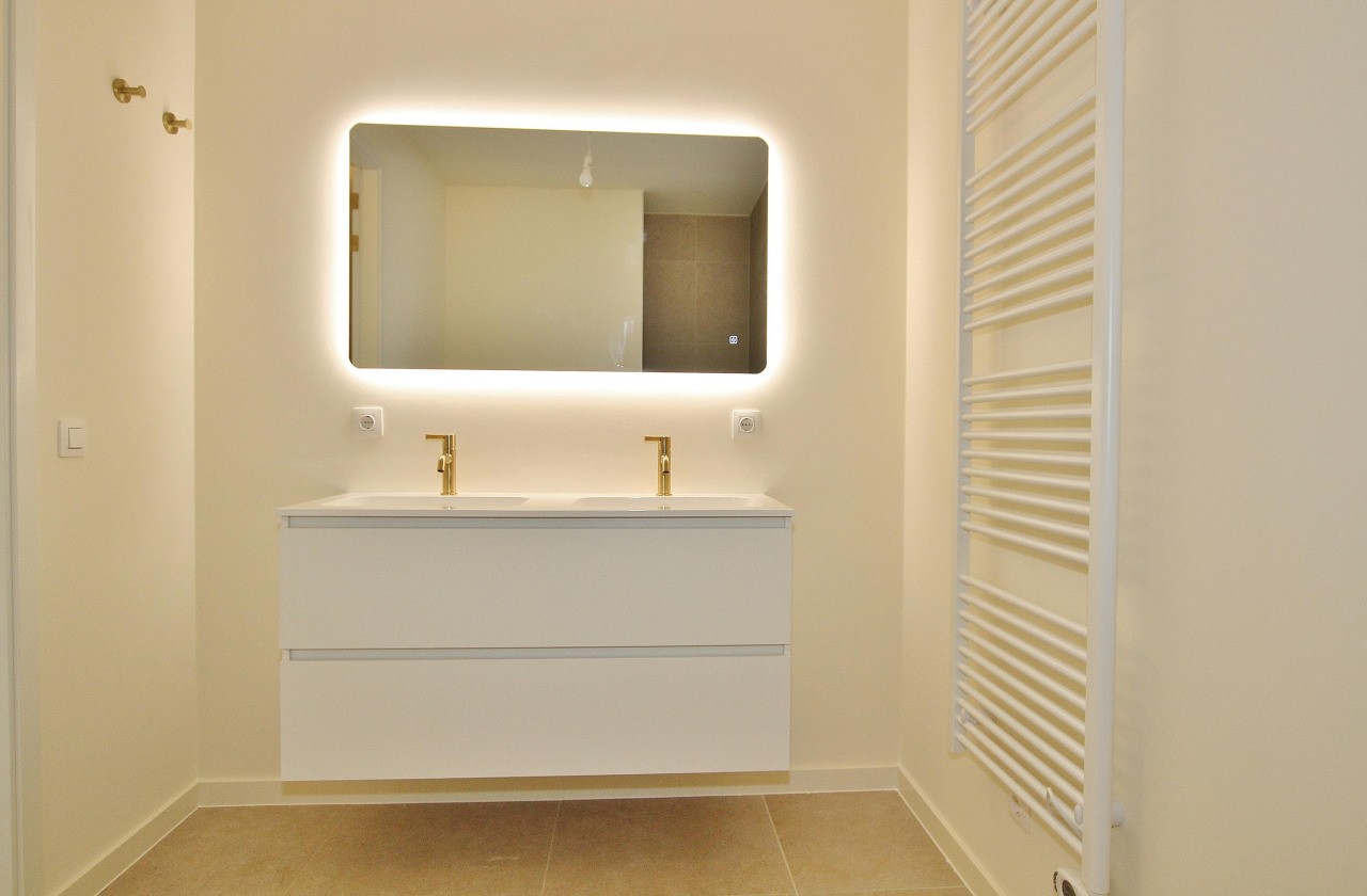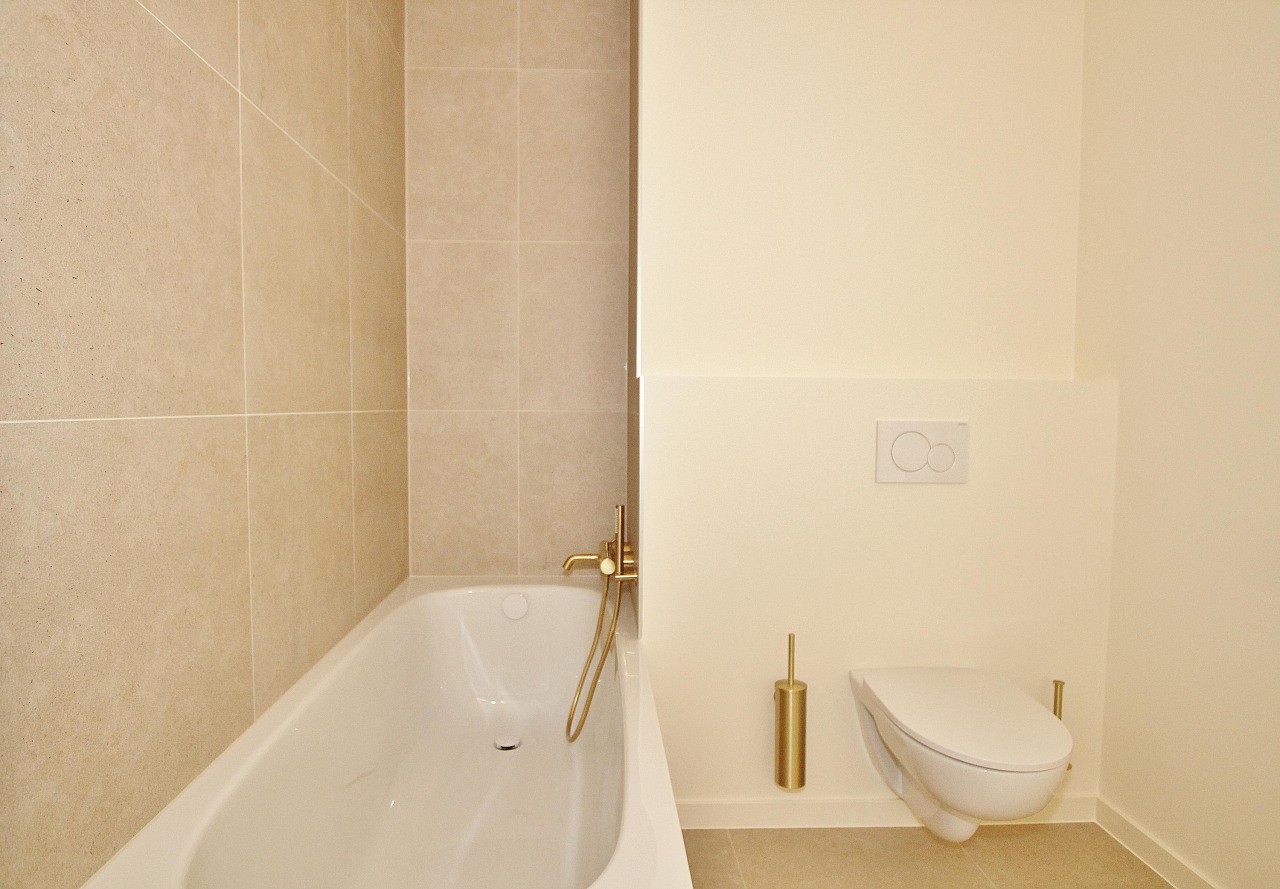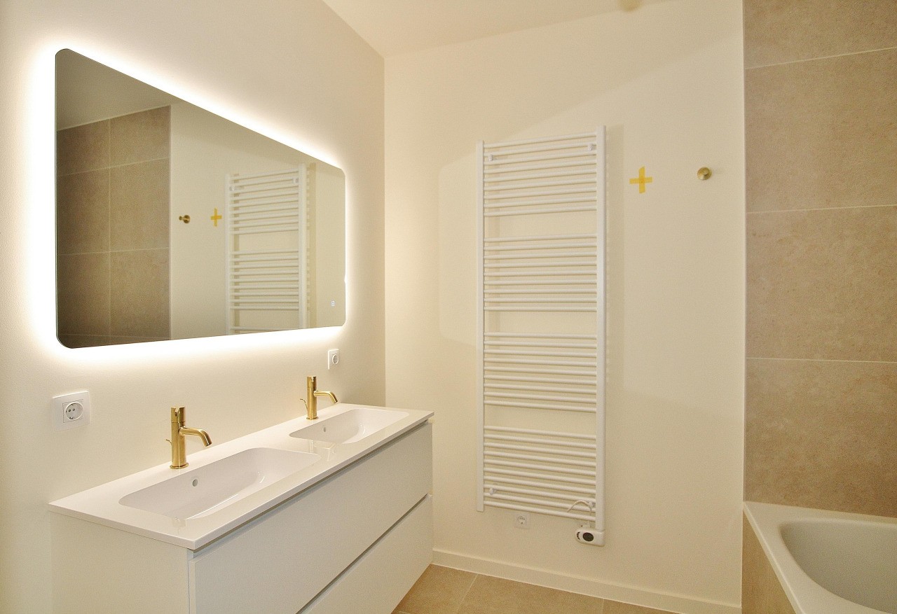 De luxe badkamer, grenzend aan de masterbedroom, is modern afgewerkt en voorzien van een ligbad, een inloopdouche, hangtoilet en een dubbele wastafel met een stijlvol meubel.