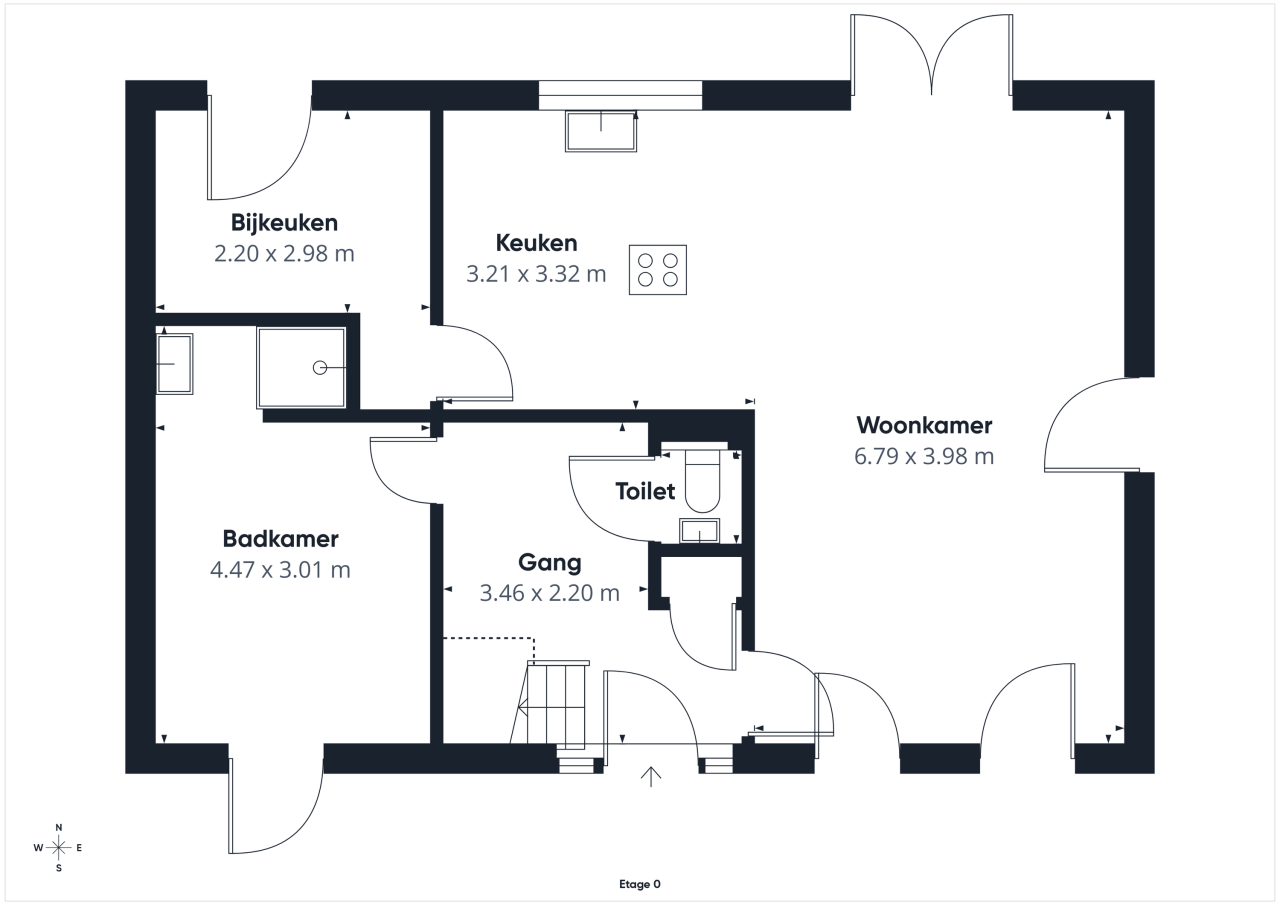 Je komt binnen in een nette hal met meterkast, toilet en trapopgang, die direct een verzorgde eerste indruk geeft. Vanuit hier bereik je de multifunctionele kamer op de begane grond, momenteel ingericht als kantoor, maar zeer geschikt als slaapkamer. De aangrenzende badkamer met douche en wastafel maakt gelijkvloers wonen hier volledig mogelijk.
