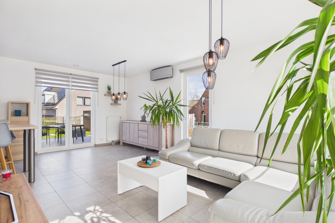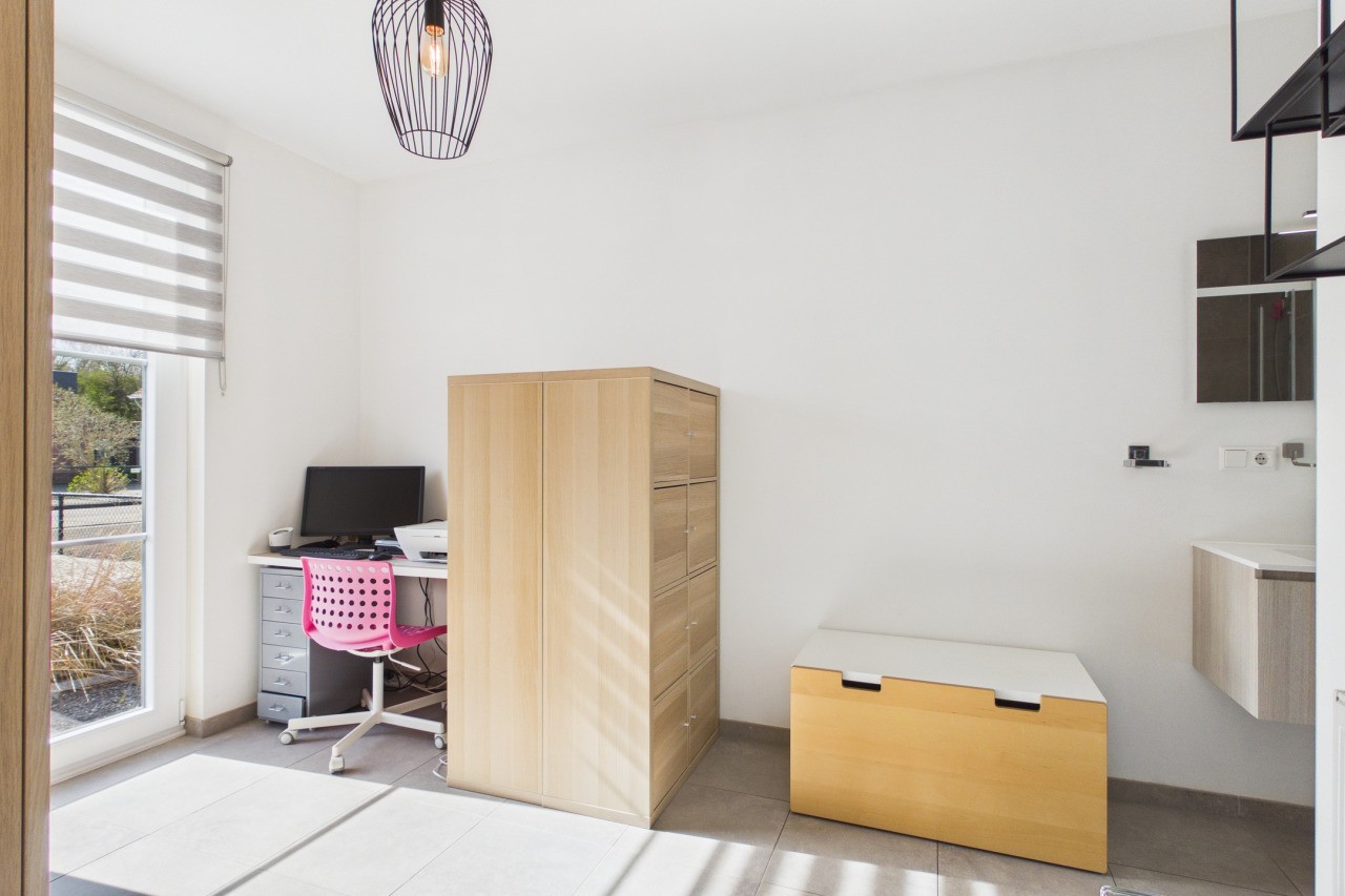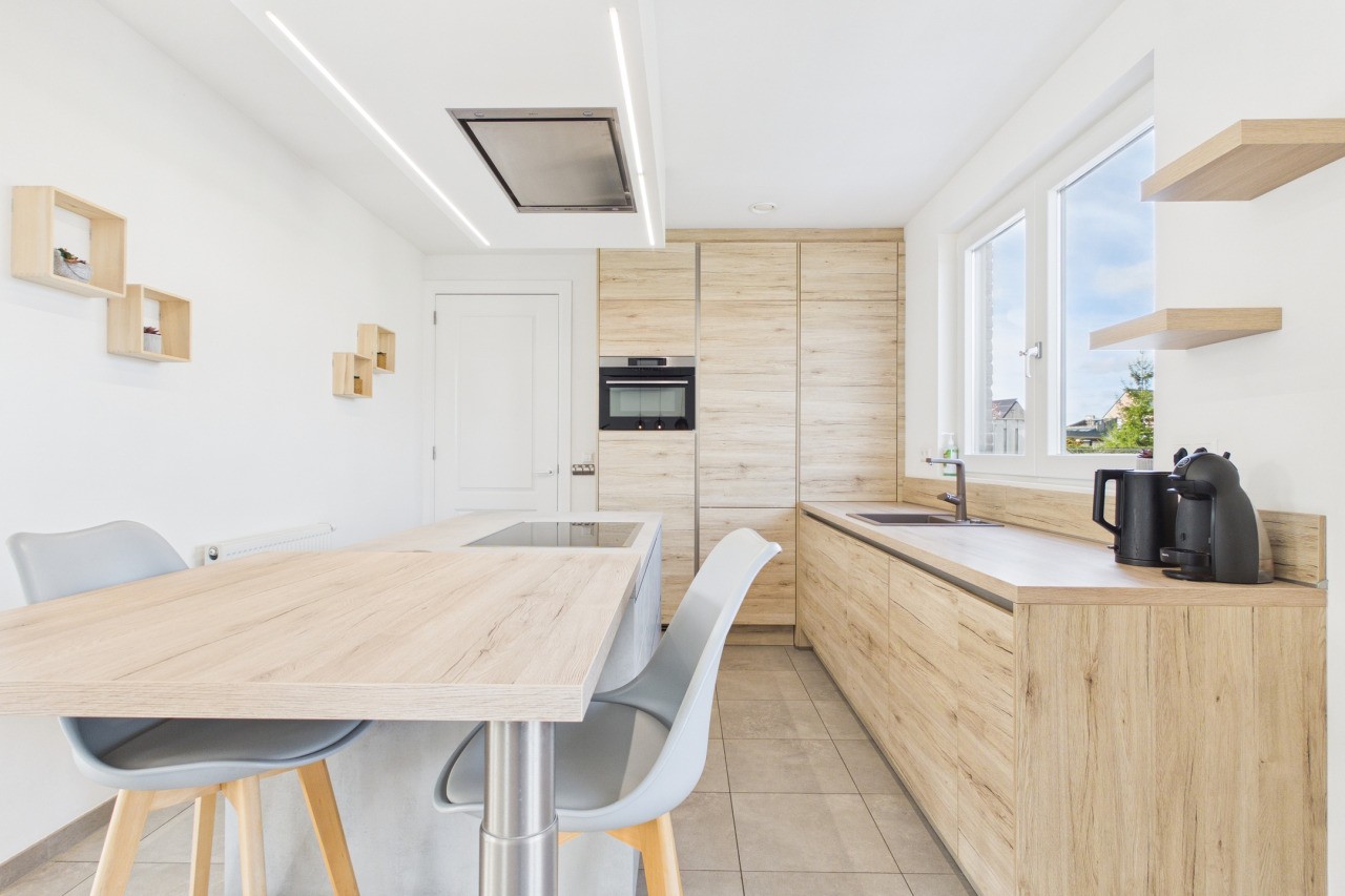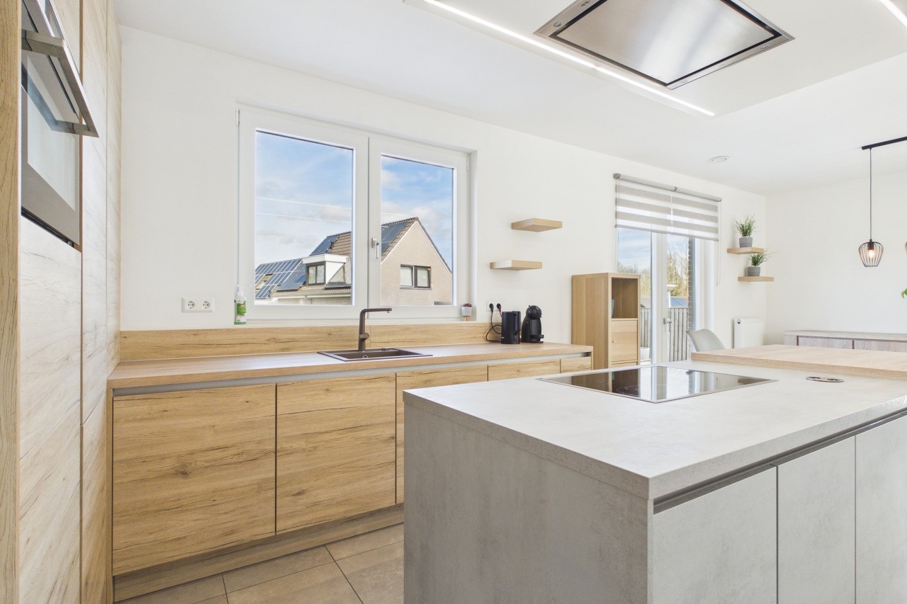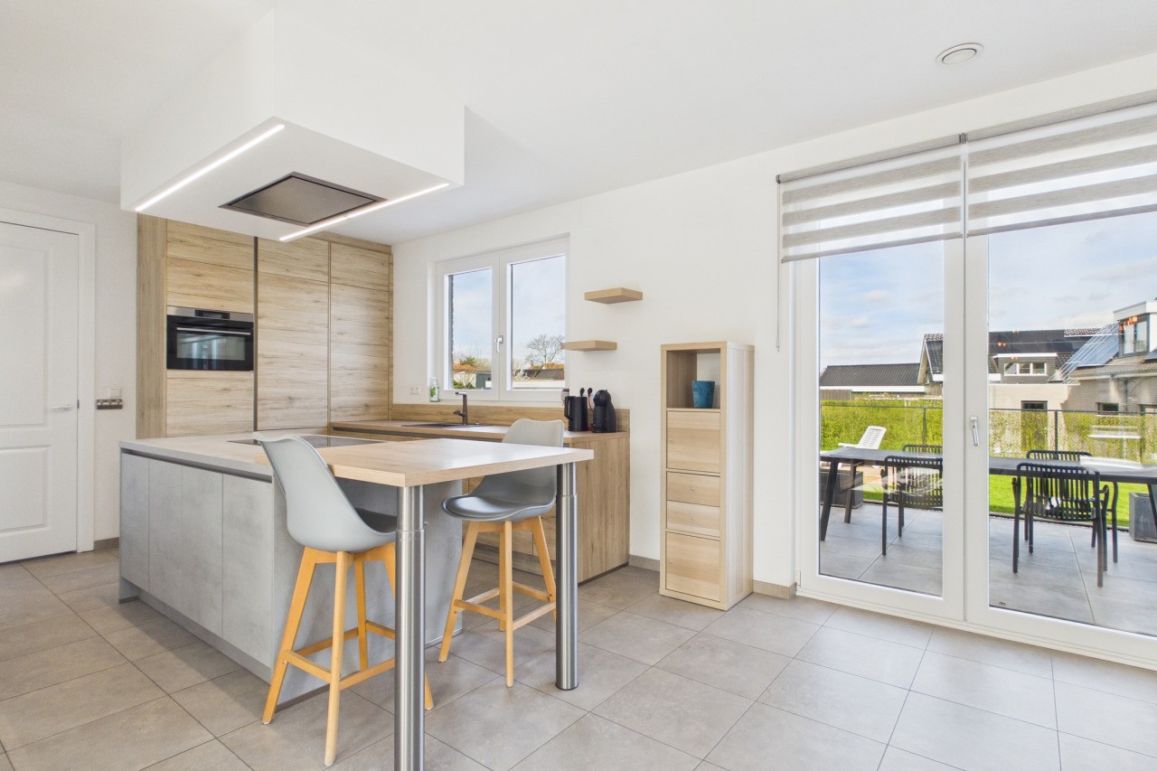 De woonkamer is ruim opgezet in een L-vorm en geniet van veel lichtinval, wat zorgt voor een aangename en open sfeer. Via de dubbele deuren sta je in direct contact met de tuin, waardoor binnen en buiten mooi in elkaar overlopen. De moderne keuken is uitgevoerd in een hoekopstelling met kookeiland en voorzien van diverse inbouwapparatuur. Aansluitend vind je de praktische bijkeuken met witgoedaansluitingen en de technische installaties, evenals een extra doorgang naar de tuin.