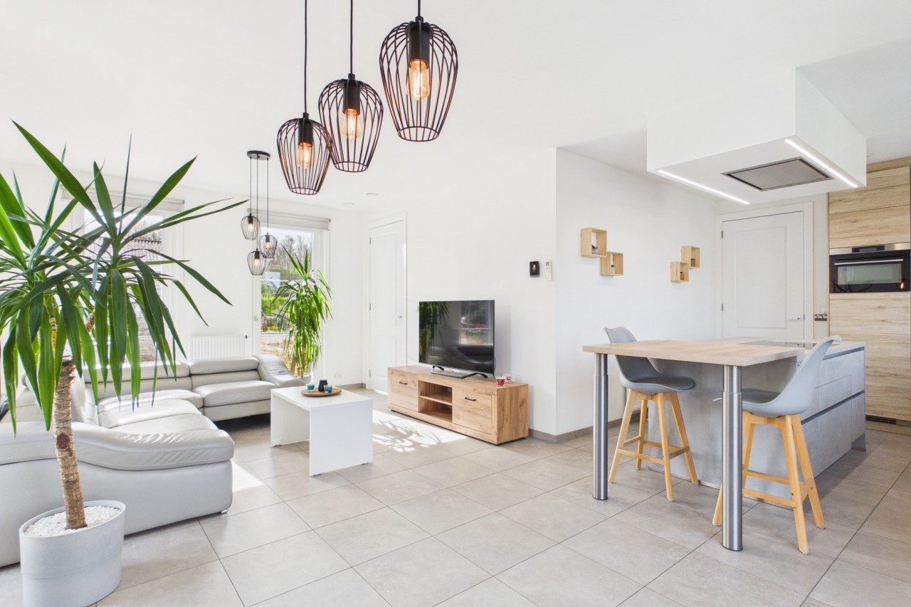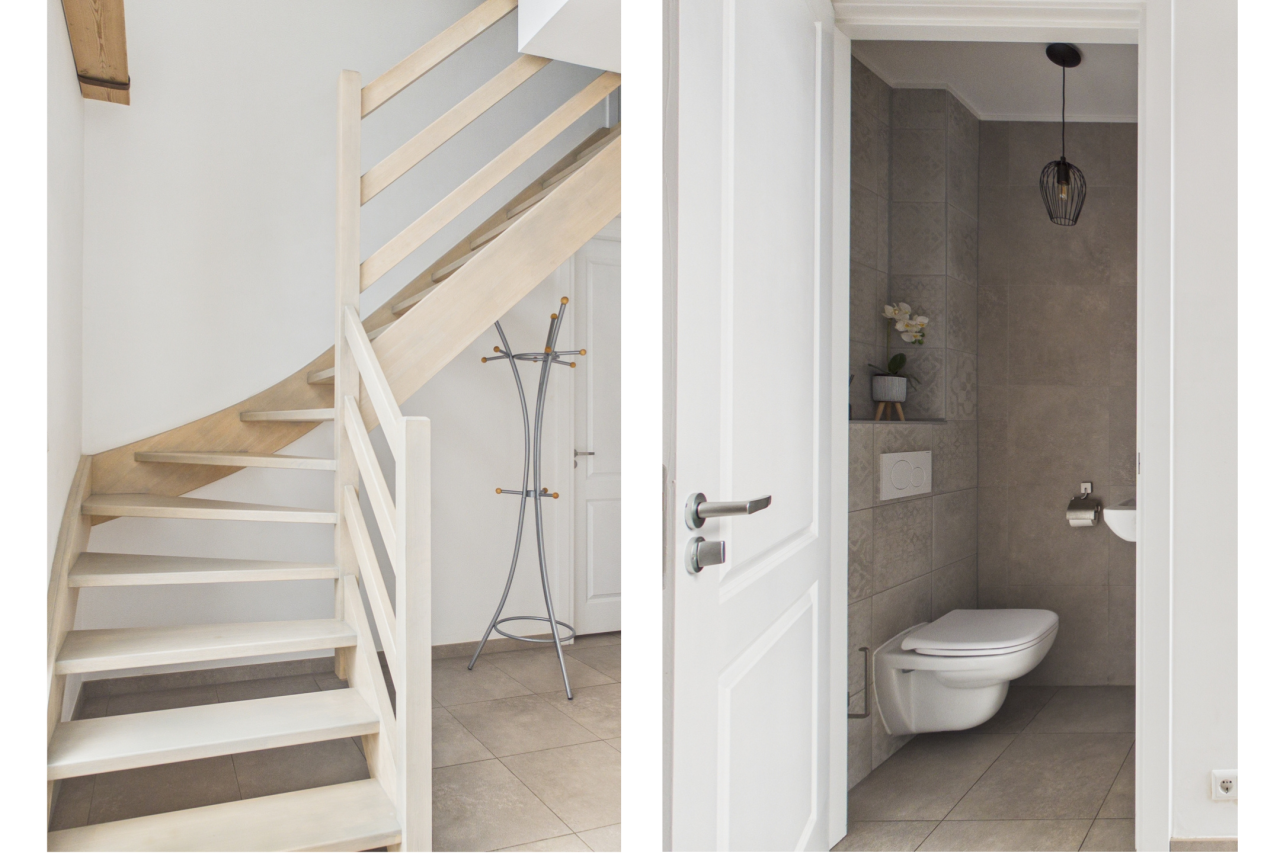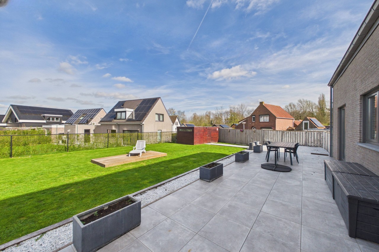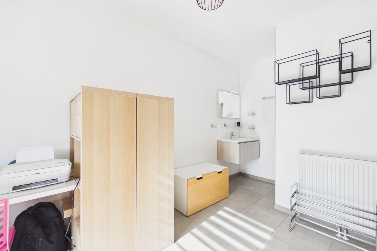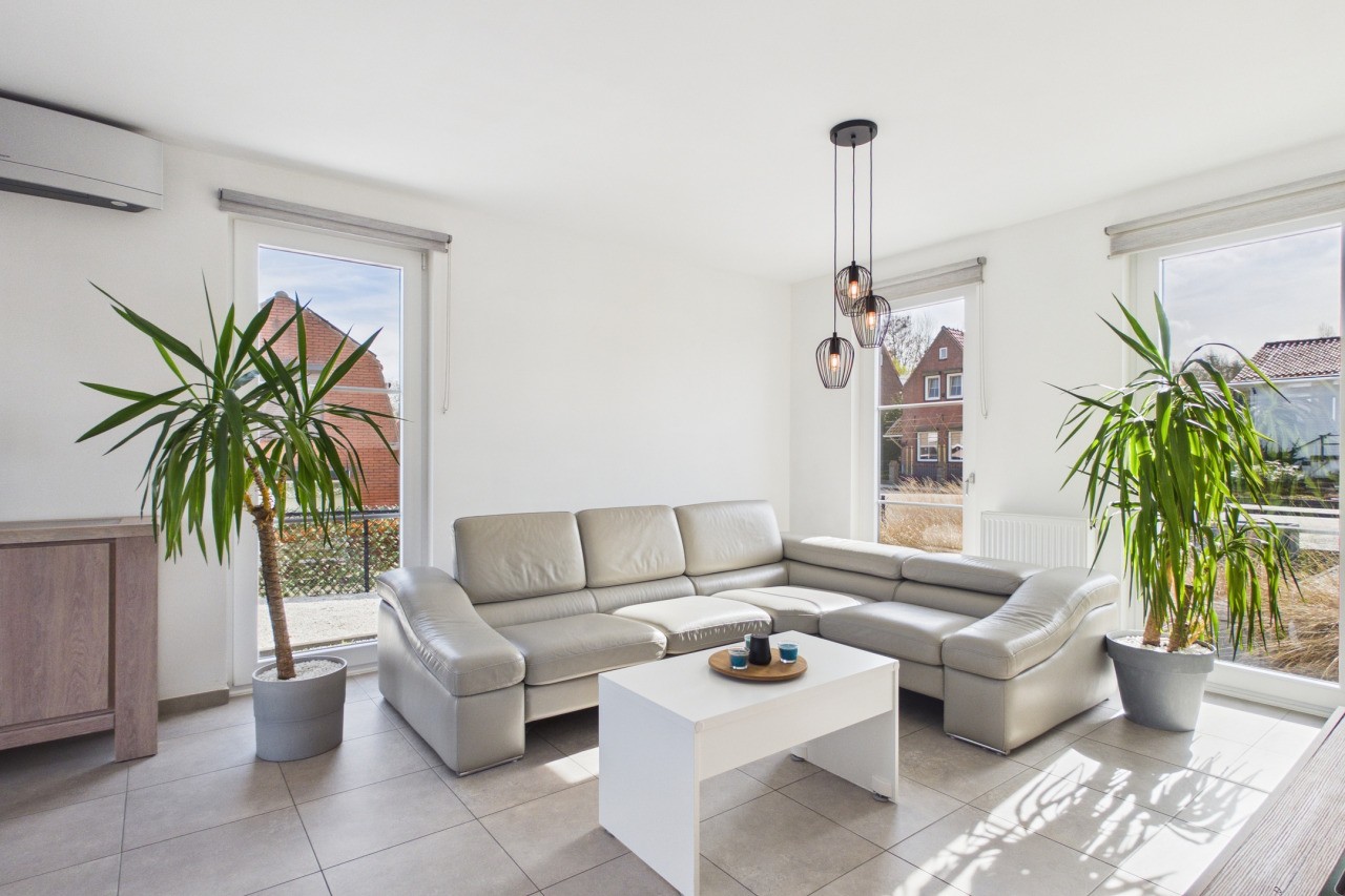 De woonkamer is ruim opgezet in een L-vorm en geniet van veel lichtinval, wat zorgt voor een aangename en open sfeer. Via de dubbele deuren sta je in direct contact met de tuin, waardoor binnen en buiten mooi in elkaar overlopen. De moderne keuken is uitgevoerd in een hoekopstelling met kookeiland en voorzien van diverse inbouwapparatuur. Aansluitend vind je de praktische bijkeuken met witgoedaansluitingen en de technische installaties, evenals een extra doorgang naar de tuin.