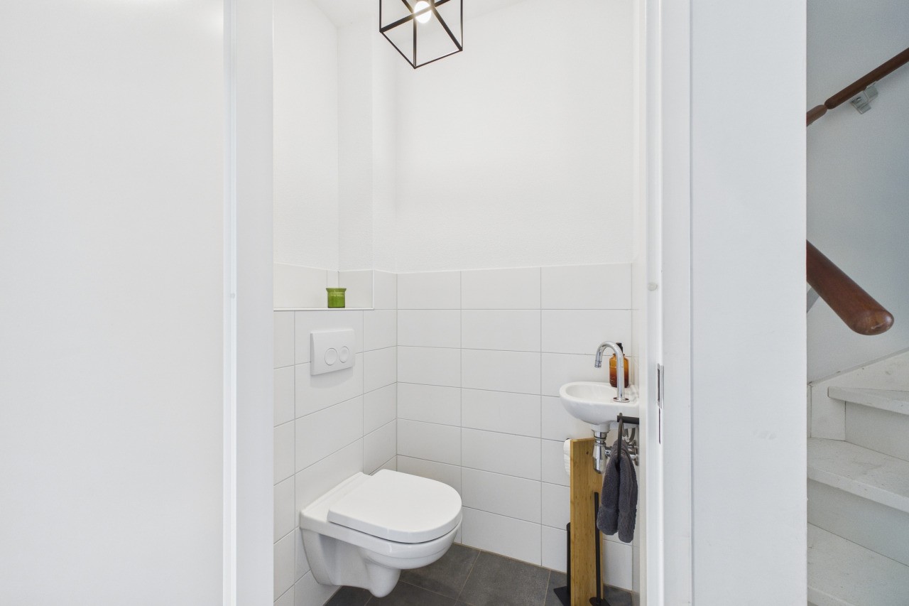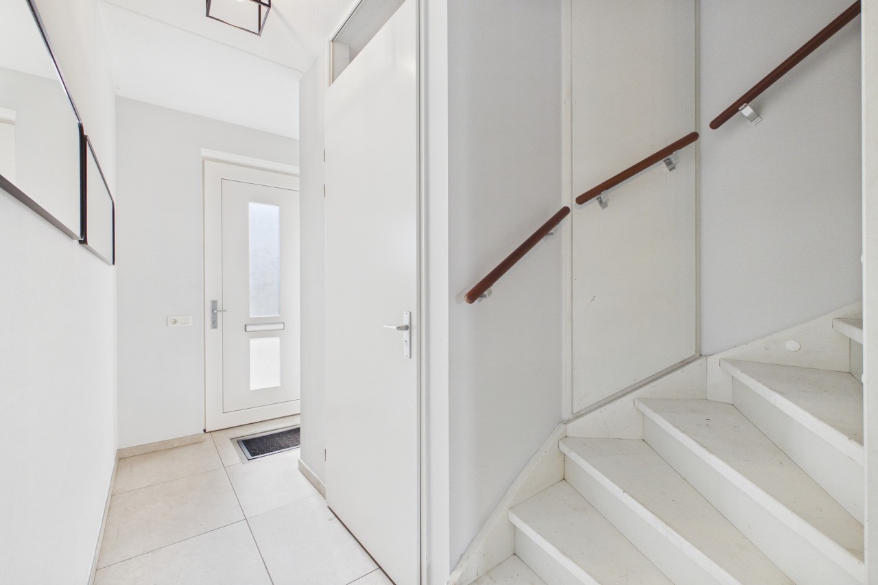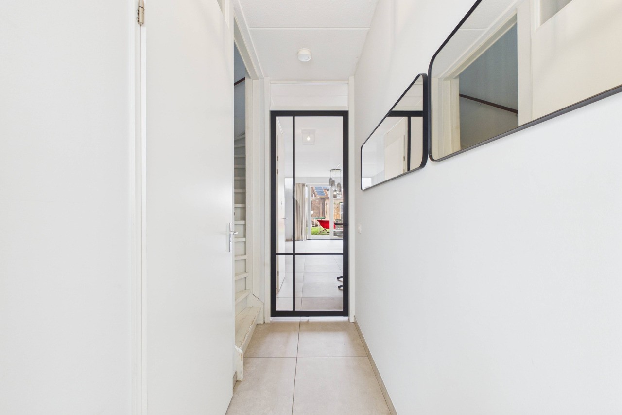 Bij binnenkomst kom je in een verzorgde hal met meterkast, een modern toilet met fonteintje en de trapopgang naar de eerste verdieping. Via een stijlvolle glazen deur stap je de woonkamer binnen, waar direct de prettige lichtinval en ruimtelijkheid opvallen. De royale leefruimte biedt alle mogelijkheden voor een comfortabele zithoek en een grote eettafel. Onder de trap bevindt zich een praktische provisiekast.