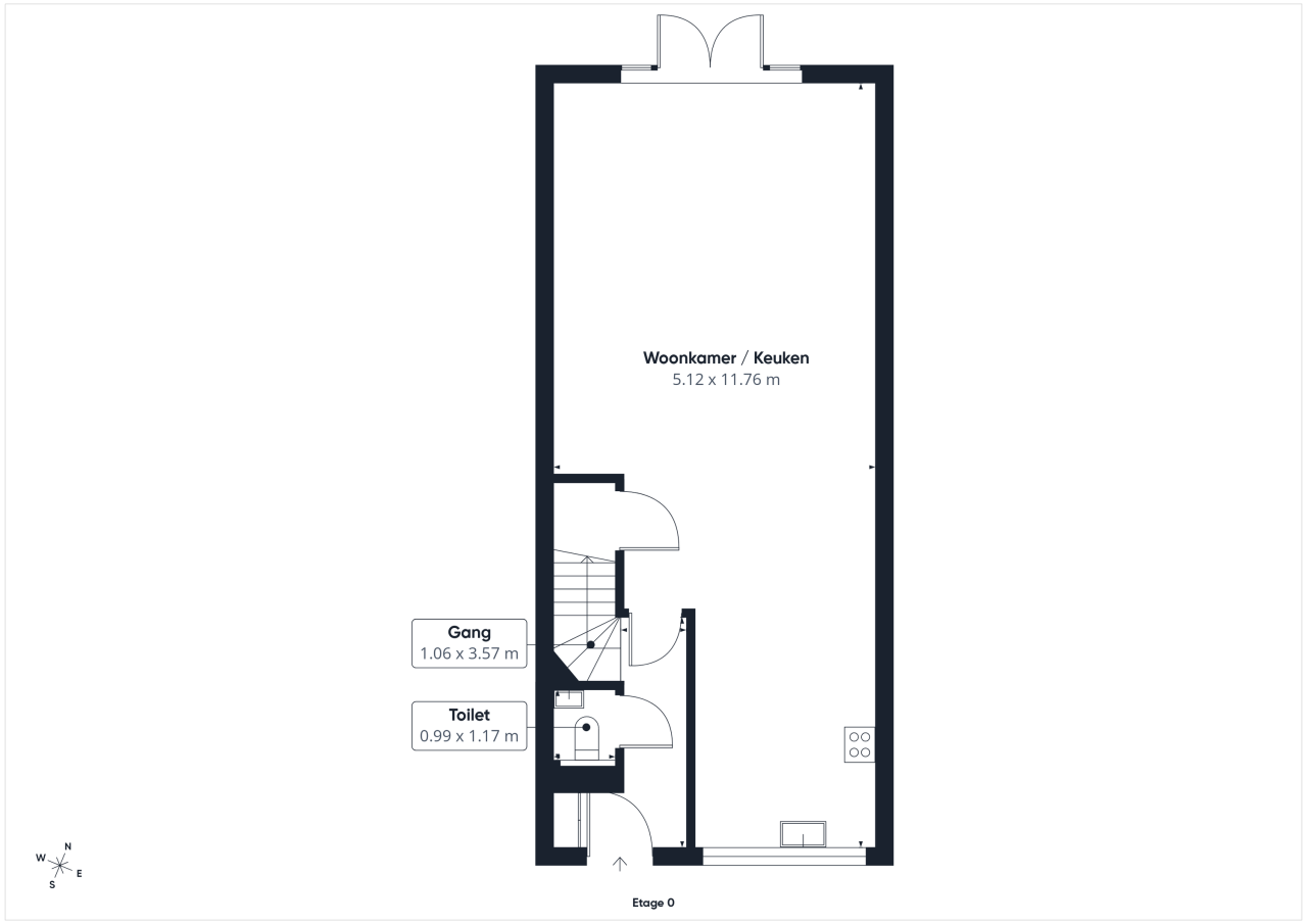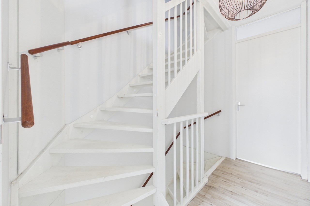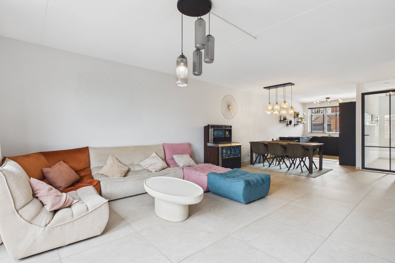 Bij binnenkomst kom je in een verzorgde hal met meterkast, een modern toilet met fonteintje en de trapopgang naar de eerste verdieping. Via een stijlvolle glazen deur stap je de woonkamer binnen, waar direct de prettige lichtinval en ruimtelijkheid opvallen. De royale leefruimte biedt alle mogelijkheden voor een comfortabele zithoek en een grote eettafel. Onder de trap bevindt zich een praktische provisiekast.