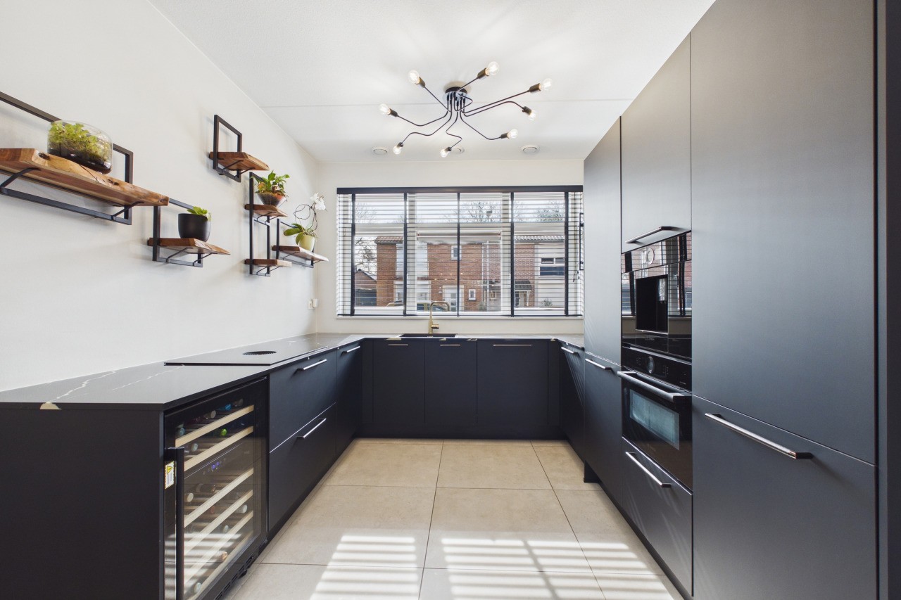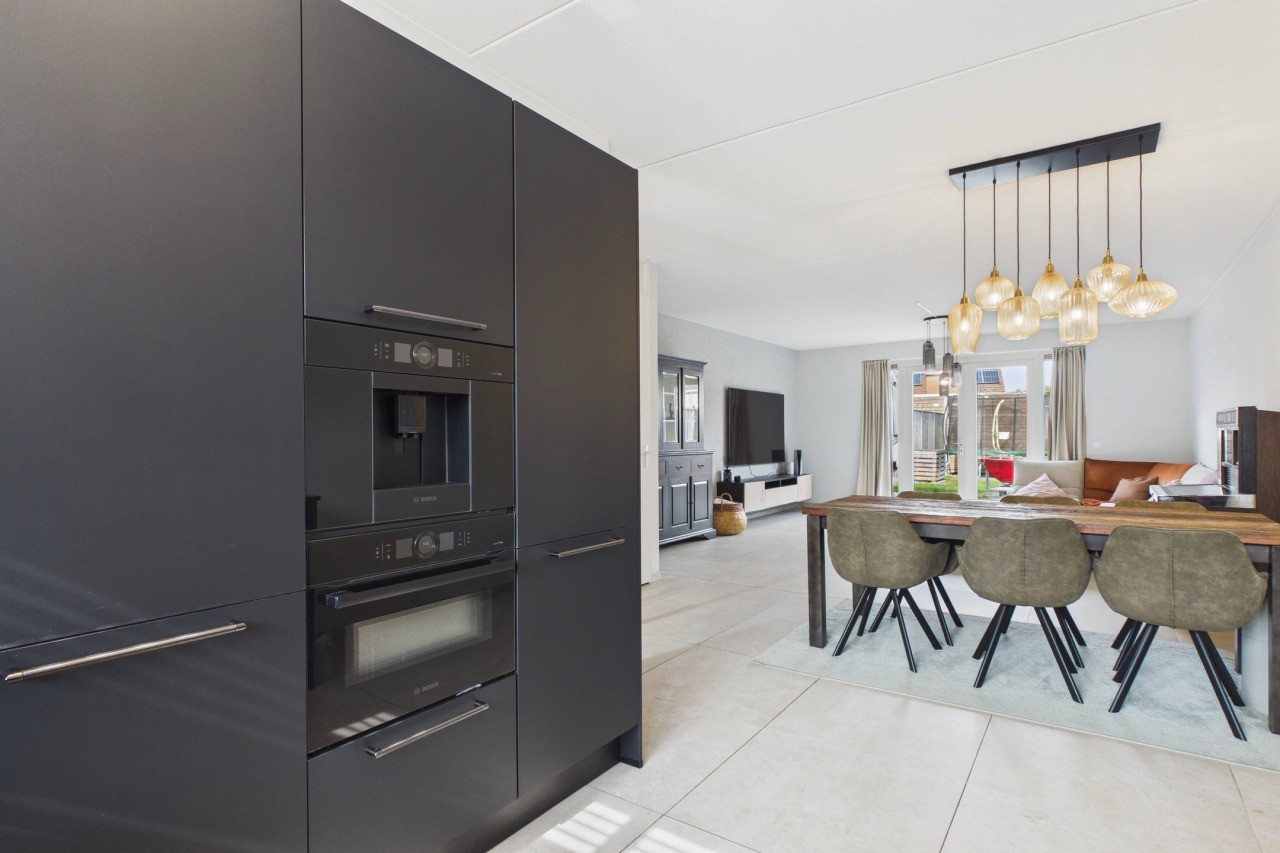 Aan de voorzijde van de woning ligt de luxe open keuken, uitgevoerd in een moderne zwarte kleurstelling. Het natuurstenen werkblad en de hoogwaardige inbouwapparatuur – waaronder een Bora-kookplaat met geïntegreerde afzuiging, een koelkast en vriezer, wijnkoeler, oven en magnetron – maken dit tot een fijne plek voor kookliefhebbers. Aan de achterzijde zorgen openslaande deuren voor een mooie verbinding met de tuin.