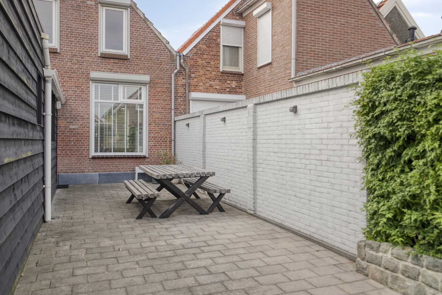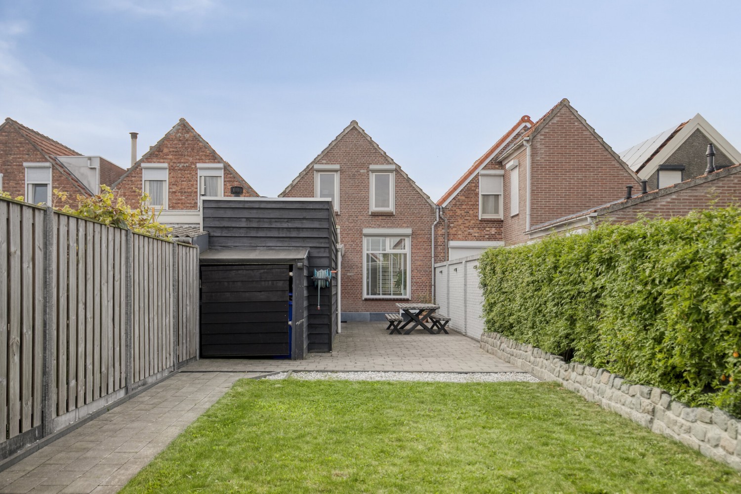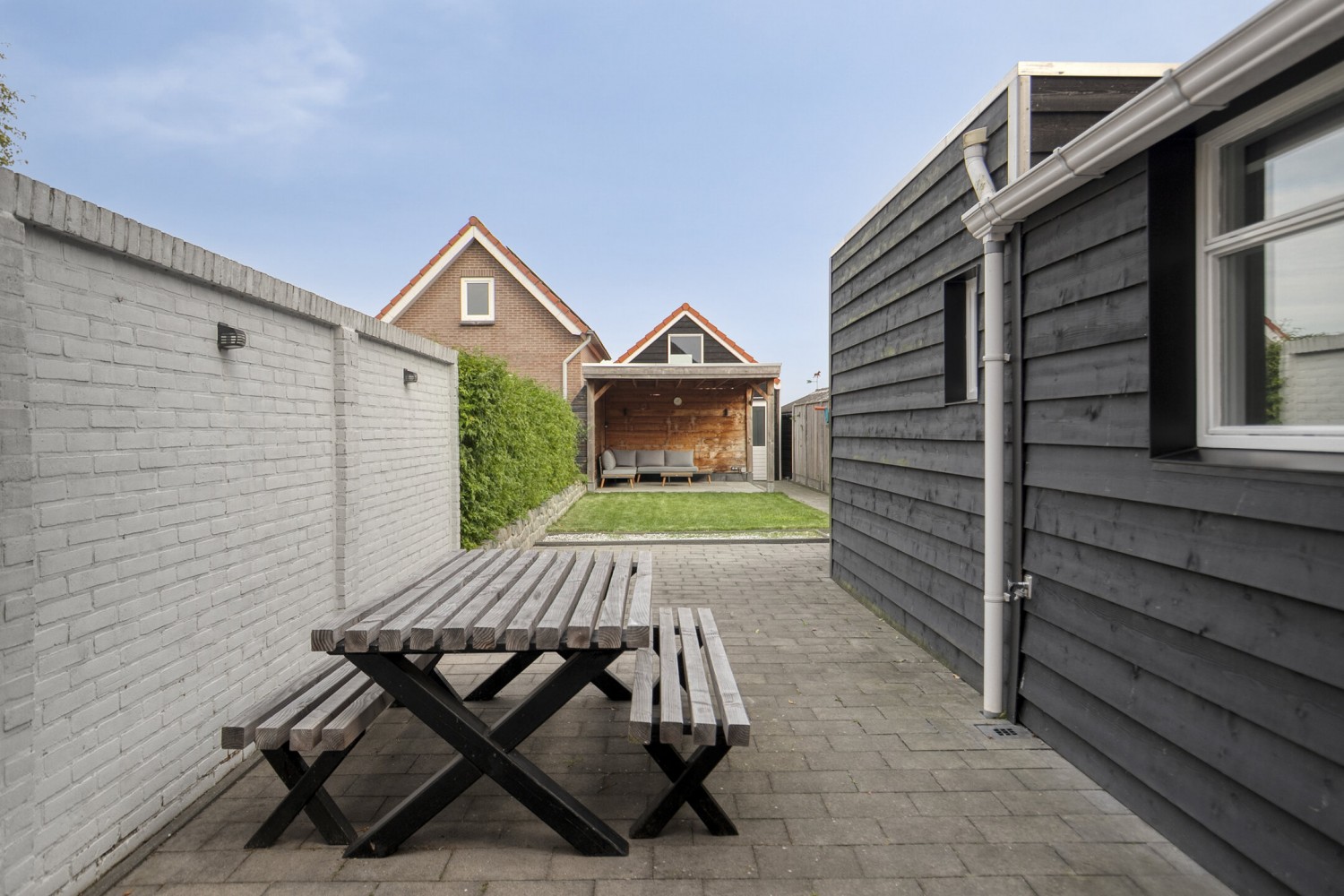 De achtertuin is verrassend diep en ligt op het oosten, waardoor je er al vroeg van de zon kunt genieten. Het nette gazon, het fijne terras met overkapping en de vrije achterom maken het tot een heerlijke plek om buiten te zijn. Achterin de tuin staat een ruime garage met voldoende plaats voor een auto, fietsen en (tuin)gereedschap.