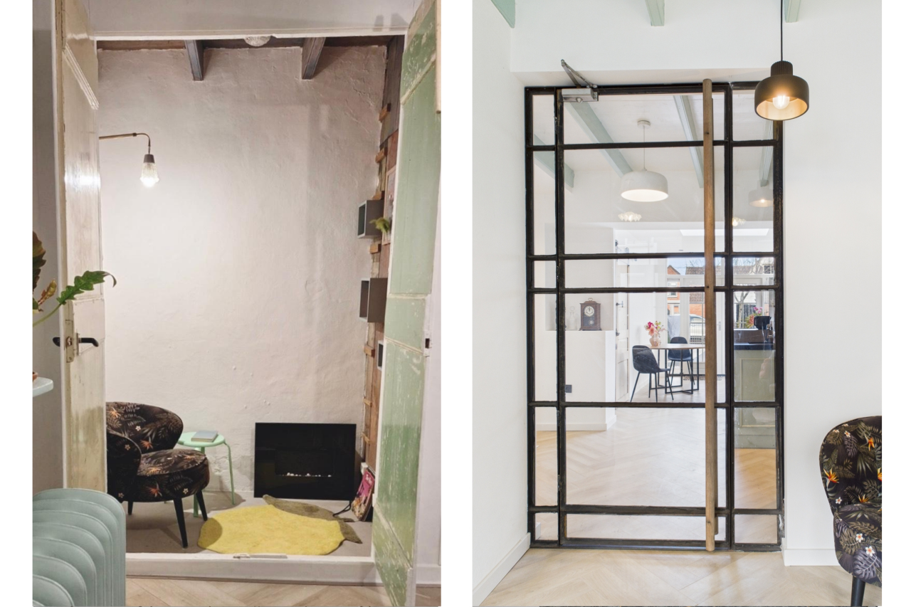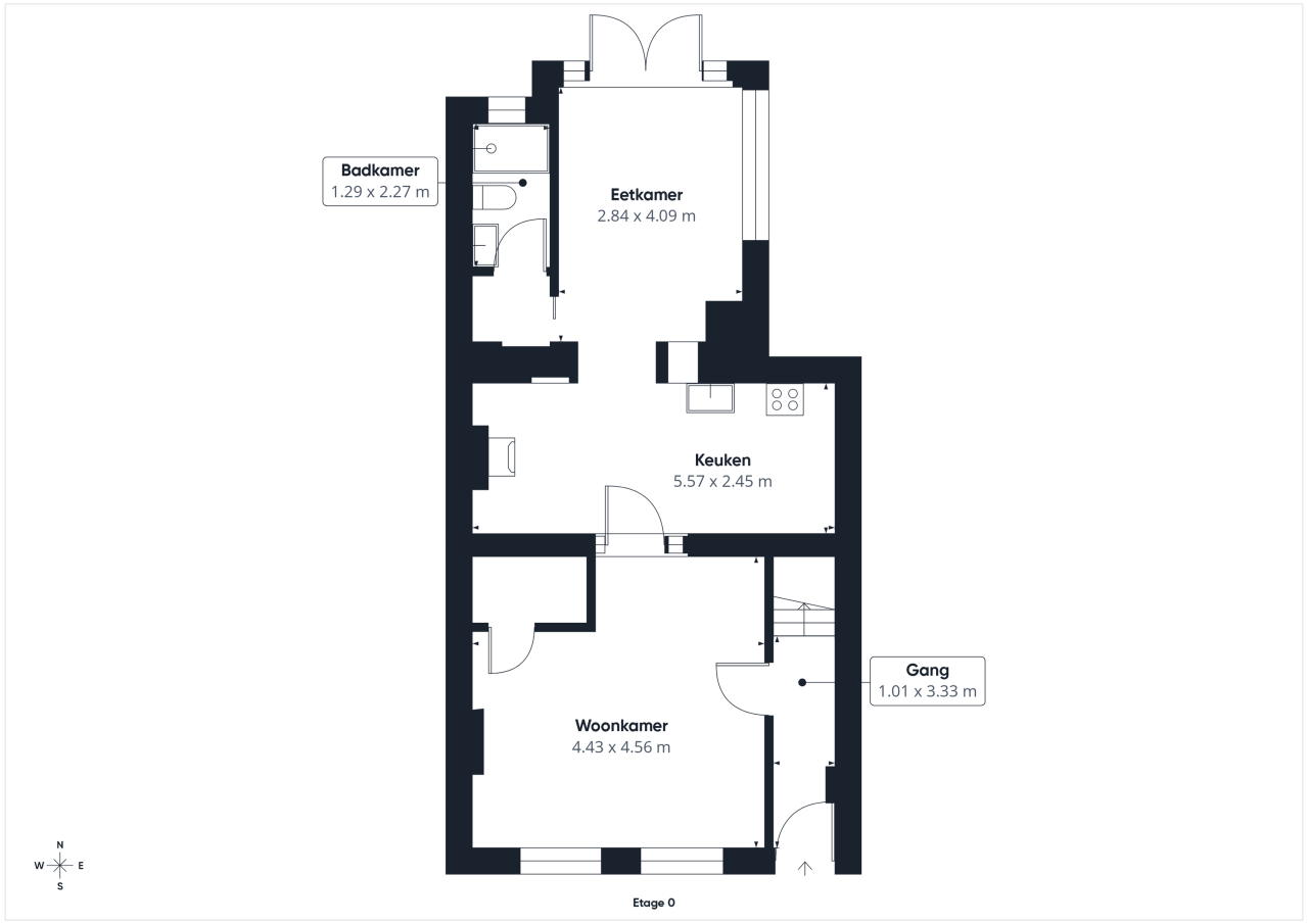 Bij binnenkomst in de hal word je verwelkomd door de trap naar de verdieping en de doorgang naar de woonkamer. Aan de voorzijde ligt de sfeervolle woonkamer met een vaste provisiekast die extra opbergruimte biedt, terwijl de vernieuwde keuken met houtkachel het hart van de woning vormt. De keuken is uitgerust met inbouwapparatuur en loopt over in de eetkamer, waar dubbele deuren rechtstreeks toegang geven tot de achtertuin. Aansluitend bevindt zich de compacte, in 2025 vernieuwde badkamer met douche, toilet en wastafel.