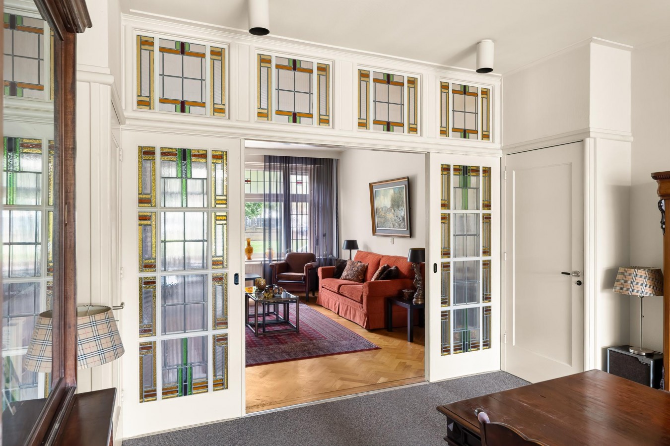 Woonkamer: De royale woonkamer “en-suite” is licht en ruim, met grote ramen die uitkijken op het dorpsplein en aan de achterzijde op de tuin. De stijlvolle afwerking met deels visgraat-parket, hoge plafonds, paneeldeuren en prachtig glas-in-loodwerk benadrukken de grandeur van de woning. Hier vindt u voldoende ruimte voor zowel een zit- als een eetgedeelte, perfect voor gezellige familieavonden en formele diners.