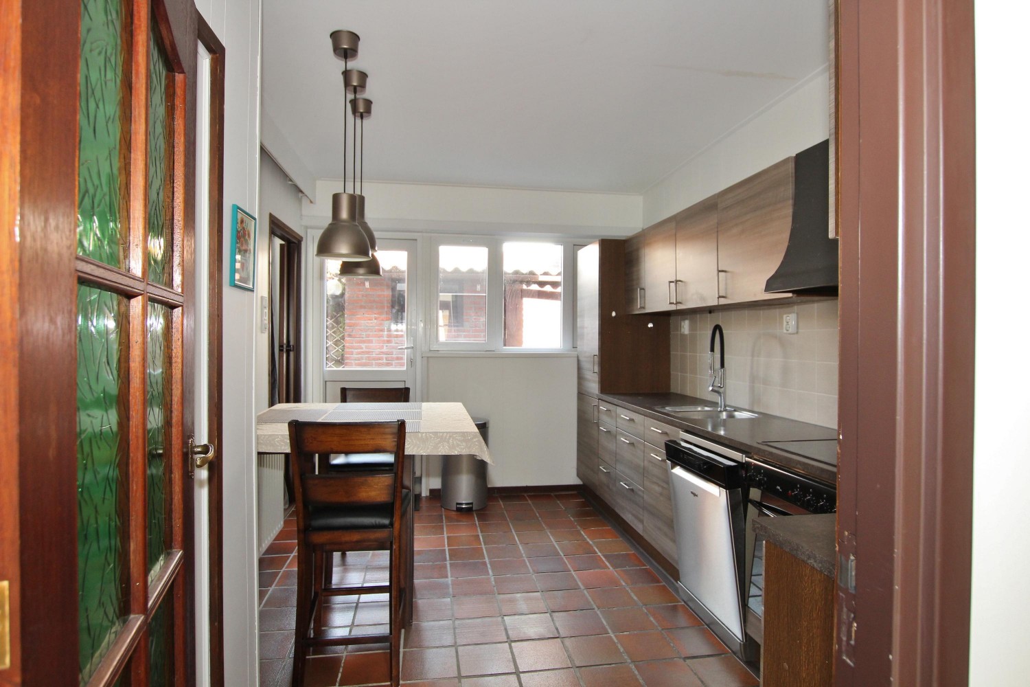 De dichte keuken (ca. 6,90 x 2,50 m) beschikt over diverse inbouwapparatuur: koel-/vriescombinatie, oven, elektrische kookplaat, afzuigkap en close-in boiler.
