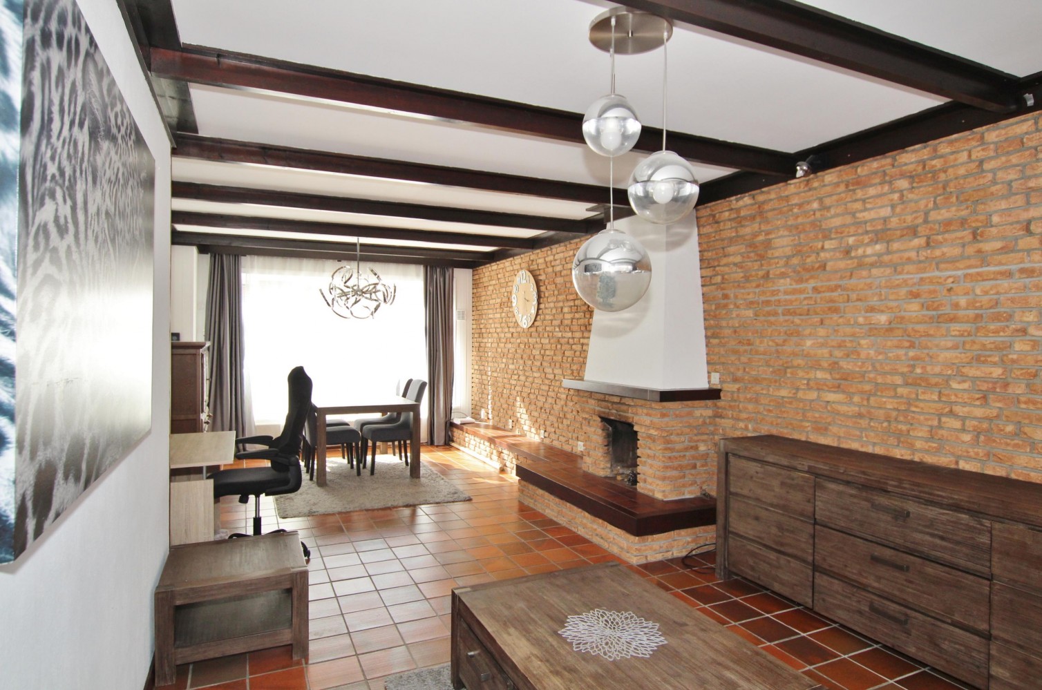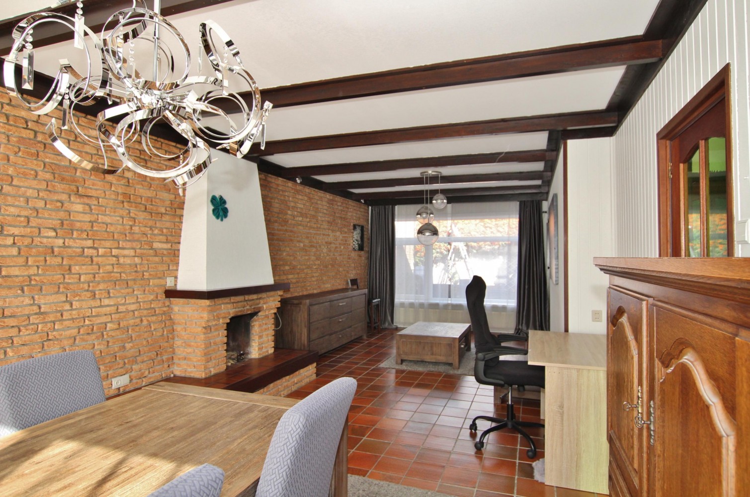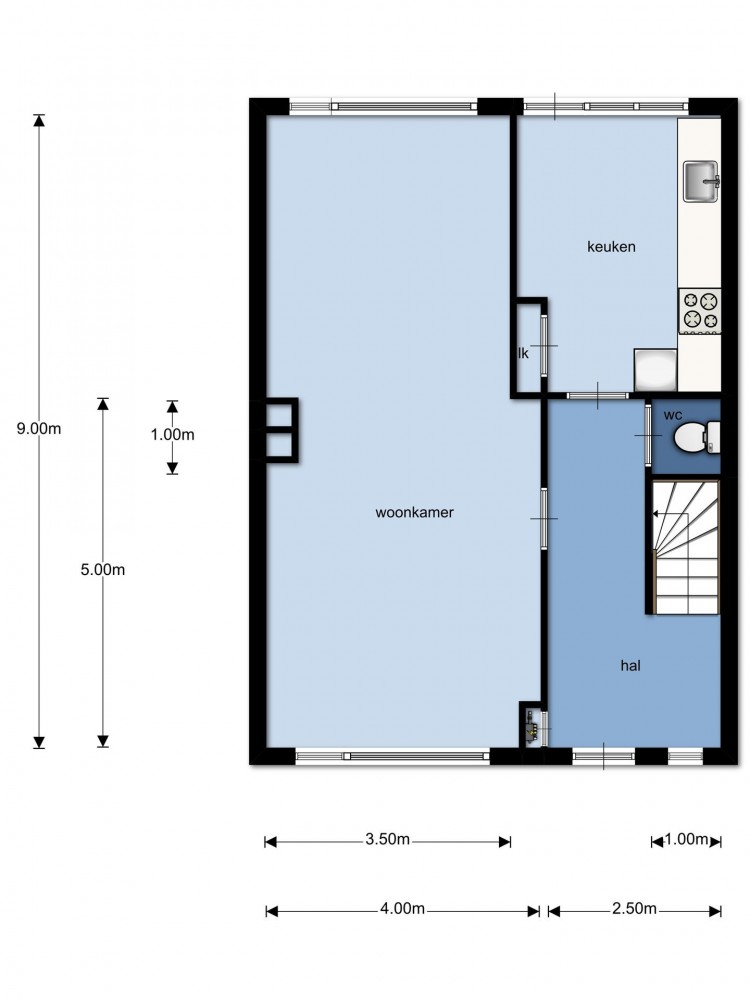Via de hal met tegelvloer bereik je de kelderkast, meterkast, het toilet en de trap naar de verdieping. De ruime woonkamer (ca. 9,00 x 4,00 m) is voorzien van een tegelvloer, schouw met gasaansluiting en rolluiken.